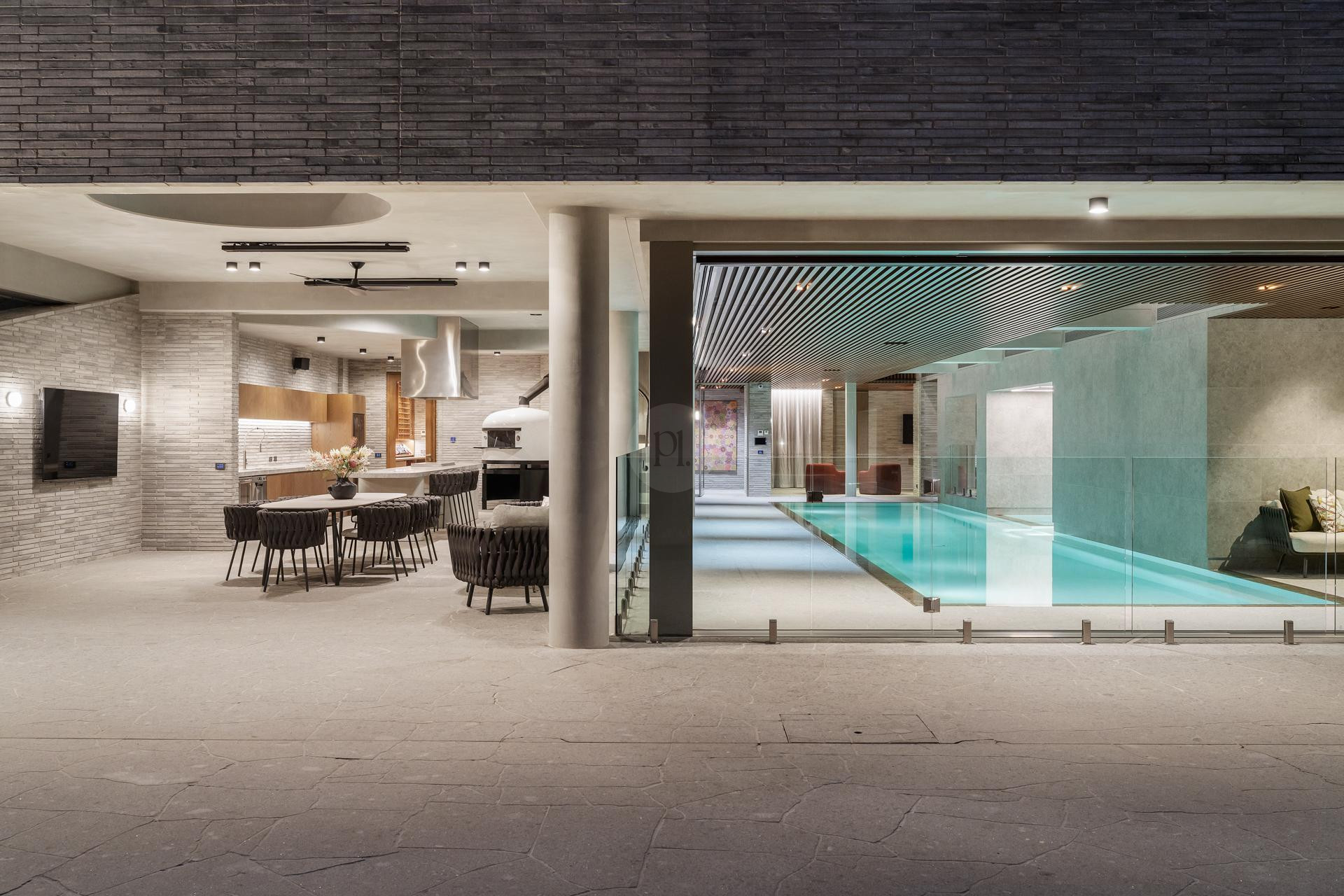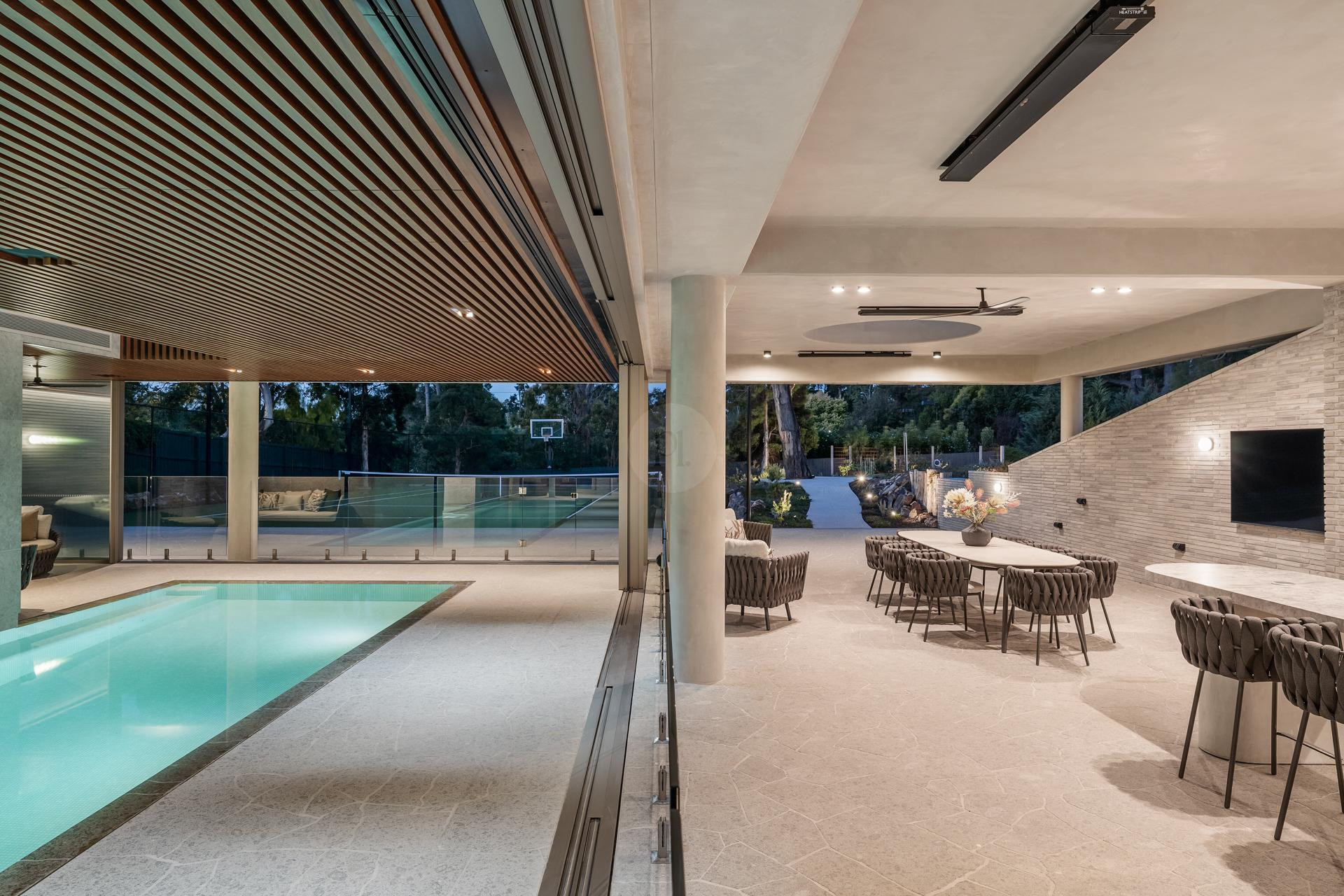 Maestro boasts an impressive array of features including a tennis court, a luxurious pool, and a relaxing spa/jacuzzi, ensuring that every angle offers something special. The outdoor living areas, complete with a BBQ zone, outdoor kitchen, and courtyard, provide ample space for creative expression. Inside, the sophisticated design includes spacious living and dining areas, complemented by a contemporary kitchen that is a dream for any culinary shoot.