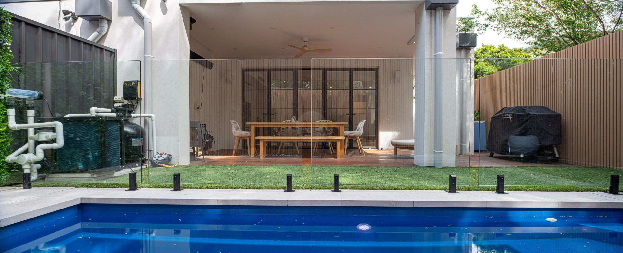 Practical features such as the driveway, garage, EV charger, verandah, and BBQ area enhance the home’s usability for production crews, while the heated pool and outdoor living spaces add sophistication and visual appeal.
