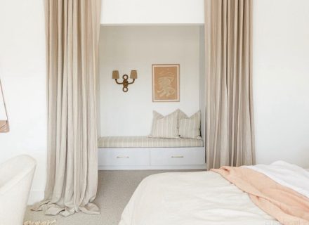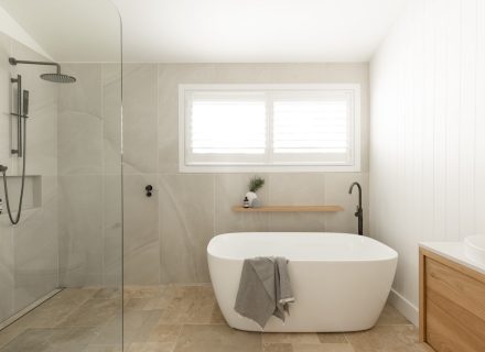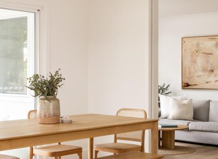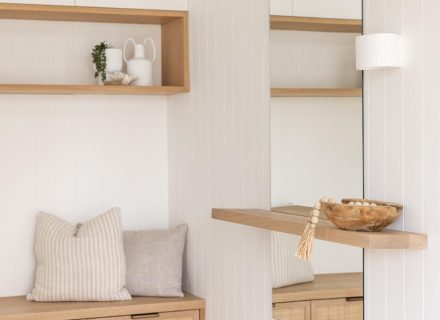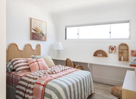 Mascarpone boasts multiple bedrooms and bathrooms, with subtle pops of colour in tile and paint choices; from the yellow children’s bedroom, to the pink bathroom wall tile selections. The outdoor living area is also an adaptable shoot space, complete with a luxurious pool and backyard, alongside an undercover, timber BBQ area. Surrounded by manicured gardens and meandering pathways, this property offers a serene environment that complements its contemporary design.