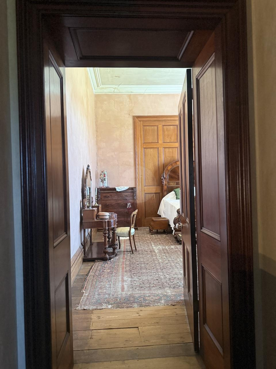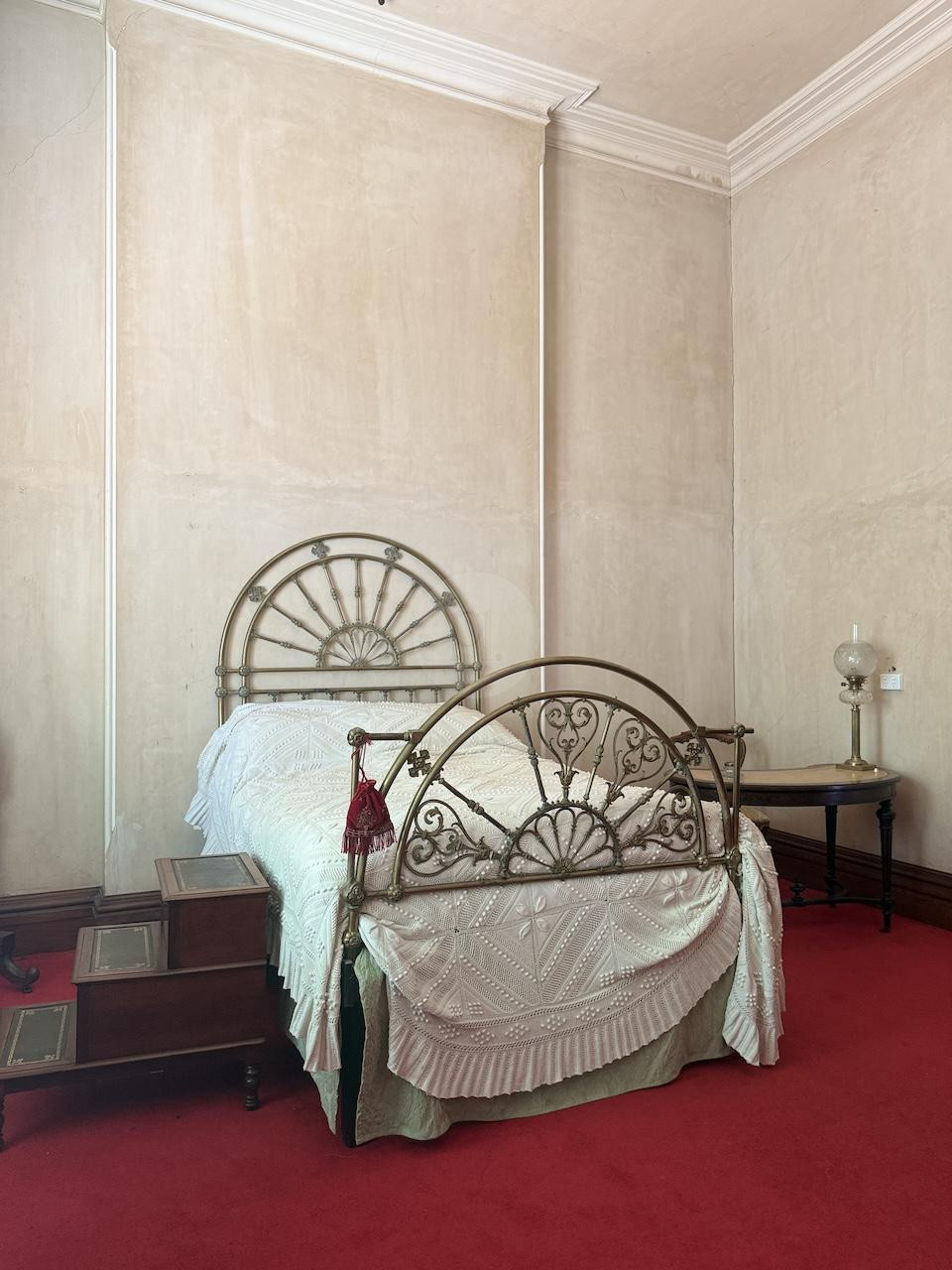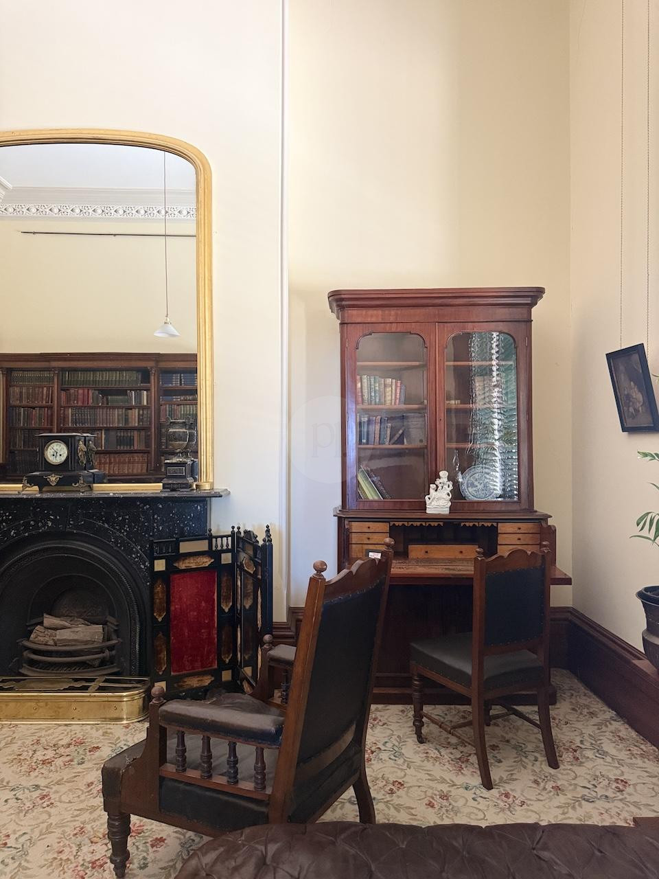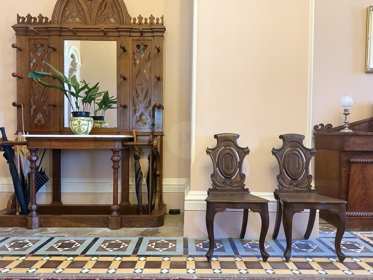 Crafted from locally sourced basalt, the expansive 42-room mansion showcases a striking blend of heritage architecture and vintage interiors. The dramatic entrance hall features ornate detailing and a bifurcated imperial timber staircase, setting an immediate sense of scale and elegance. Throughout the home, beautifully styled bedrooms and formal living spaces are furnished with period pieces, layered textures and architectural detail, offering endless visual variety for photographers, brand managers and production teams seeking a distinctive filming location.