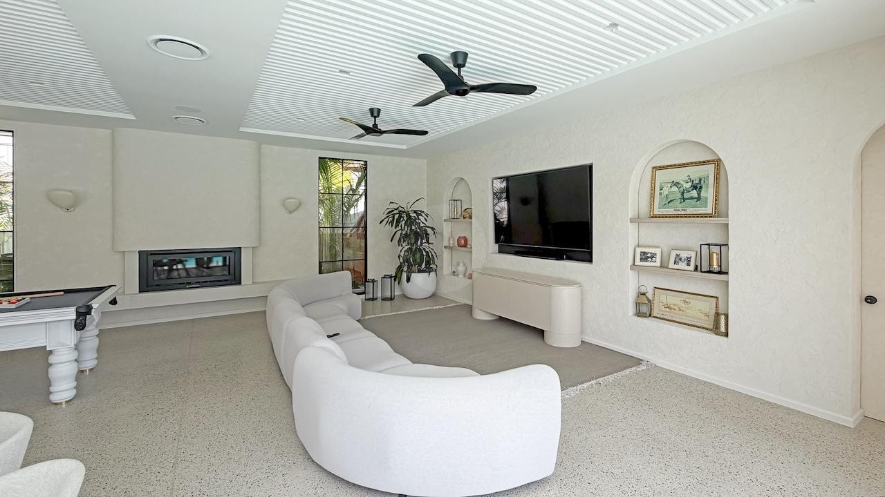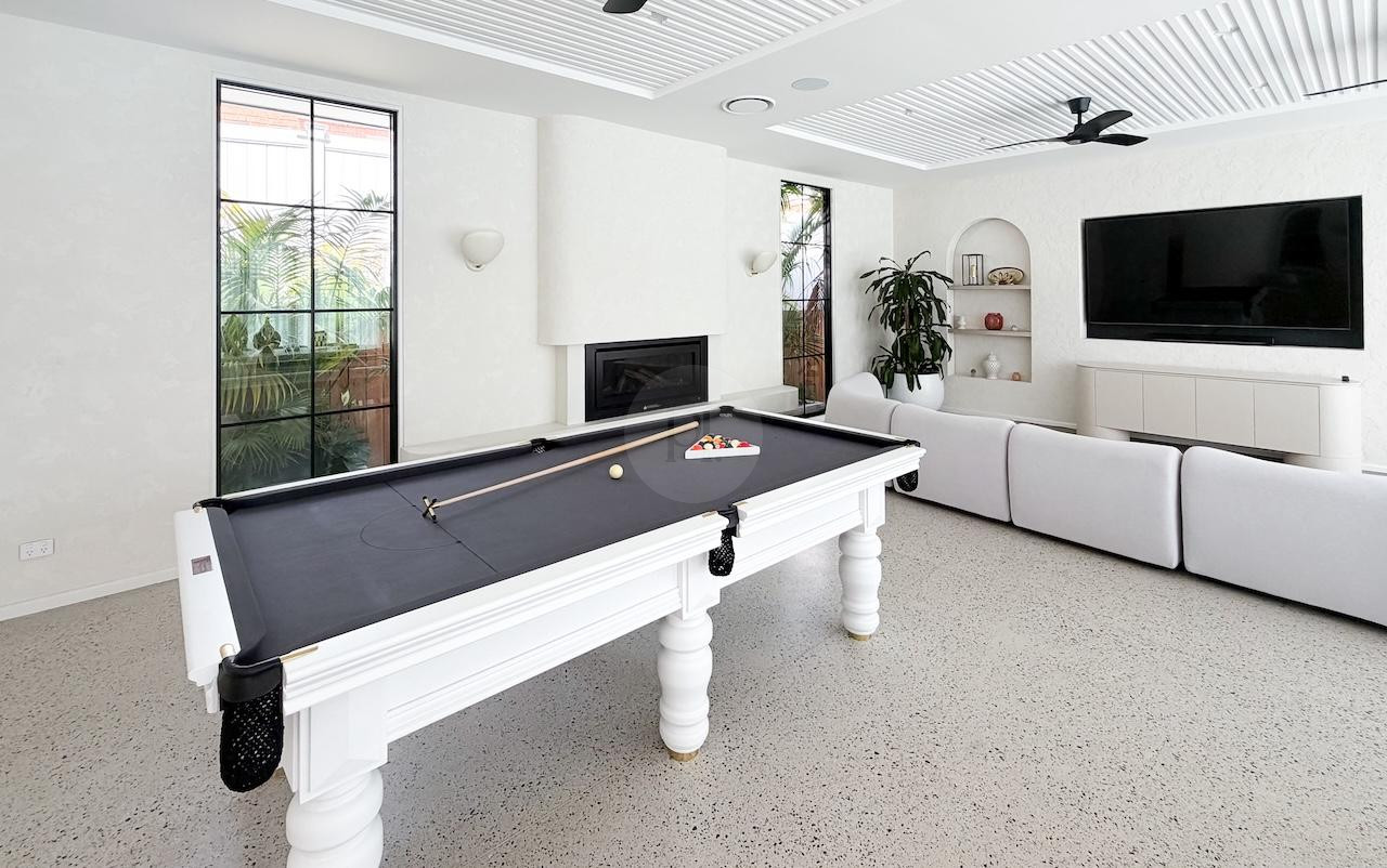The beautifully designed pool house serves as a self-contained, elevated shooting space, featuring it’s own kitchen with statement oven + range hood in a playful blue and white majolica print, gold tapware, and arched bar cabinets. Designed with airiness and light in mind, it also includes an open-plan dining and living area, fitted with a pool table (that doubles as a table tennis table), built in fireplace and elegant wall niches which would be perfect for homewares and jewellery brands. Drenched in natural light and opening out to the pool and other outdoor rooms, this space captures the essence of relaxed coastal living, making it a wonderful choice for lifestyle campaigns, editorial shoots, and fashion stills.