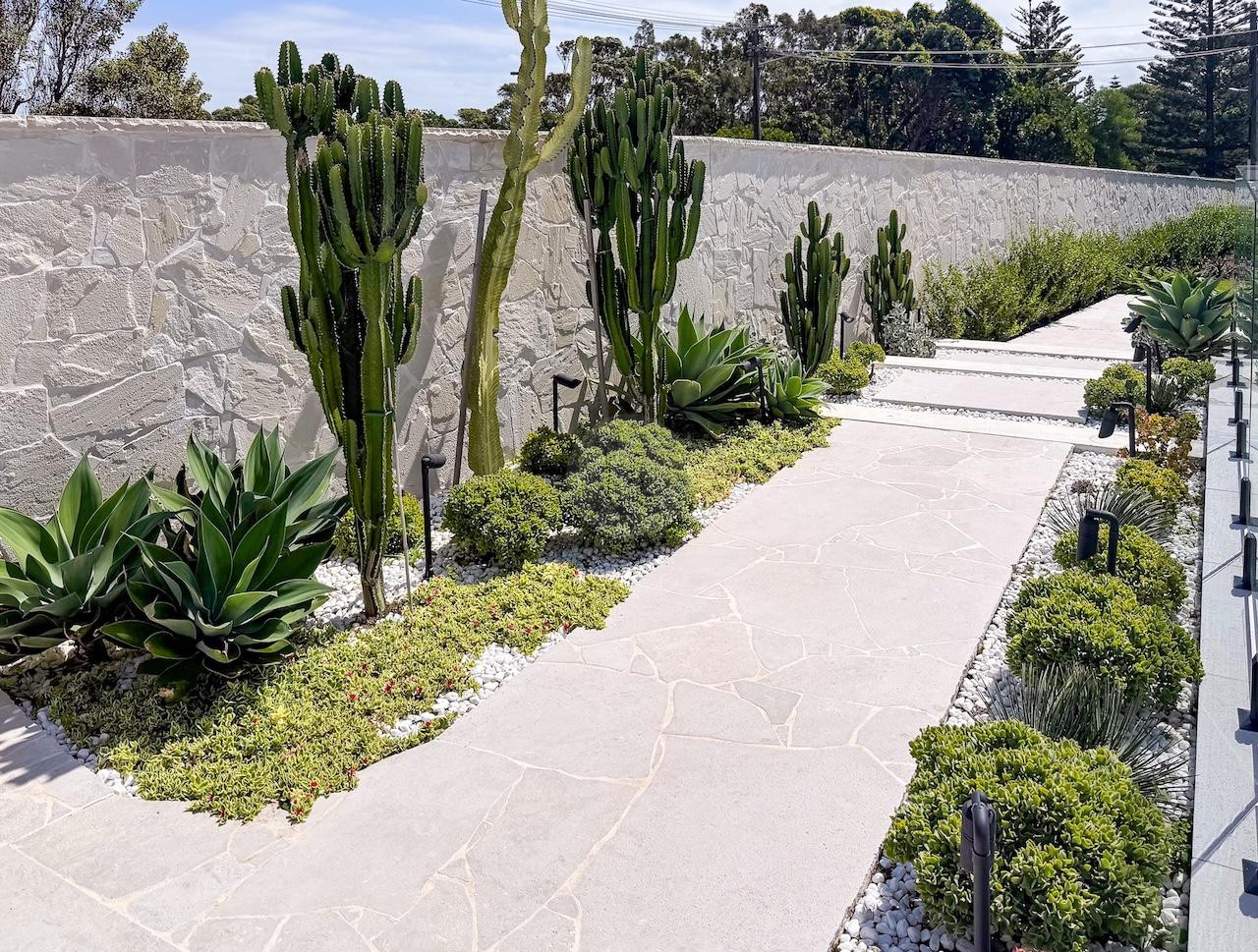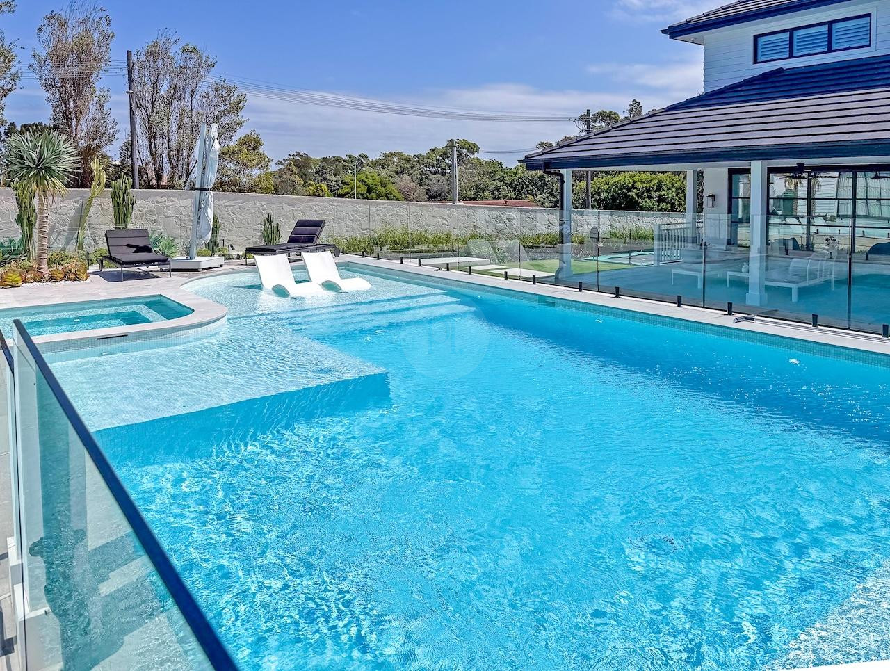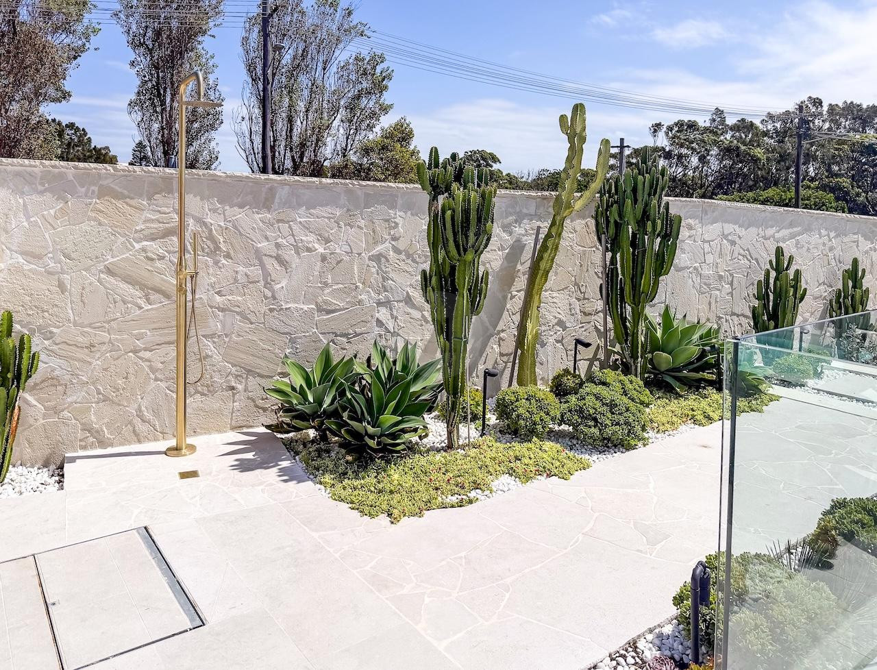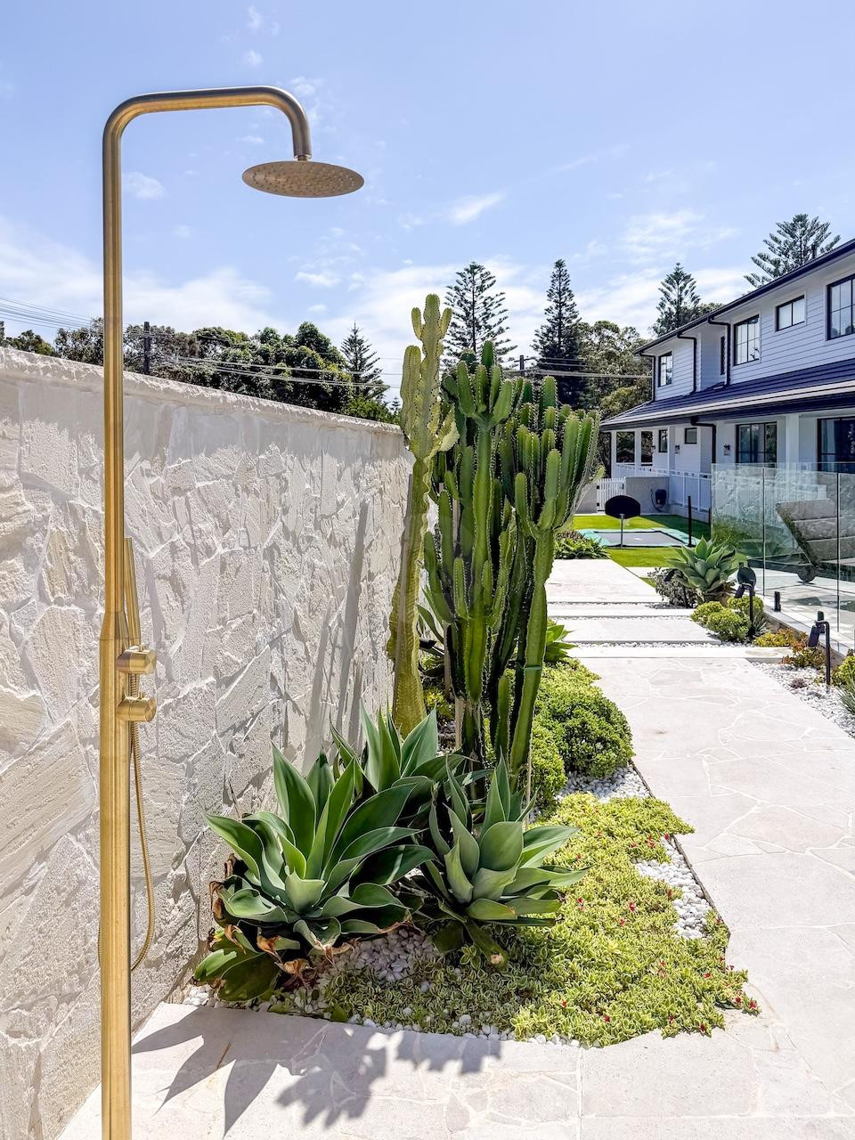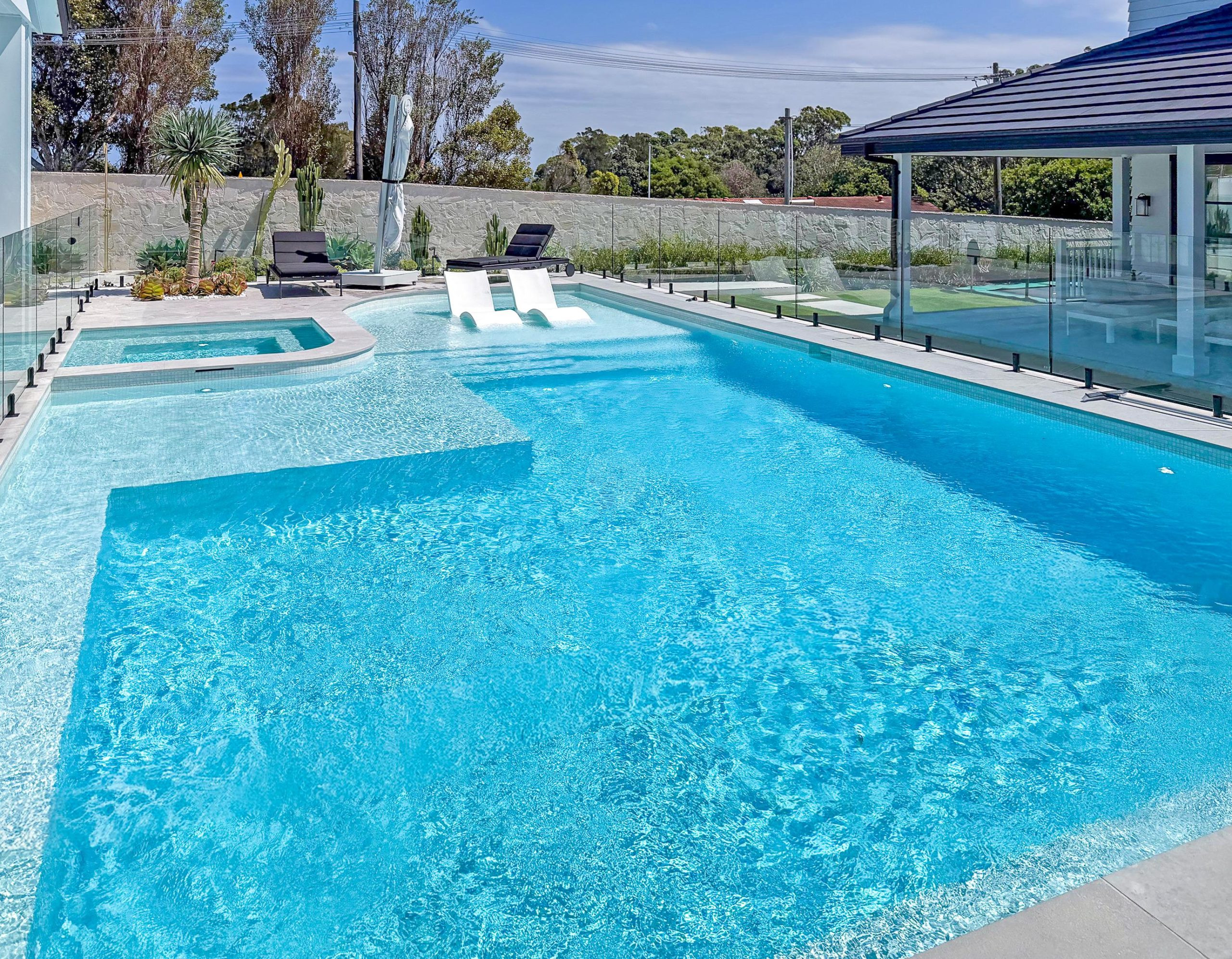 Externally, the property continues to offer additional areas to capture imagery, including a large heated pool with spa and pool lounge chairs, an elegant courtyard, and a manicured lawn area at the side of the home with an in-ground trampoline – all framed by cacti and sandstone walls.