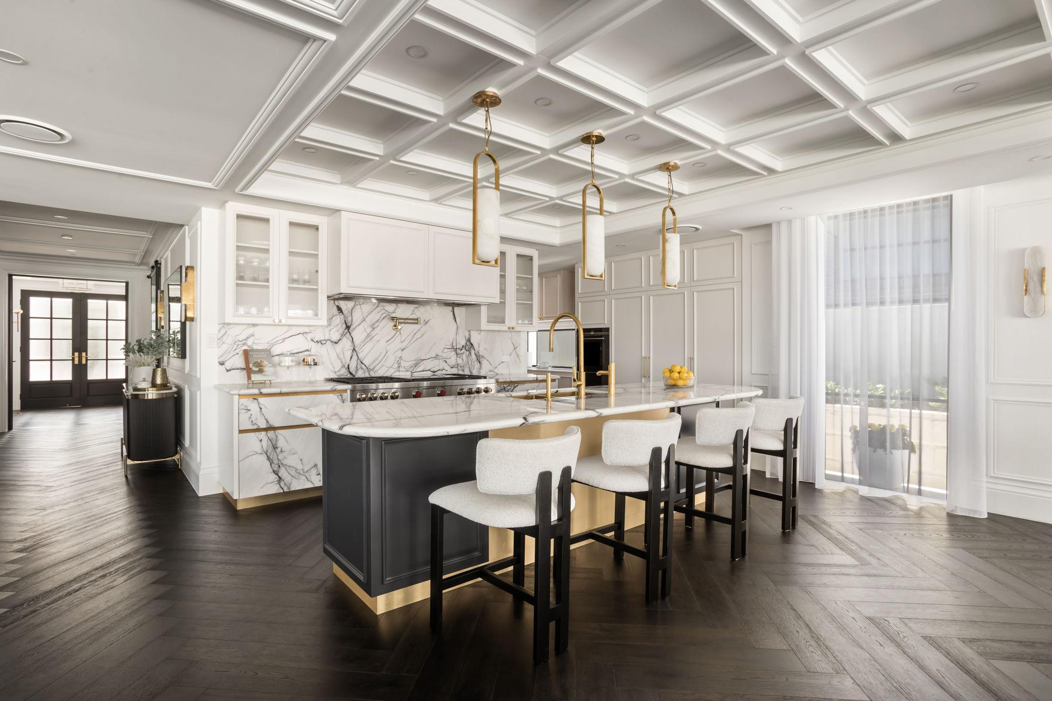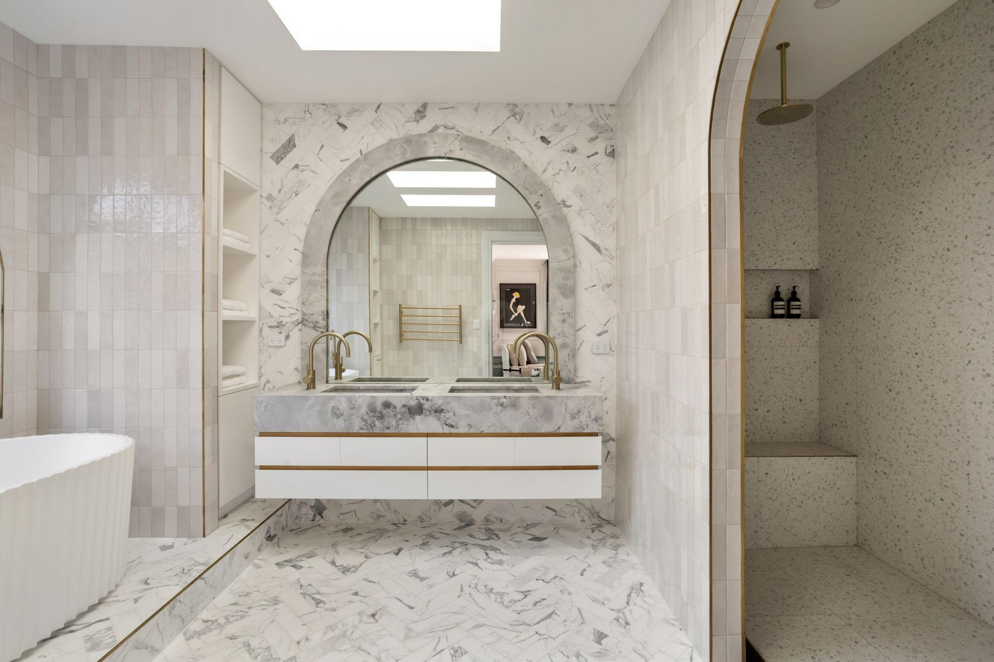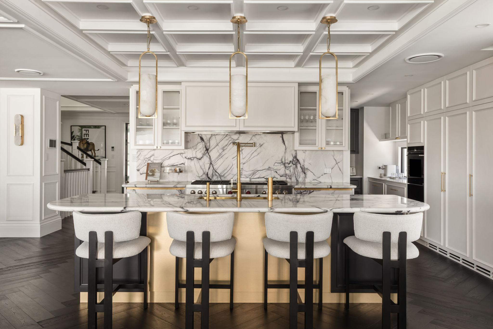 The beautifully designed pool house serves as a self-contained, elevated shooting space, featuring it’s own kitchen with statement oven + range hood in a playful blue and white majolica print, gold tapware, and arched bar cabinets. Designed with airiness and light in mind, it also includes an open-plan dining and living area, fitted with a pool table (that doubles as a table tennis table), built in fireplace and elegant wall niches which would be perfect for homewares and jewellery brands. Drenched in natural light and opening out to the pool and other outdoor rooms, this space captures the essence of relaxed coastal living, making it a wonderful choice for lifestyle campaigns, editorial shoots, and fashion stills.