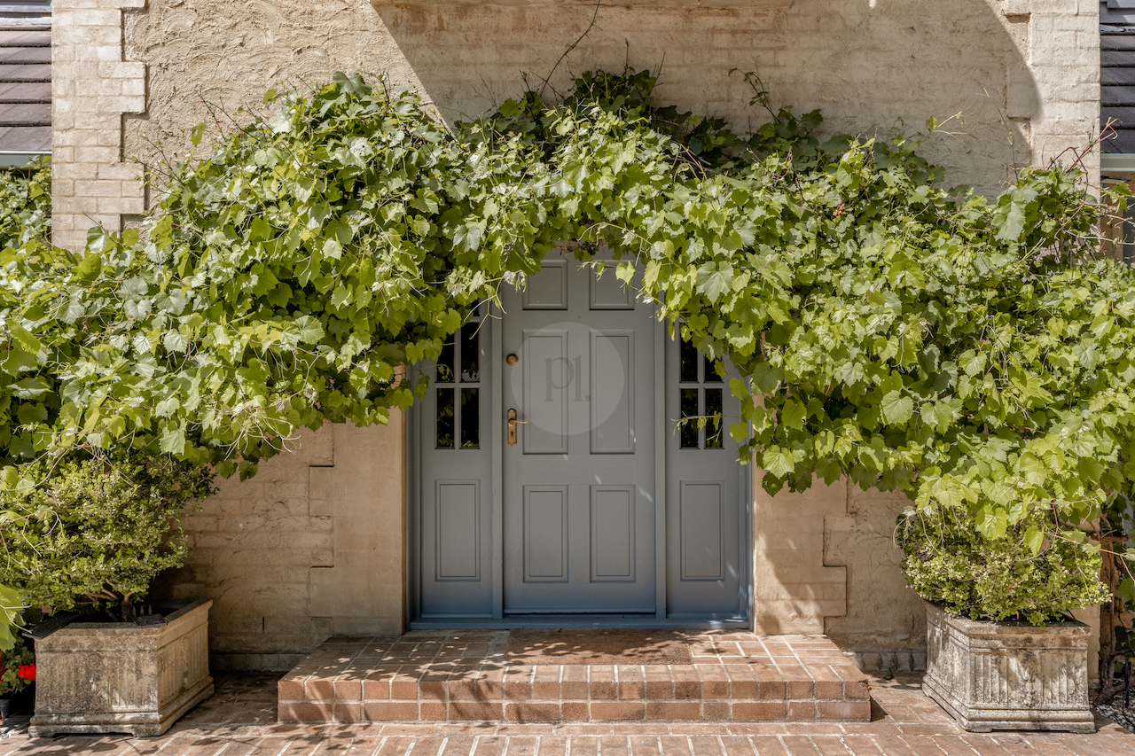 The main house boasts a charming sandstone exterior with terracotta tiles, complemented by pale blue French doors and windows. The inviting front door, adorned with a climbing vine, leads you into a world of elegance and sophistication. Upstairs, a Juliet balcony framed by classic columns offers a perfect vantage point to soak in the tranquil surroundings.