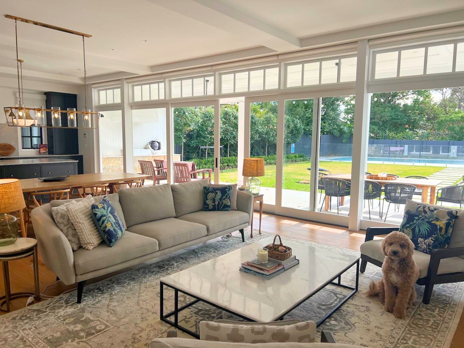 Step inside to discover a light-filled interior with an elegant design that harmoniously blends modern luxury with classic Hamptons charm. The spacious layout includes five well-appointed bedrooms and four stylish bathrooms, ensuring comfort and convenience for any production crew. The heart of the home is the vibrant coloured kitchen, seamlessly connecting to the dining space and living room, making it perfect for lifestyle shoots.