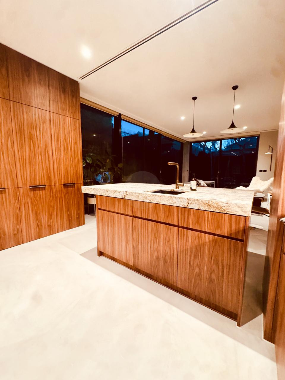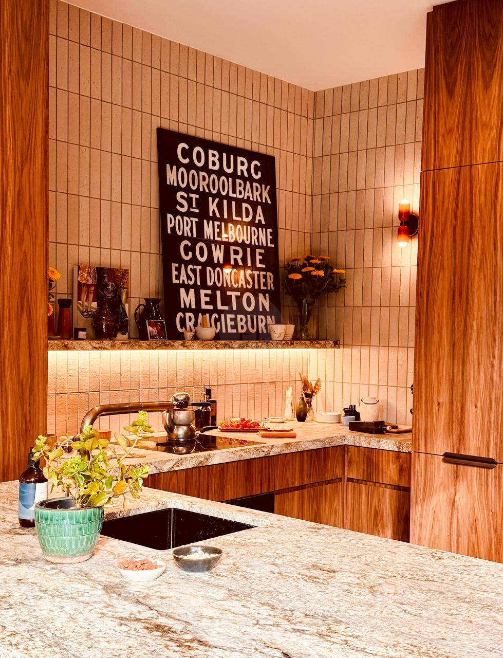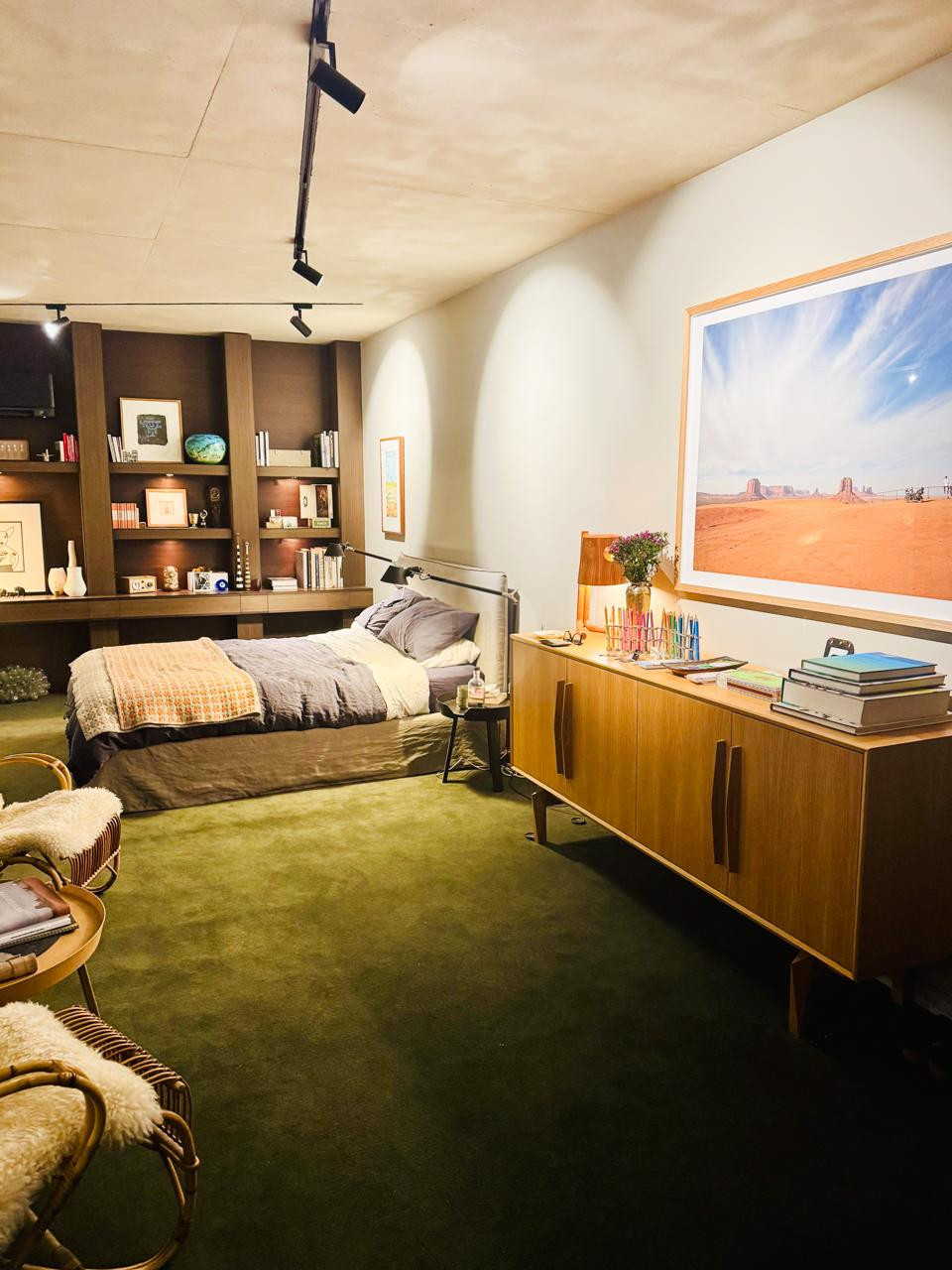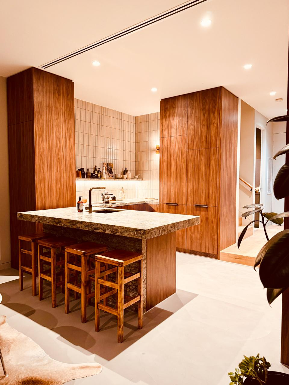 The kitchen showcases warm walnut cabinetry, elegant brass accents, and handcrafted Japanese ceramic tiles, an inspired combination of contemporary and organic materials that makes it perfect for food, interior, and lifestyle shoots. The double-storey layout provides flexibility for production teams, offering varied spaces for both intimate and open-plan setups.