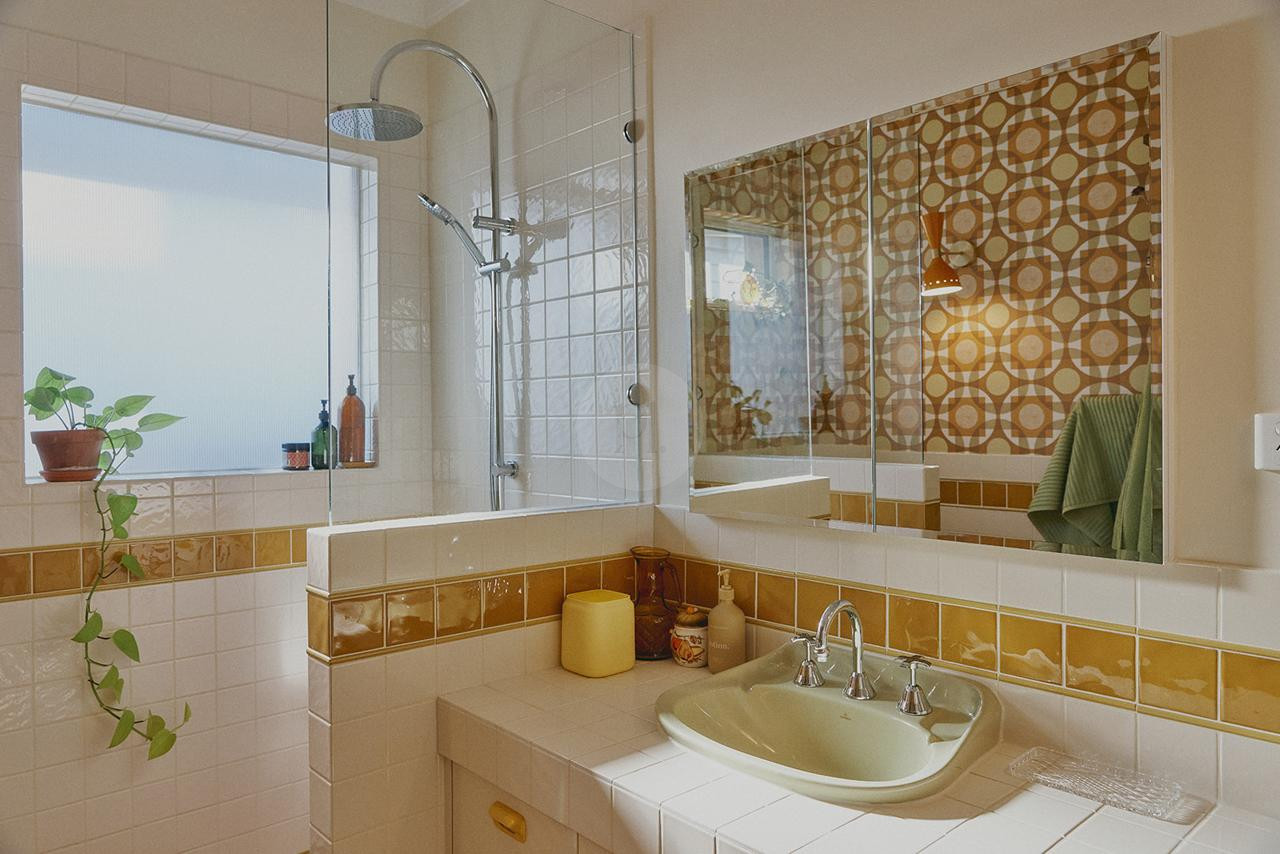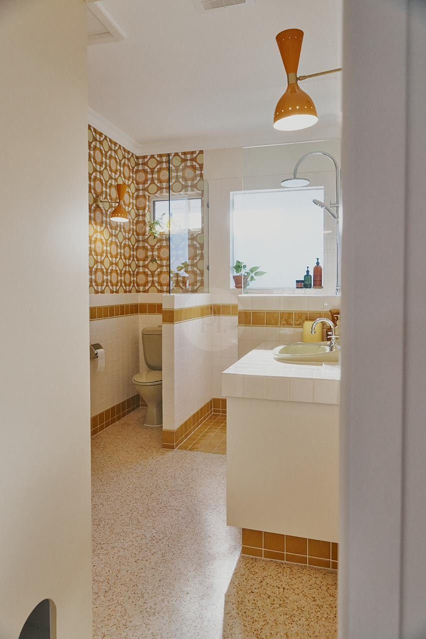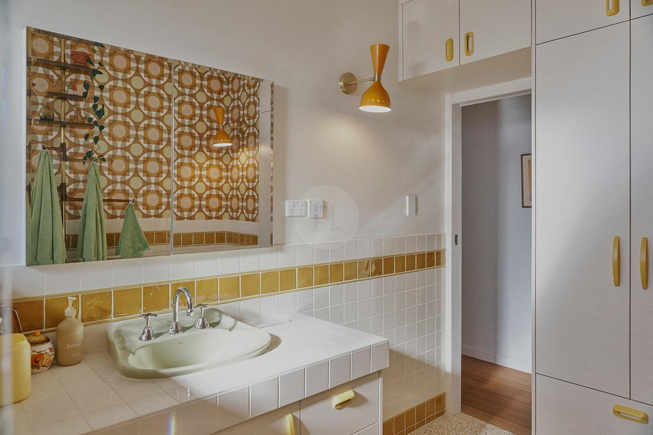The vibrant kitchen boasts a terrazzo poured floor, 50’s inspired cabinetry, and a handmade island bench, perfect for capturing those nostalgic culinary moments. The adjoining dining room, with its sliding amber bottle glass doors and mid-century extendable table, provides a warm and authentic backdrop for entertaining or filming.