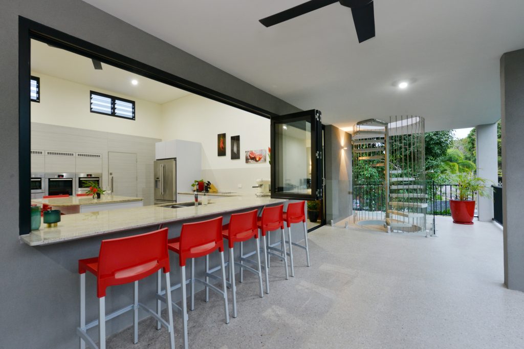 The spiral staircase seamlessly connects generous indoor-outdoor living and entertaining spaces on the three levels of the property.On the first floor, sliding doors opening to a span of over 10 meters connect the open plan living area and the alfresco dining space on the 100 sqm balcony which is partially cantilevered over the pool.