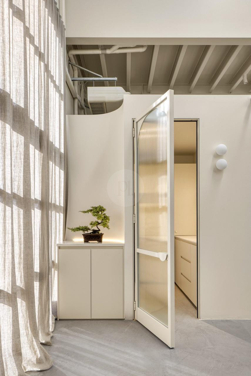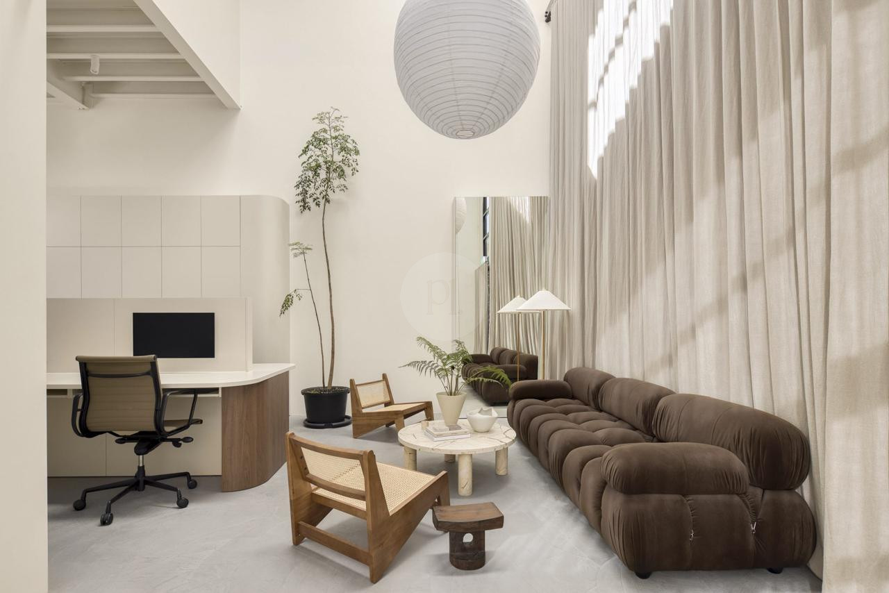 Ascend to the upper level and discover a warm, design-led atmosphere featuring Chevron timber floors and sculptural joinery. This space is bathed in soft natural light, thanks to large windows that provide a serene, editorial quality, perfect for capturing those stunning visuals. The layered lighting throughout enhances the inviting ambiance, making it a versatile location for various shoots.
