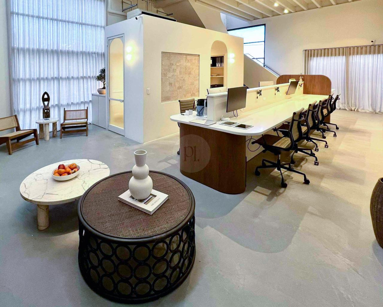 The downstairs area boasts an impressive industrial warehouse style, featuring polished concrete floors and architectural scale that creates an inspiring environment for creativity. With an open layout and long workstation, it is ideal for production teams looking for a spacious and functional setting.