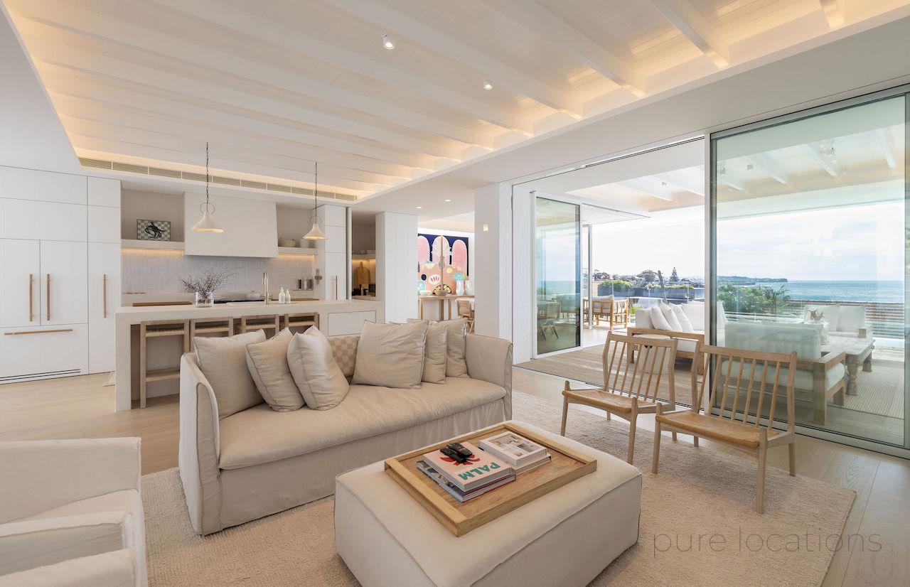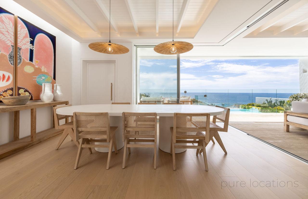 Featuring wooden flooring throughout and plenty of natural light to bounce off the uniquely rendered white walls, Paros creates ideal shooting conditions for any campaign. The dining and outdoor living areas boast expansive ocean views separated by barely there glass sliding doors that provide a seamless transition from outdoors to indoors, further adding to the Grecian aesthetic of the home. The kitchen is expertly equipped with top of the range appliances, including a large double gas top oven, large pendant lighting, plenty of bench space and a rendered range hood.