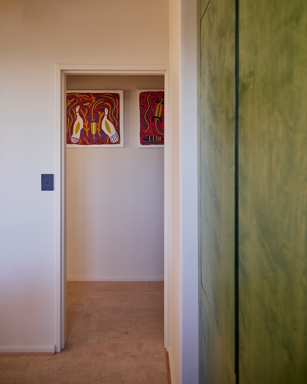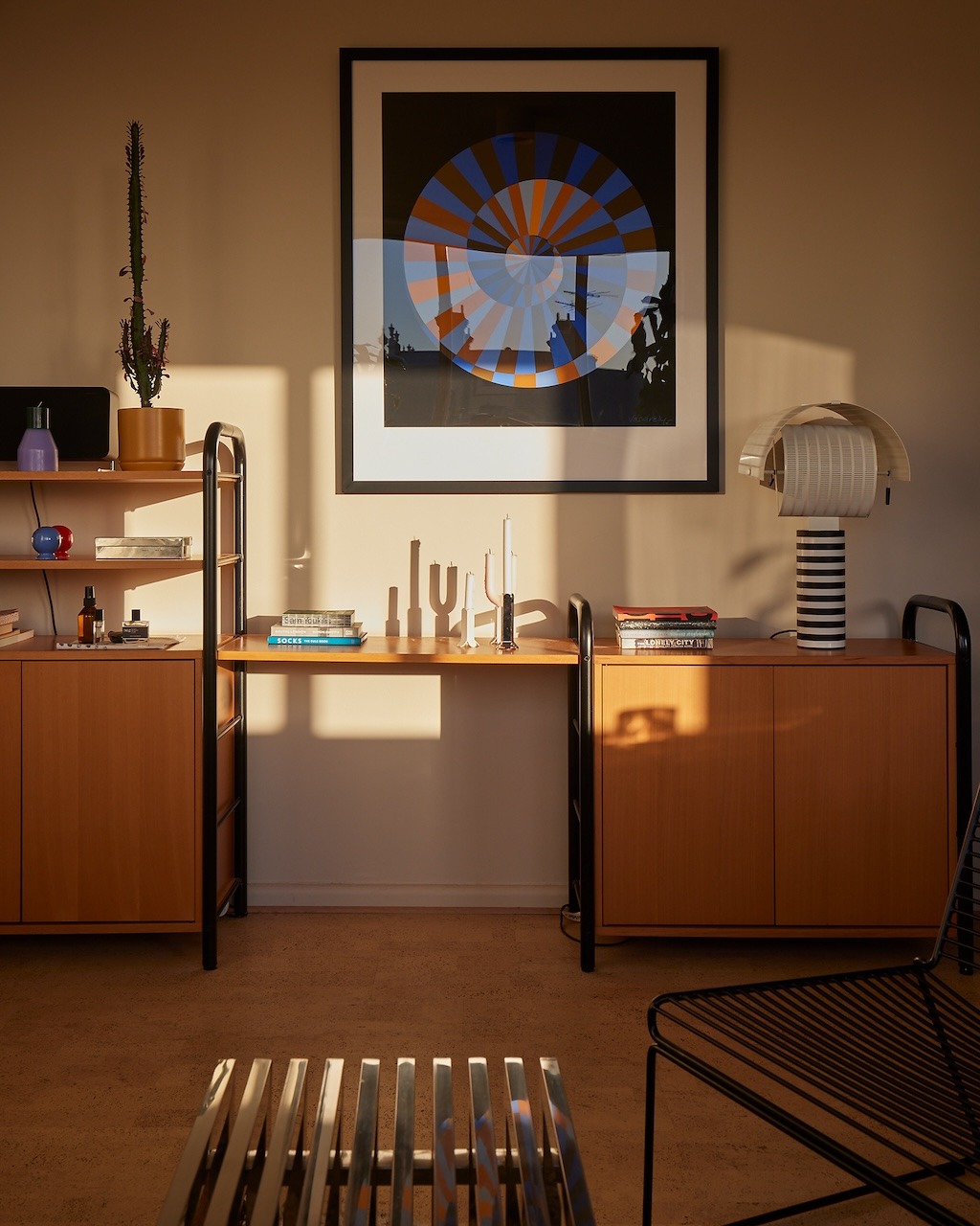 As you step inside, you’ll be greeted by an explosion of colour, with a distinctive coloured kitchen that serves as the centrepiece of this artistic abode. The mid-century furniture and carefully curated artwork create an inviting atmosphere that captures the essence of the 1960s, making it an ideal backdrop for creative endeavours.