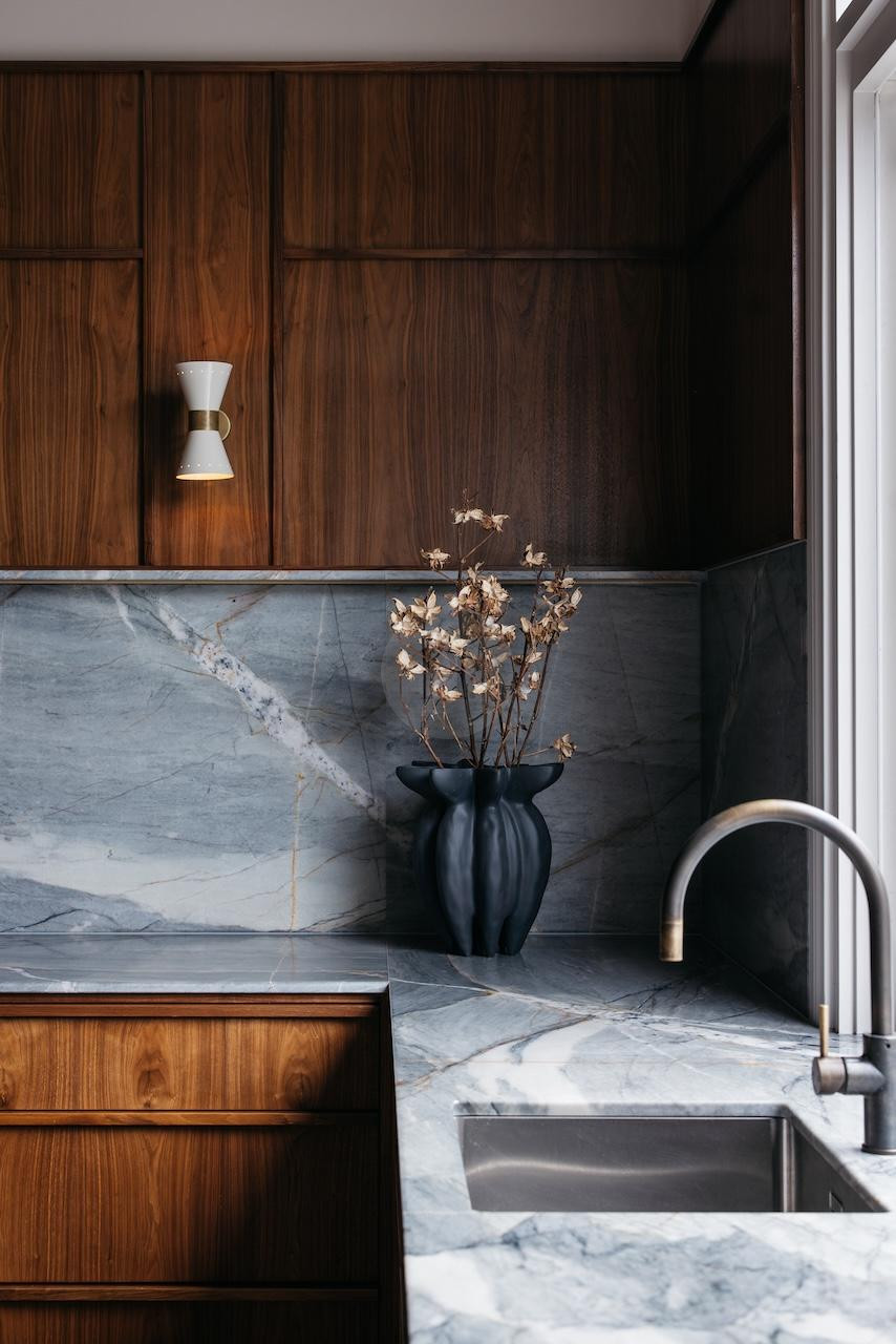 Featuring a spacious layout with multiple living areas, a striking kitchen with walnut cabinetry and a servery window that opens out to the alfresco area, Protea House offers a versatile and elegant setting for any creative production. The interiors showcase timeless design elements, including soaring 4-metre ceilings and luxurious finishes that pay homage to the home’s heritage while incorporating mid-century modern aesthetics.