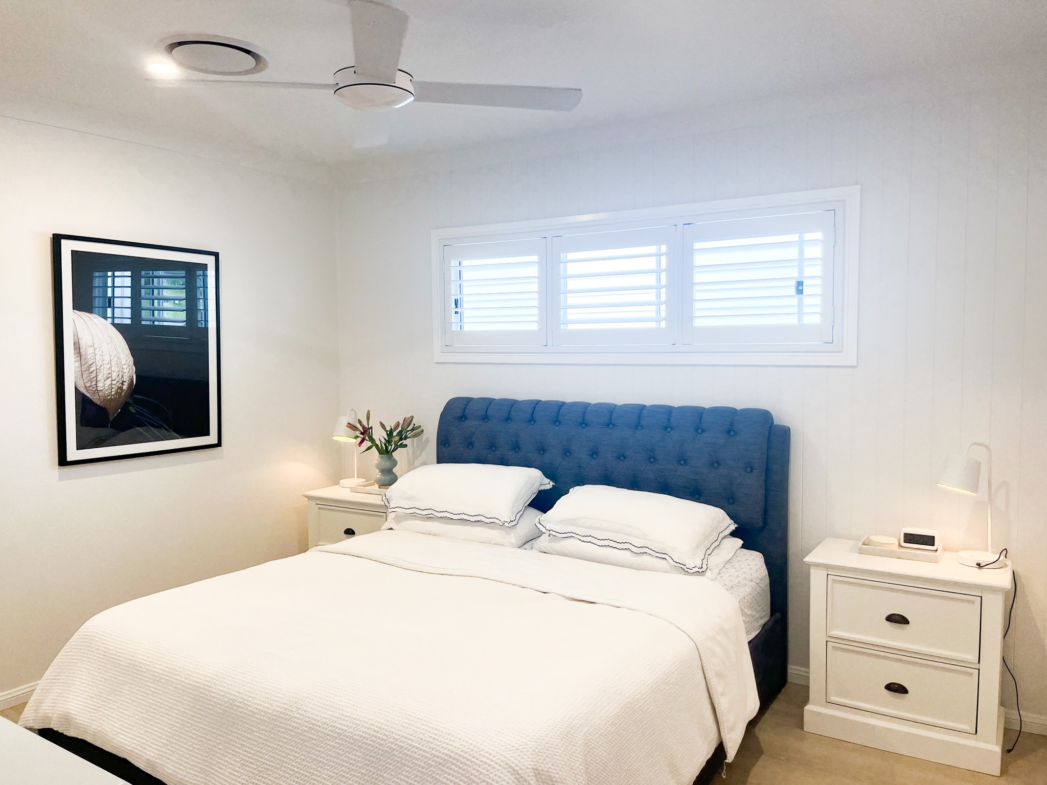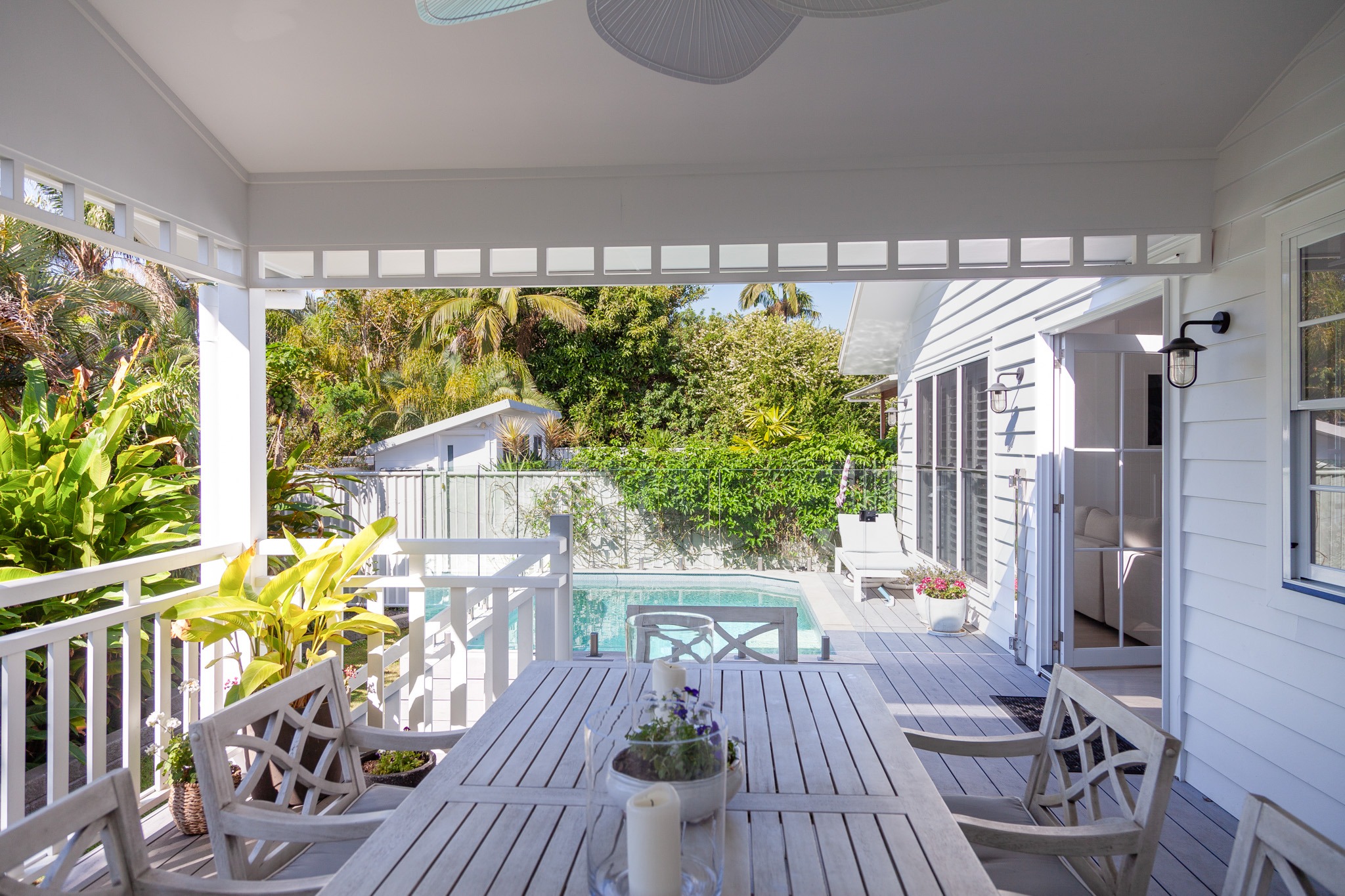 Step outside to find a picturesque backyard and garden with fragrant jasmine, hydrangeas, a humble vegetable garden and pizza oven. The sparkling pool flows nicely from the beautiful undercover outdoor deck with overhead fan and timber outdoor furniture. Surrounded by lush greenery and tropical landscaping, this outdoor oasis enhances the property’s overall aesthetic, providing a photogenic backdrop for shoots or filming. The front cottage facade of the home adds to the charm, offering yet another backdrop for your shoot or film, as well as a welcoming atmosphere for cast and crew alike.