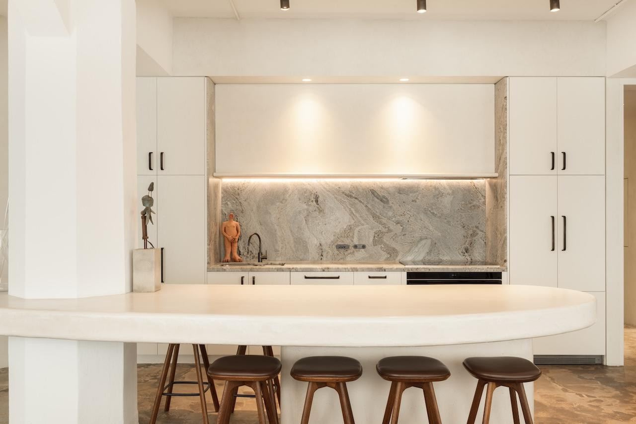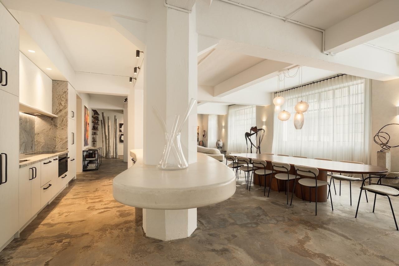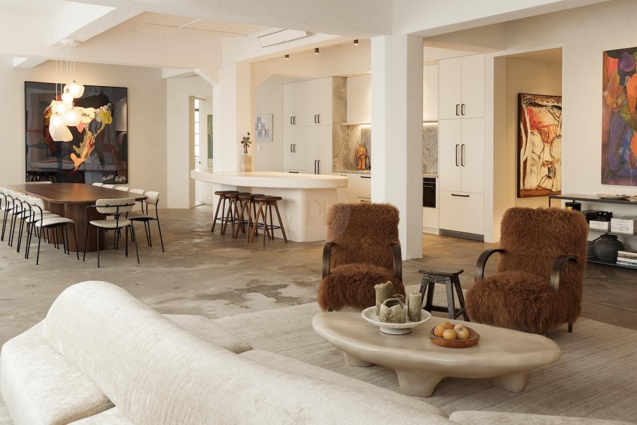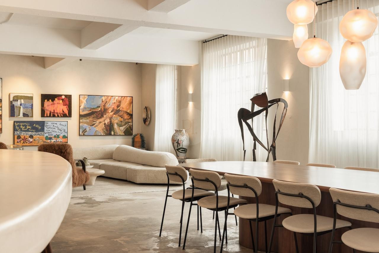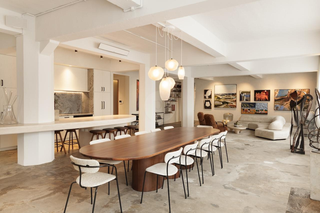 As you step inside from the elevator, an expansive open-plan living and dining area flows effortlessly into a contemporary kitchen, with a custom concrete island bench, creating a bright and airy environment flooded with natural light. The apartment’s clean lines and uncluttered layout provide the perfect canvas for your next photoshoot, filming project or TVC production.