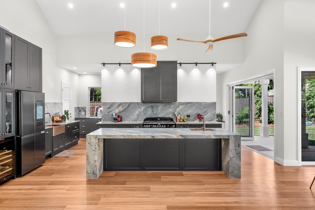 Step inside to discover soaring, pitched ceilings that create an airy atmosphere, complemented by an open concept design. The kitchen is a true masterpiece, showcasing high-end marble that flows elegantly from the bench tops to the splash back and the spacious island. As you transition from the kitchen to the living room, you’ll be greeted by a striking stone feature wall and a cozy fireplace, creating an inviting focal point.