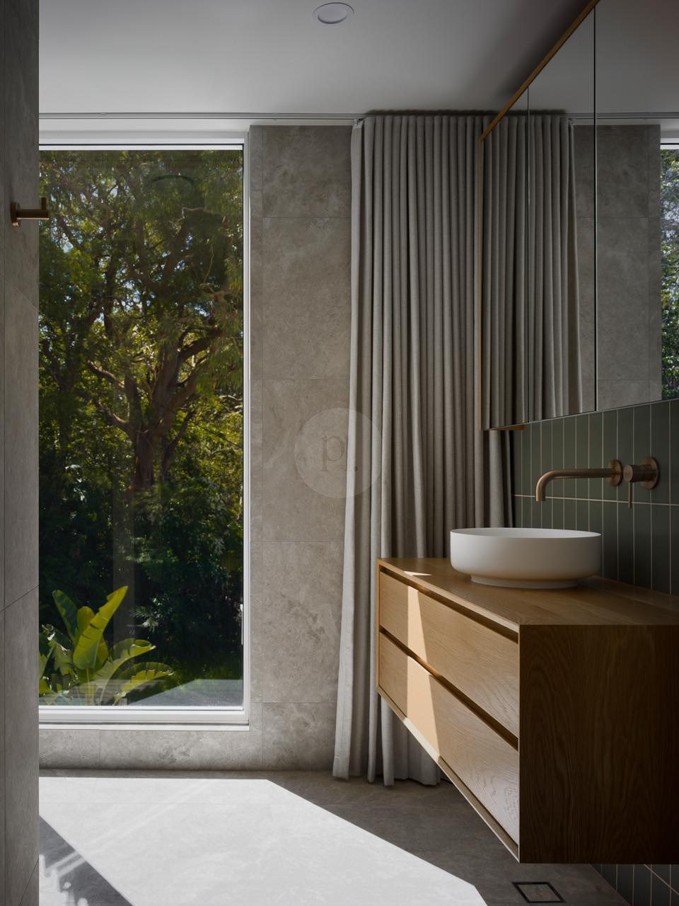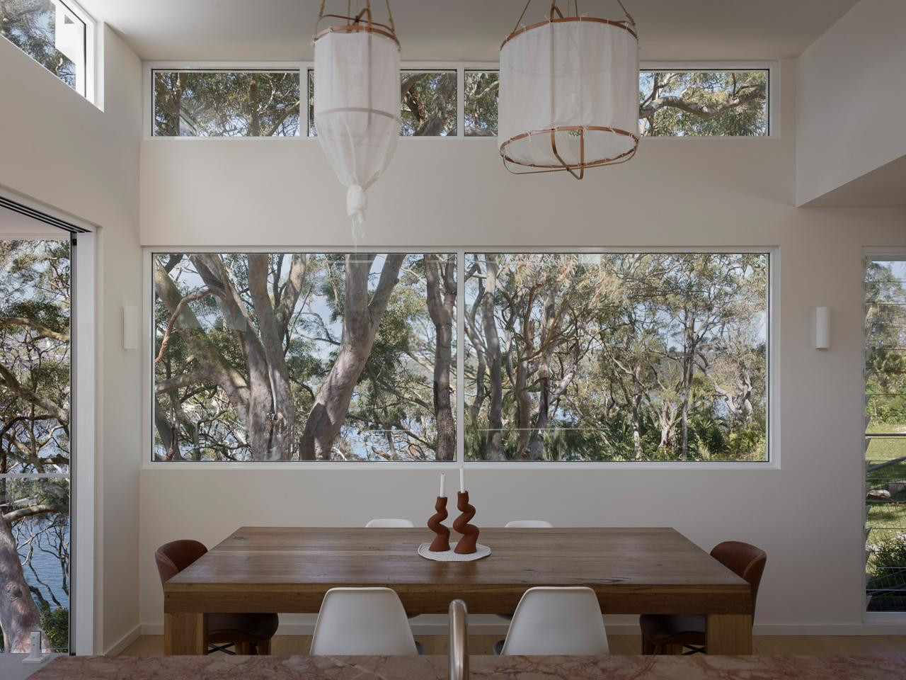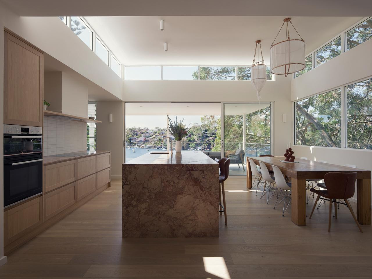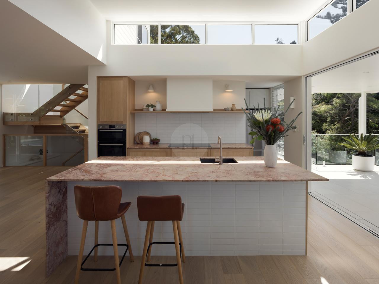 The light-filled kitchen, complete with pink marble benchtops and a practical butler’s pantry, serves as a stylish hub for lifestyle and culinary shoots. A Tasmanian Oak staircase connects all three levels, providing a striking architectural feature that photographs beautifully. Enormous windows in nearly every room frame stunning water views, while the surrounding bushland creates a serene, private atmosphere perfect for editorial, lifestyle, or commercial campaigns.