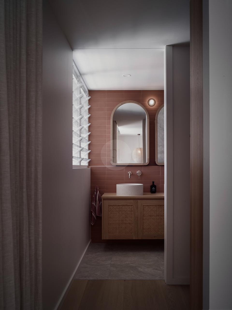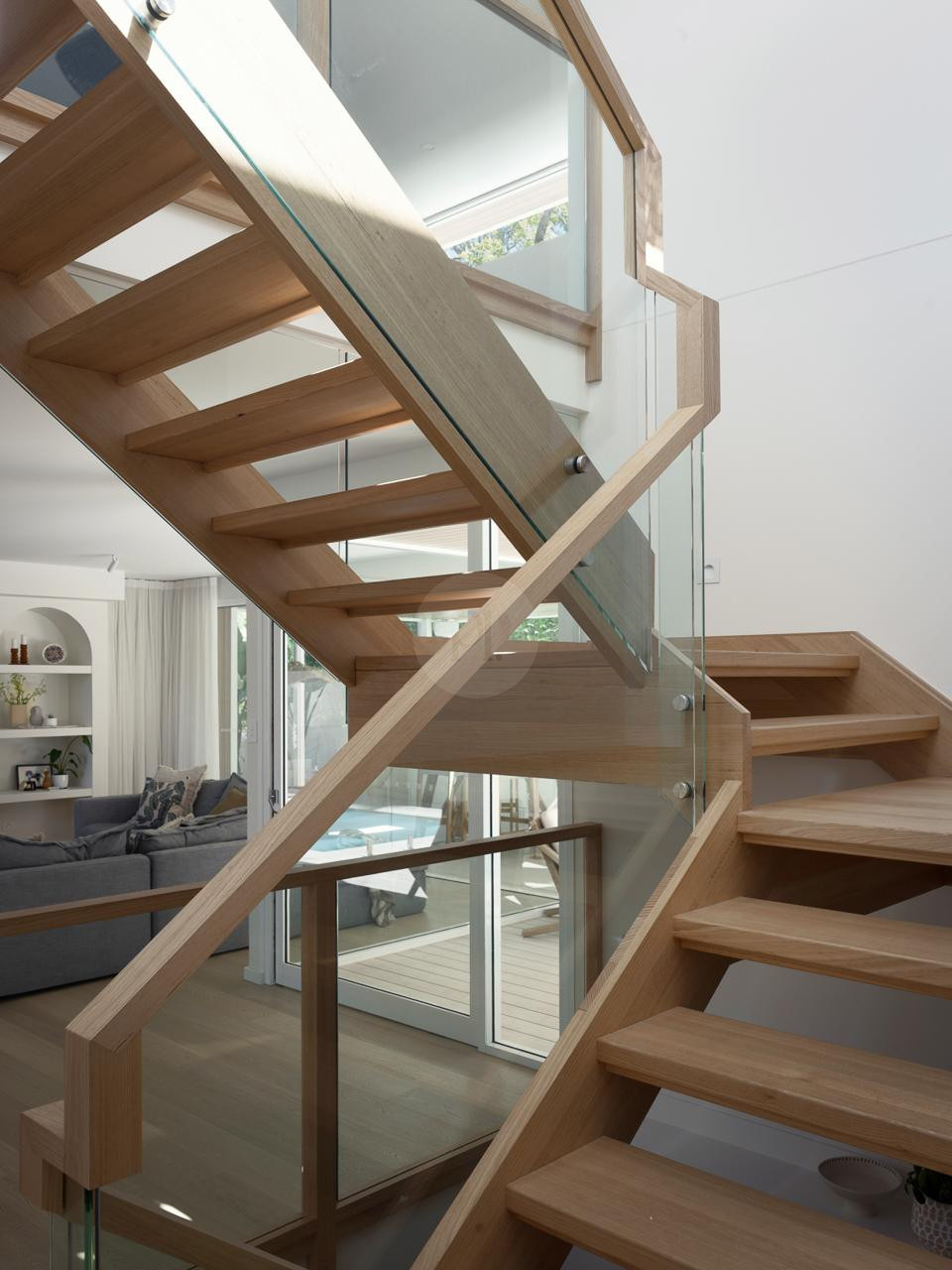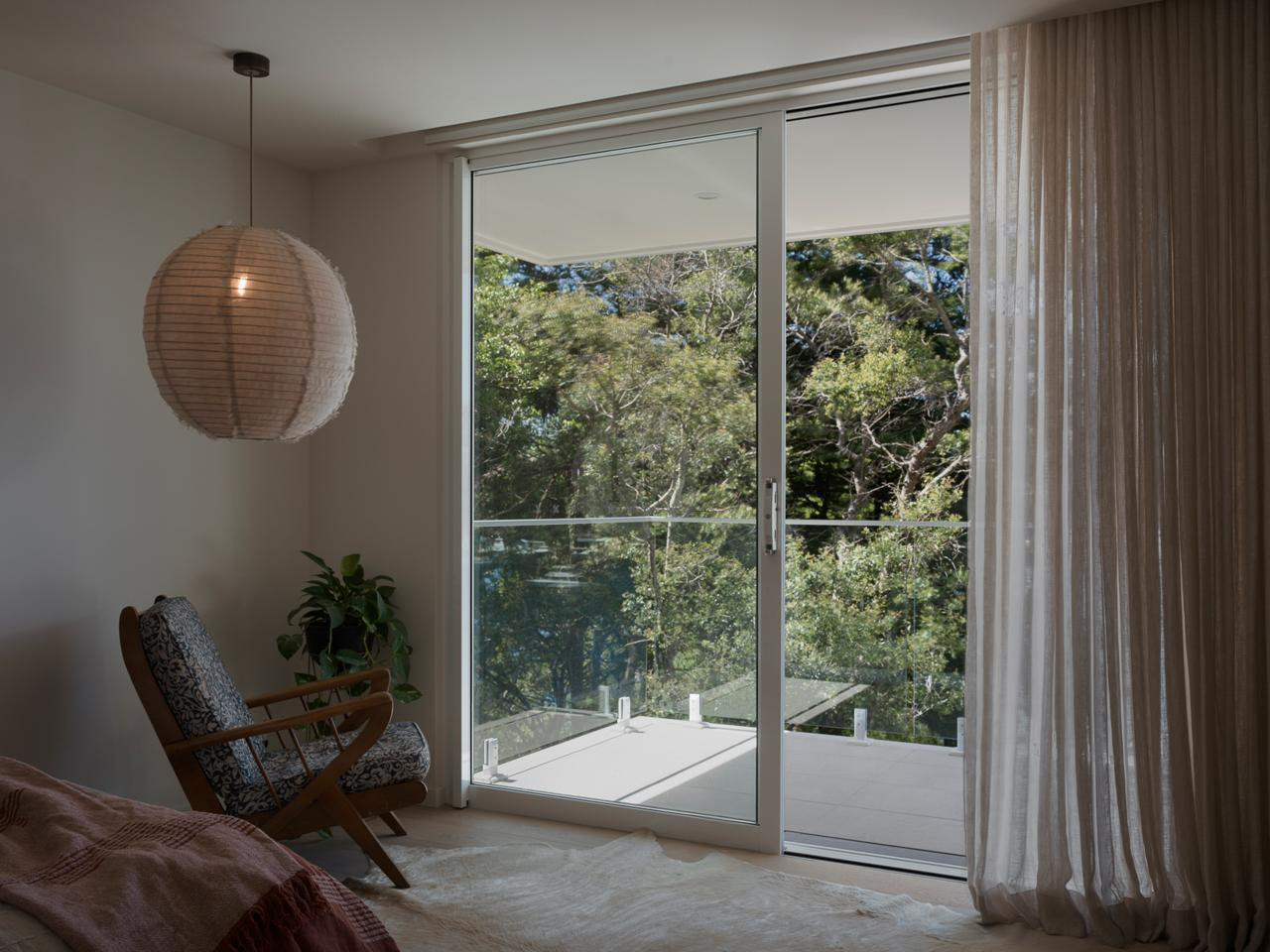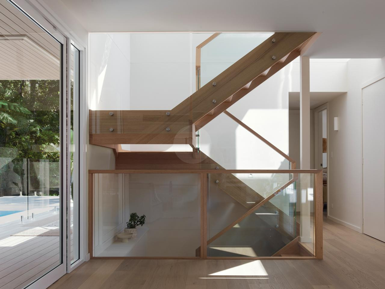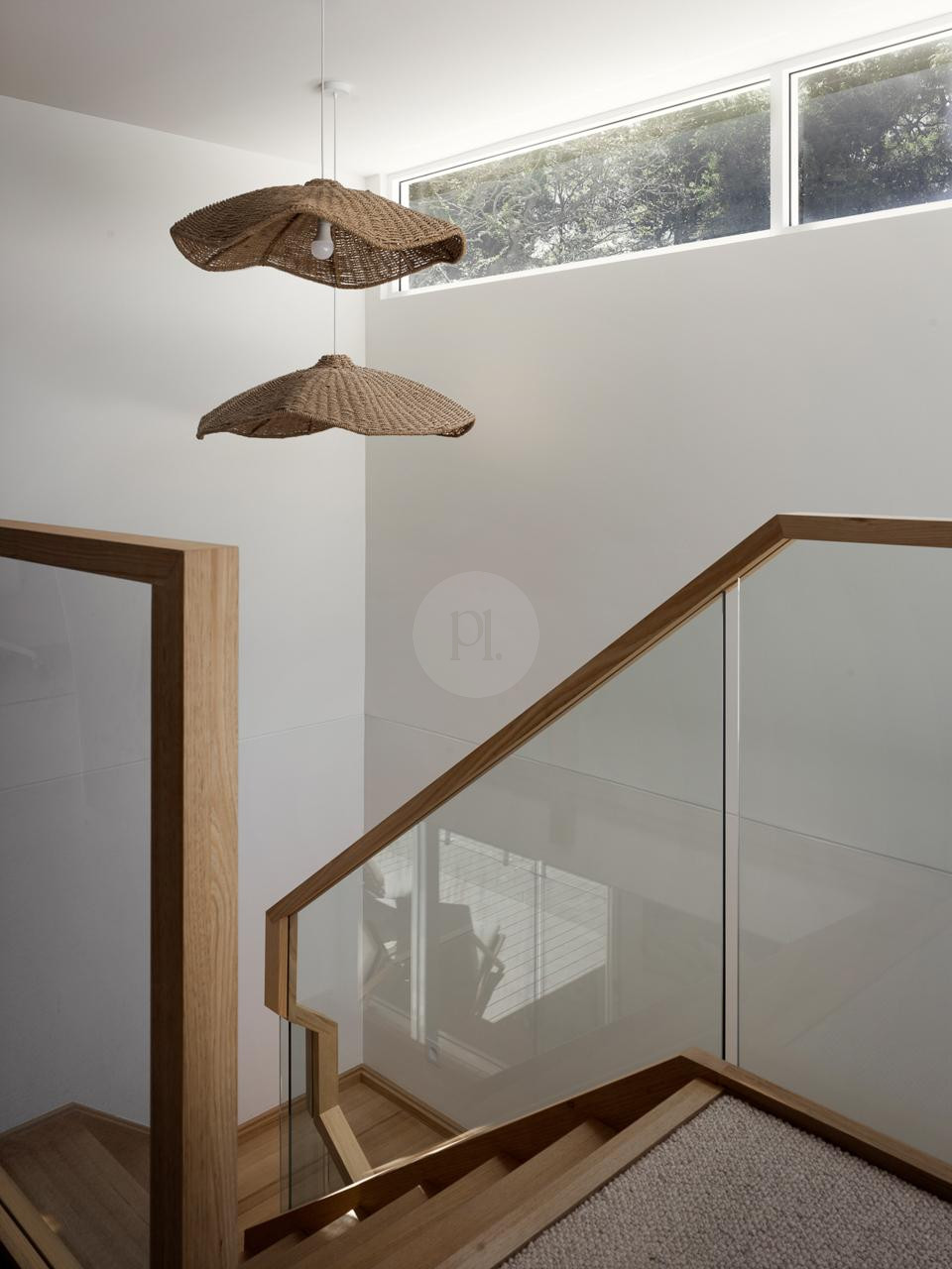 The light-filled kitchen, complete with pink marble benchtops and a practical butler’s pantry, serves as a stylish hub for lifestyle and culinary shoots. A Tasmanian Oak staircase connects all three levels, providing a striking architectural feature that photographs beautifully. Enormous windows in nearly every room frame stunning water views, while the surrounding bushland creates a serene, private atmosphere perfect for editorial, lifestyle, or commercial campaigns.
