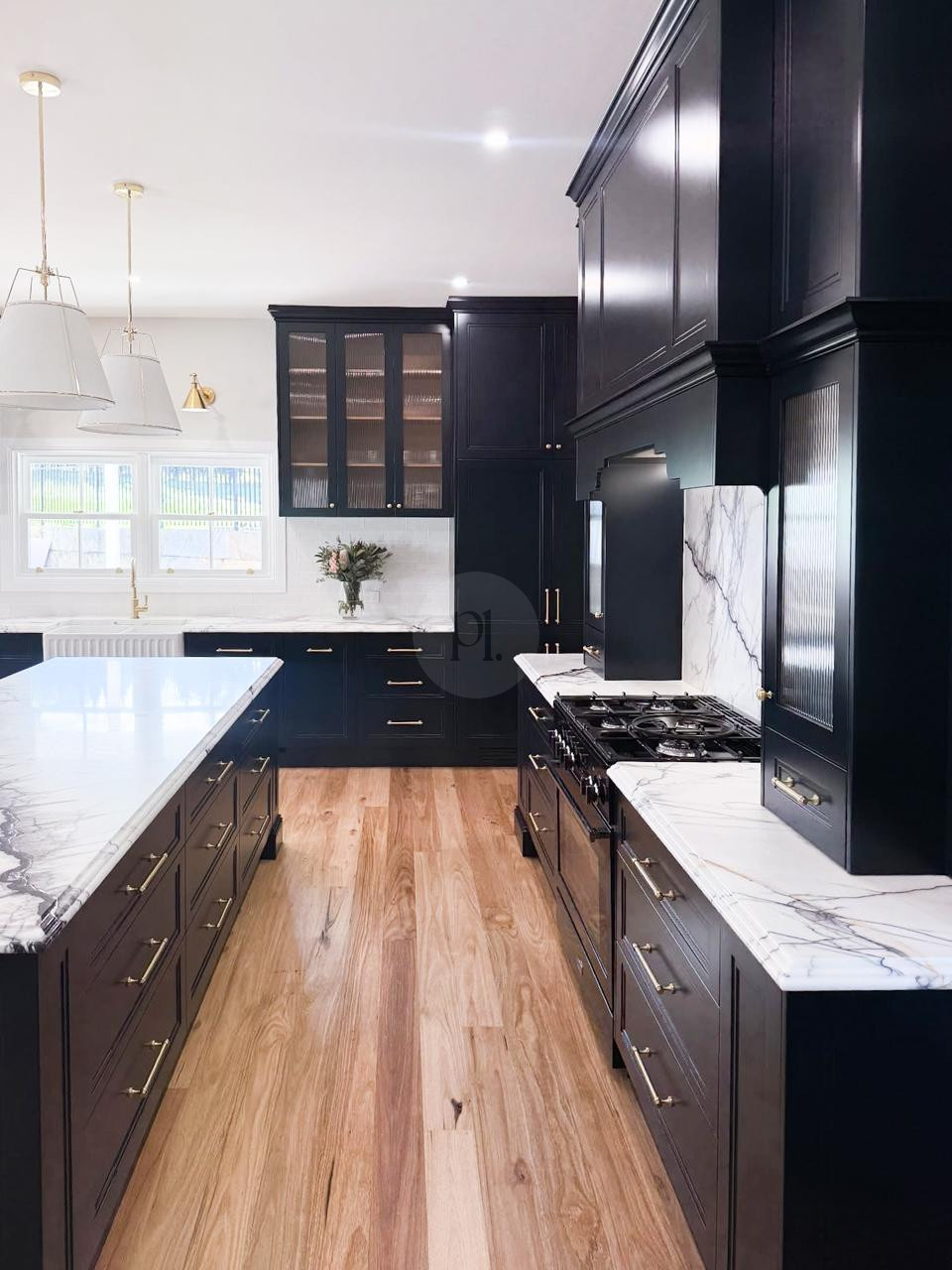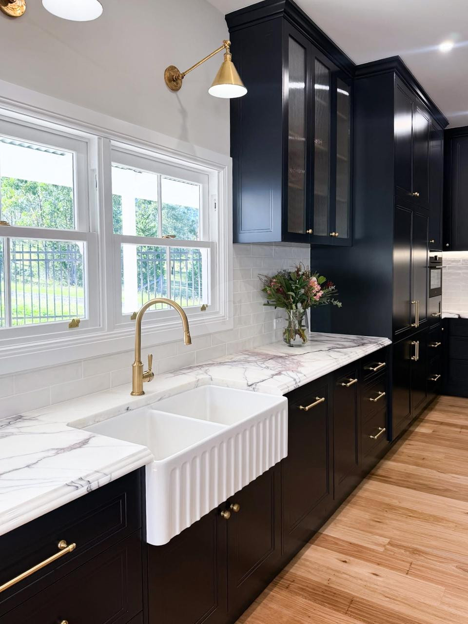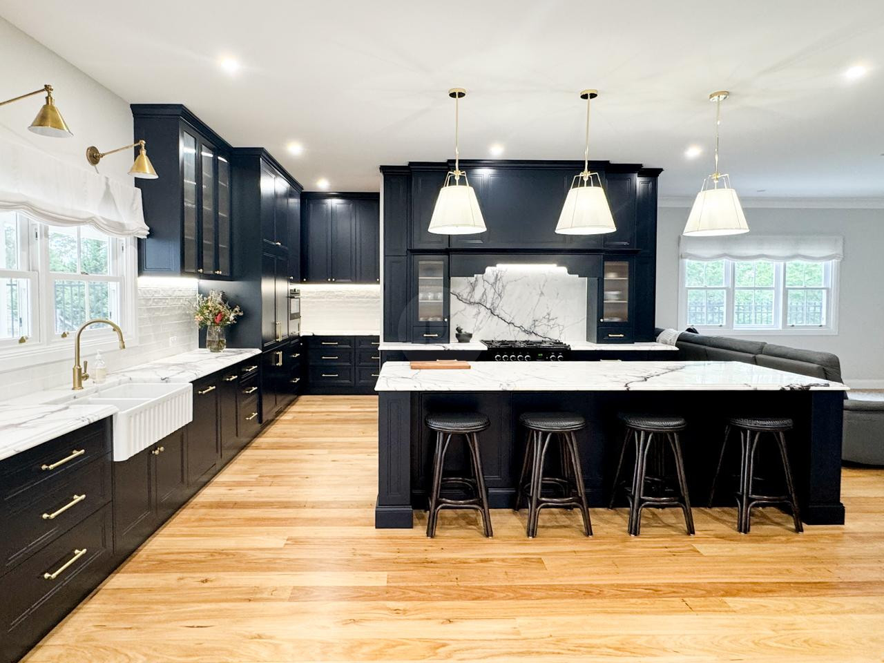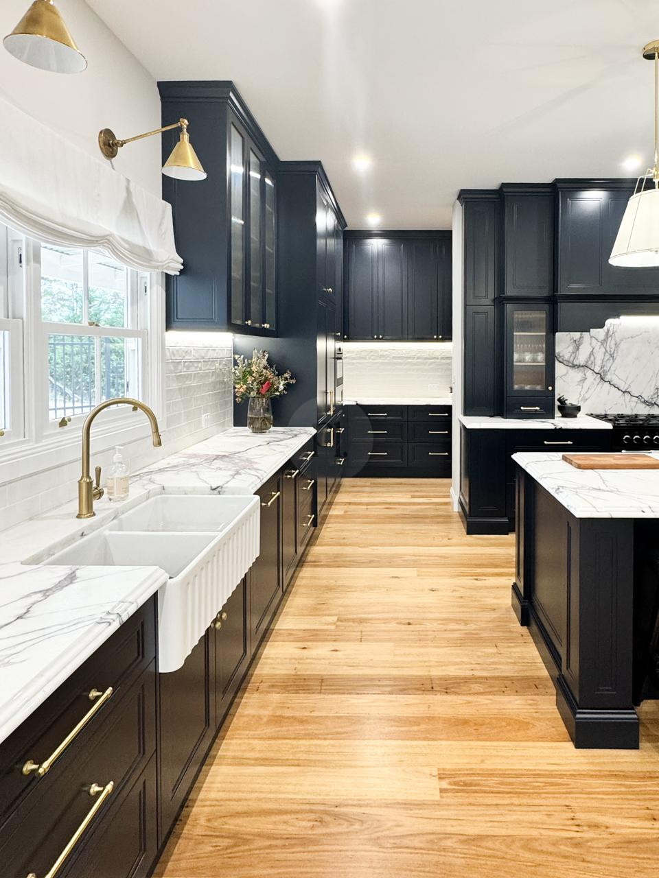 At the heart of the home is a striking, design-led kitchen featuring a sophisticated navy palette, brushed brass accents, integrated appliances, and luxurious marble benchtops. Custom cabinetry throughout the property highlights the craftsmanship and attention to detail, creating a cohesive and visually rich environment that translates beautifully on camera.