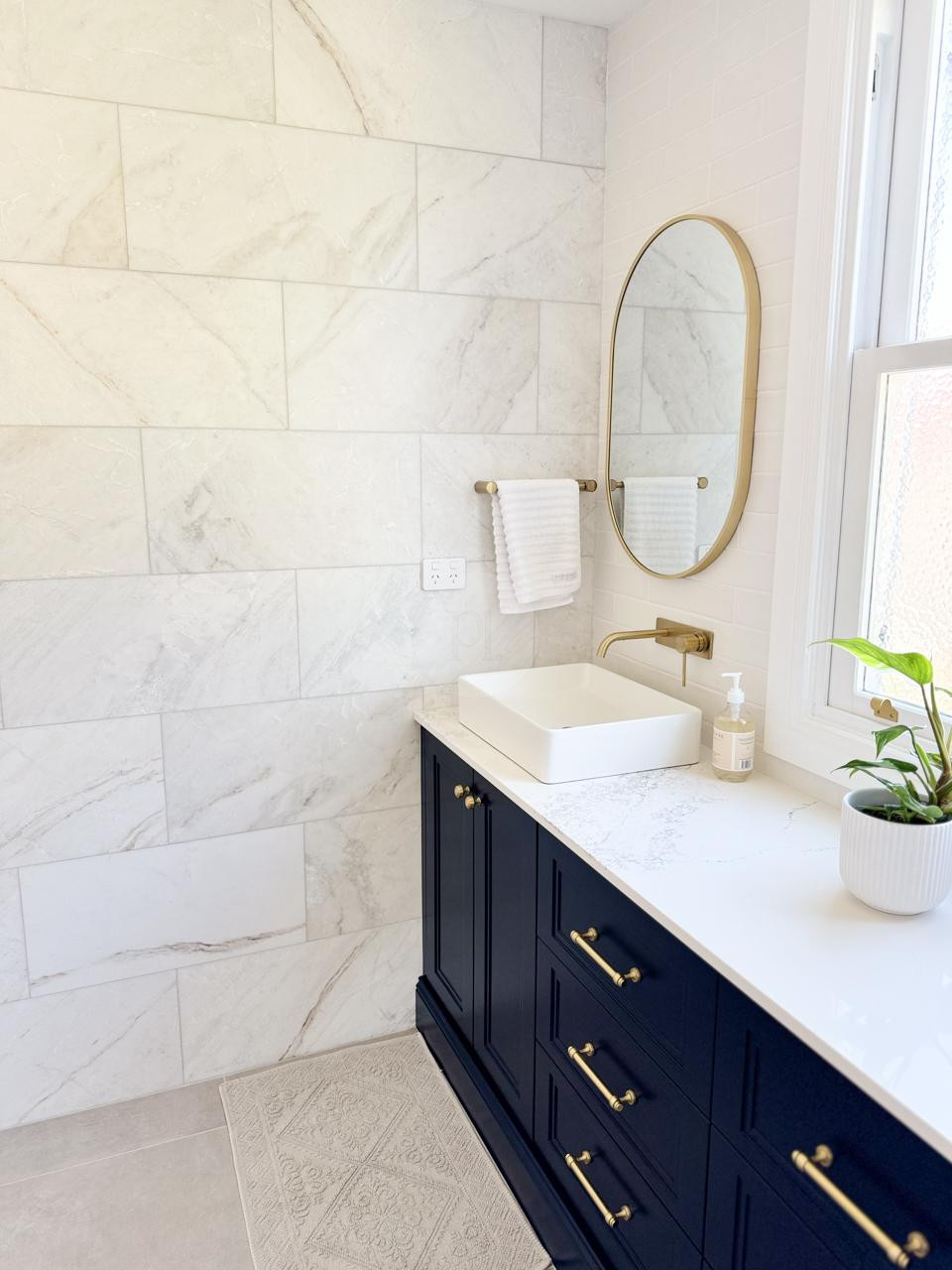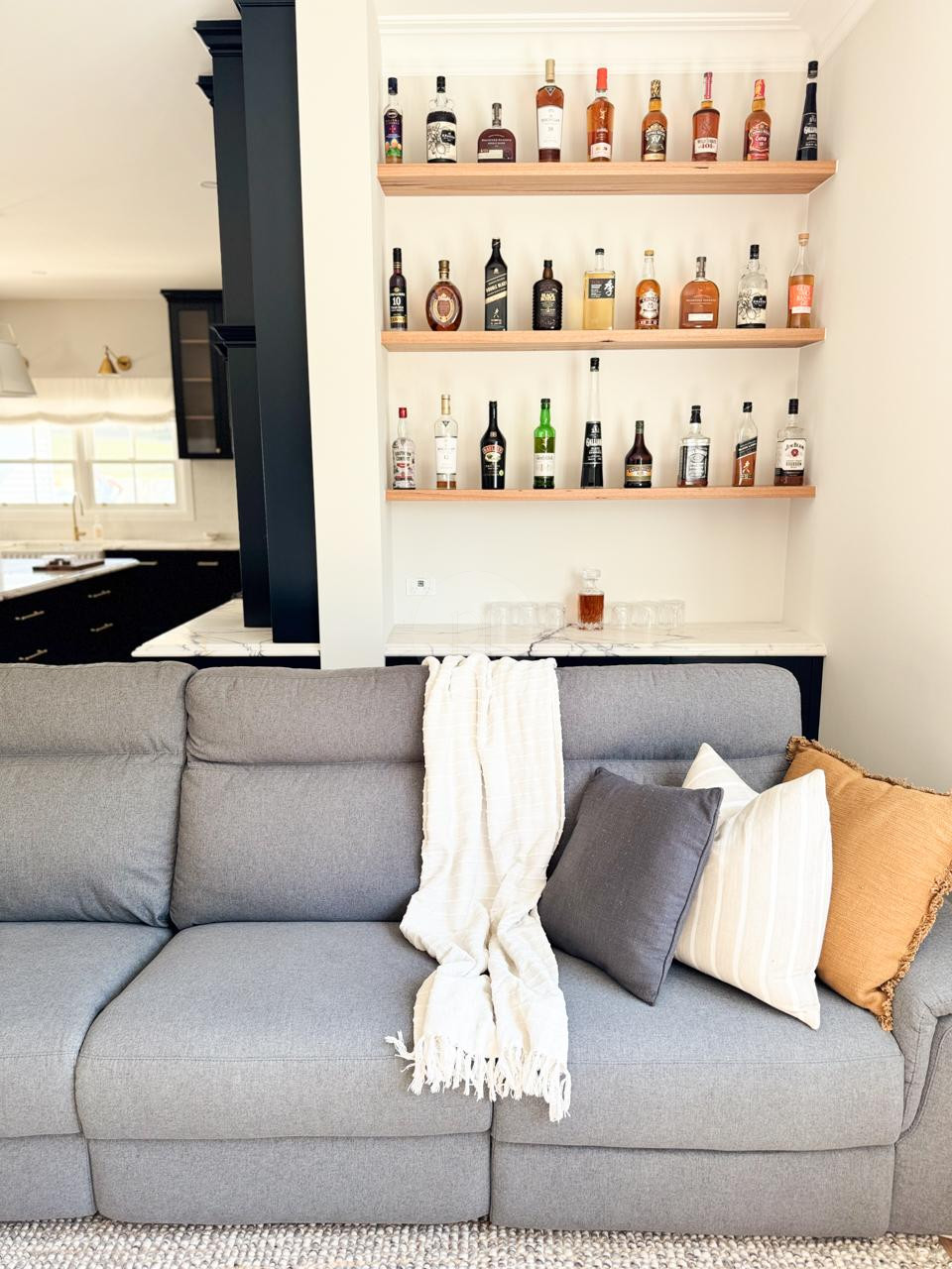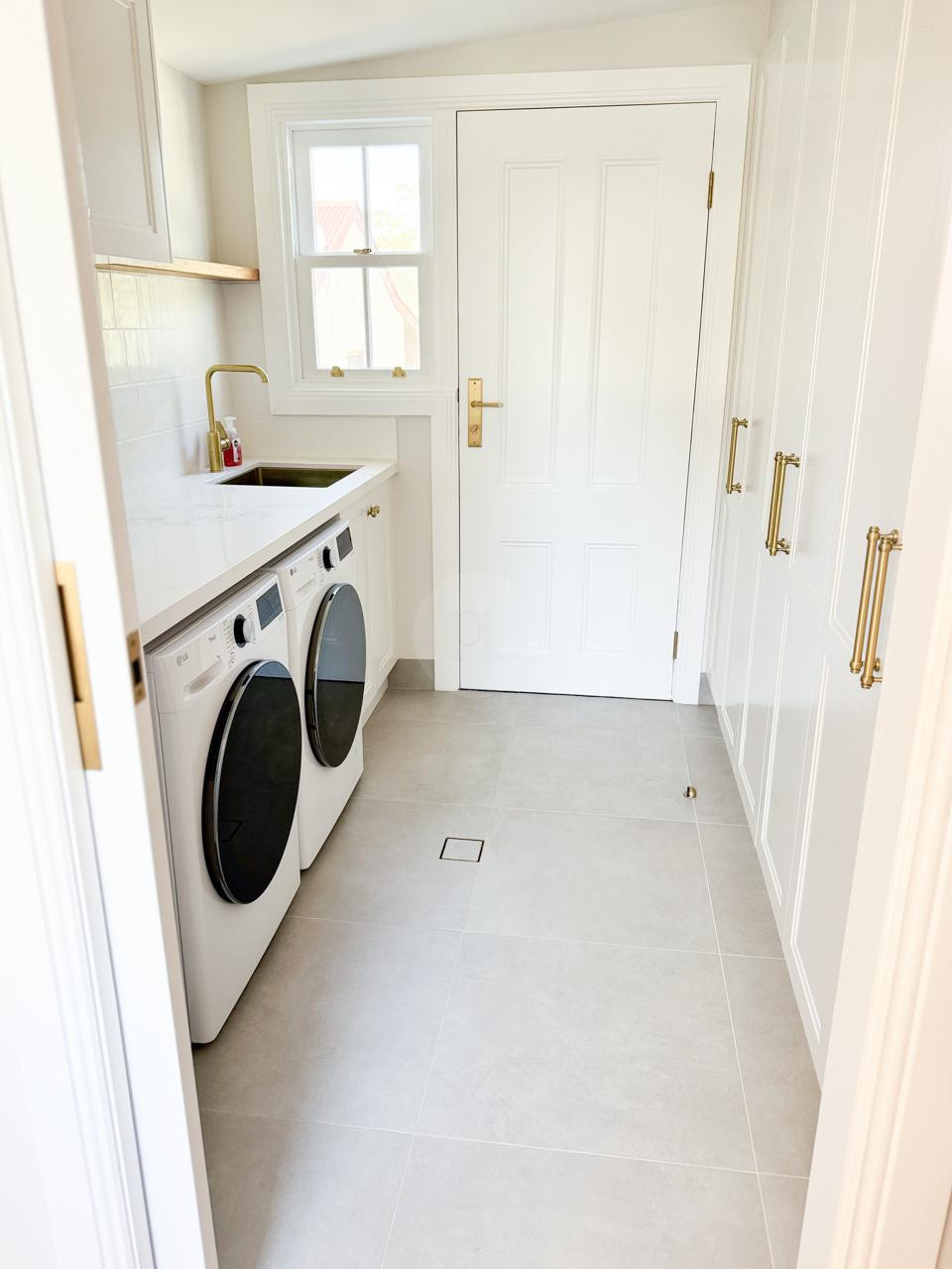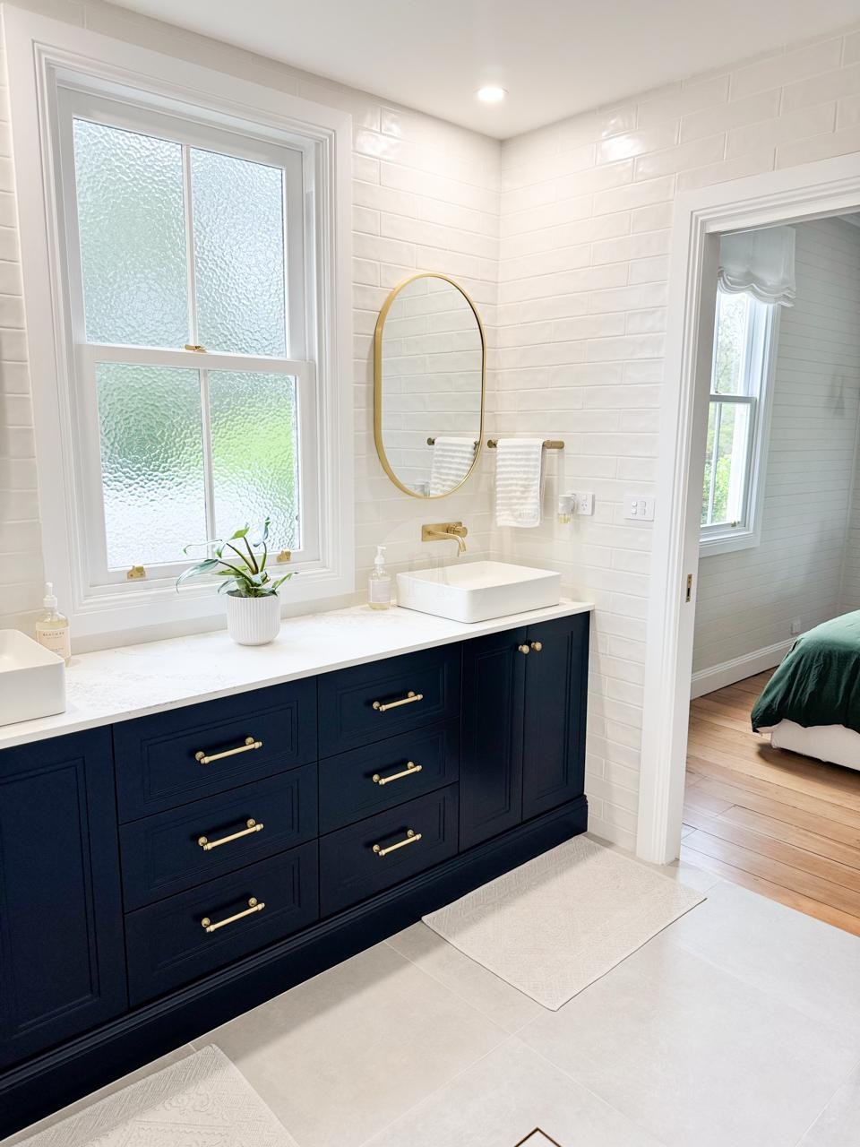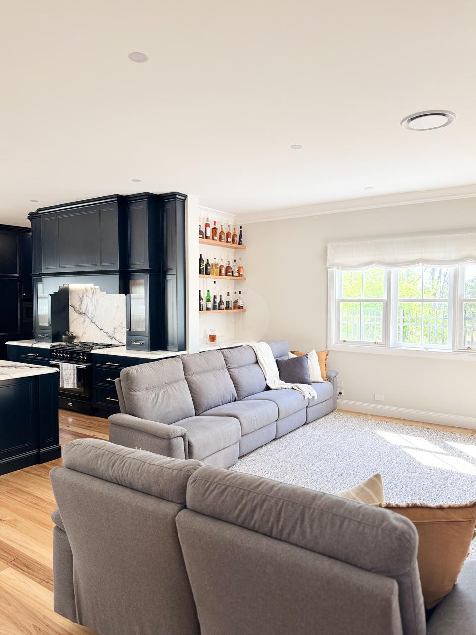 At the heart of the home is a striking, design-led kitchen featuring a sophisticated navy palette, brushed brass accents, integrated appliances, and luxurious marble benchtops. Custom cabinetry throughout the property highlights the craftsmanship and attention to detail, creating a cohesive and visually rich environment that translates beautifully on camera.