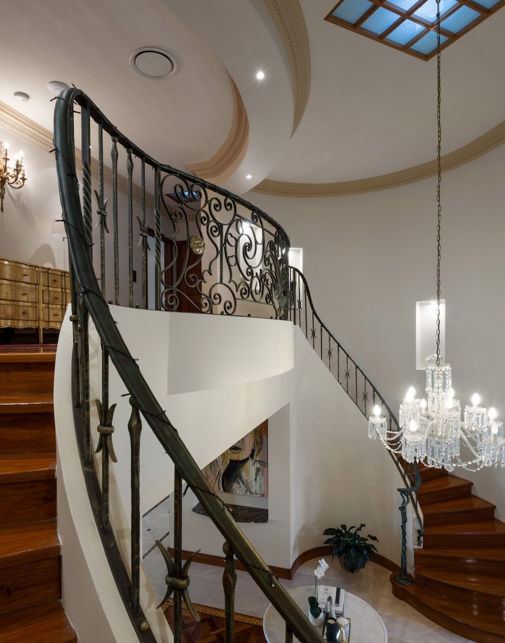 The double-storey layout enhances the feeling of spaciousness, and the homes main entrance features an elegant foyer with two sweeping staircases and parquetry flooring, perfect for fashion or bridal content requiring a sense of lavishness and grandeur.