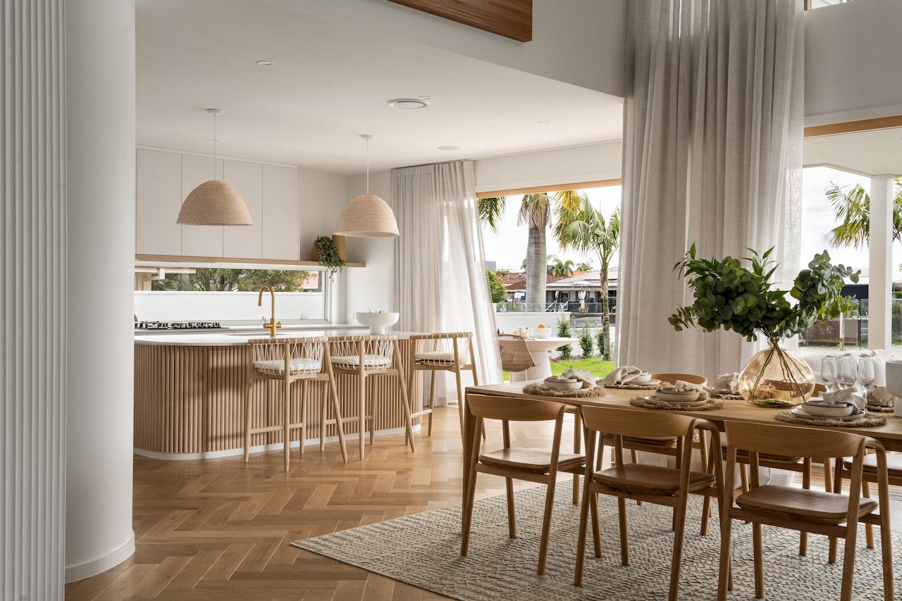 This large family home on the canals of paradise point allows natural light to flood in, making it perfect for productions and photoshoots. The large back yard and pool area would make it a great TVC home. Sunbird is a modern Hamptons inspired coastal design home with some Scandinavian influence. As you walk into the home you are greeted by a large hallways and wooden stairs which lead to a balcony overlooking the kitchen and dining area as well as the bedrooms of the home. There is herringbone wooden flooring within the home in the main living zones, which lead nicely onto the decked entertainers area out the back, which is complete with a built in cooktop / BBQ area . There is a double oven in the kitchen along with a gas cooktop. The master bedroom has a modern ensuite with walk-in robe and a balcony overlooking the canal. The outside of the home has feature stone walls and wooden paneling making it a great backdrop for shoots.