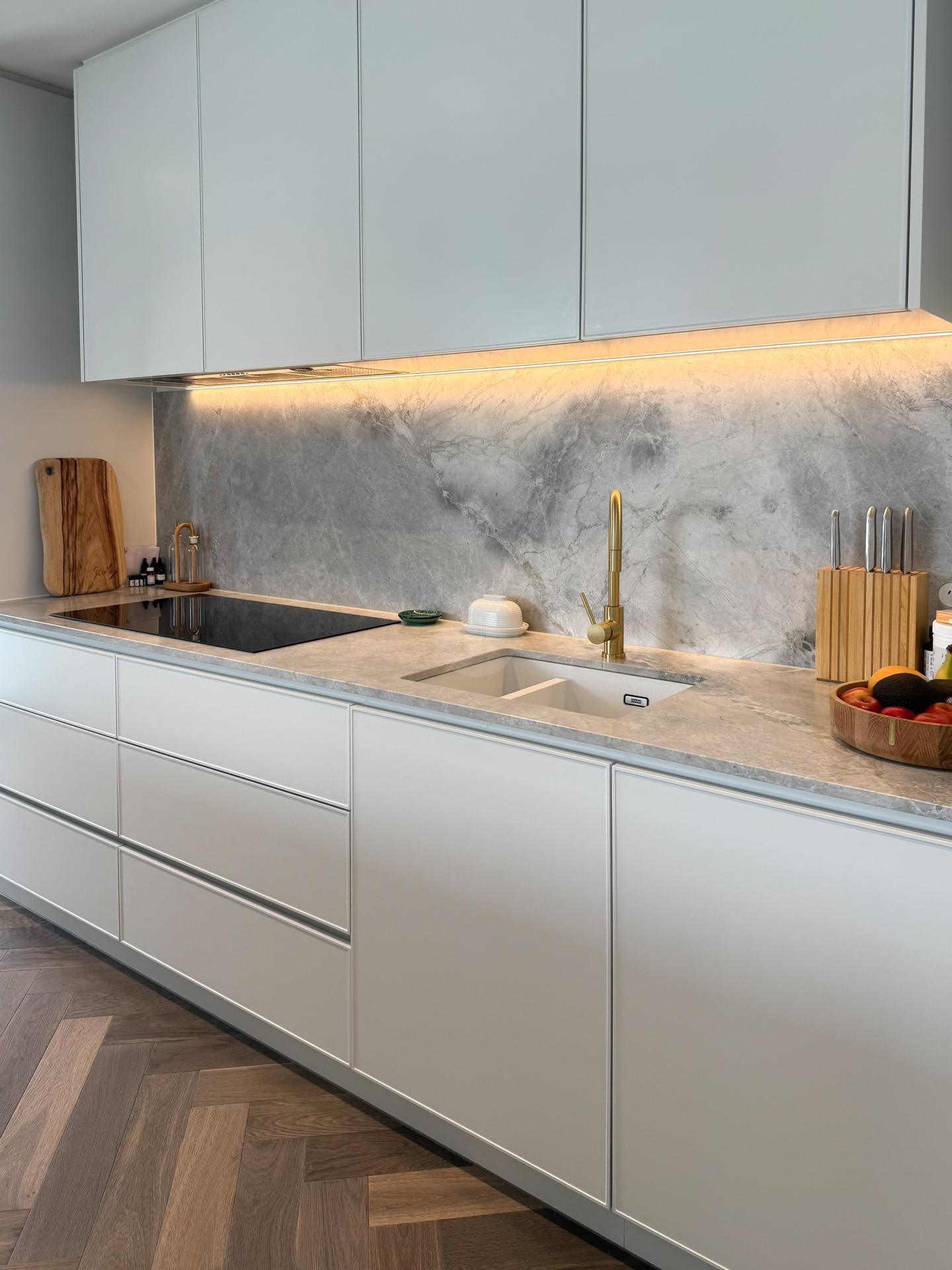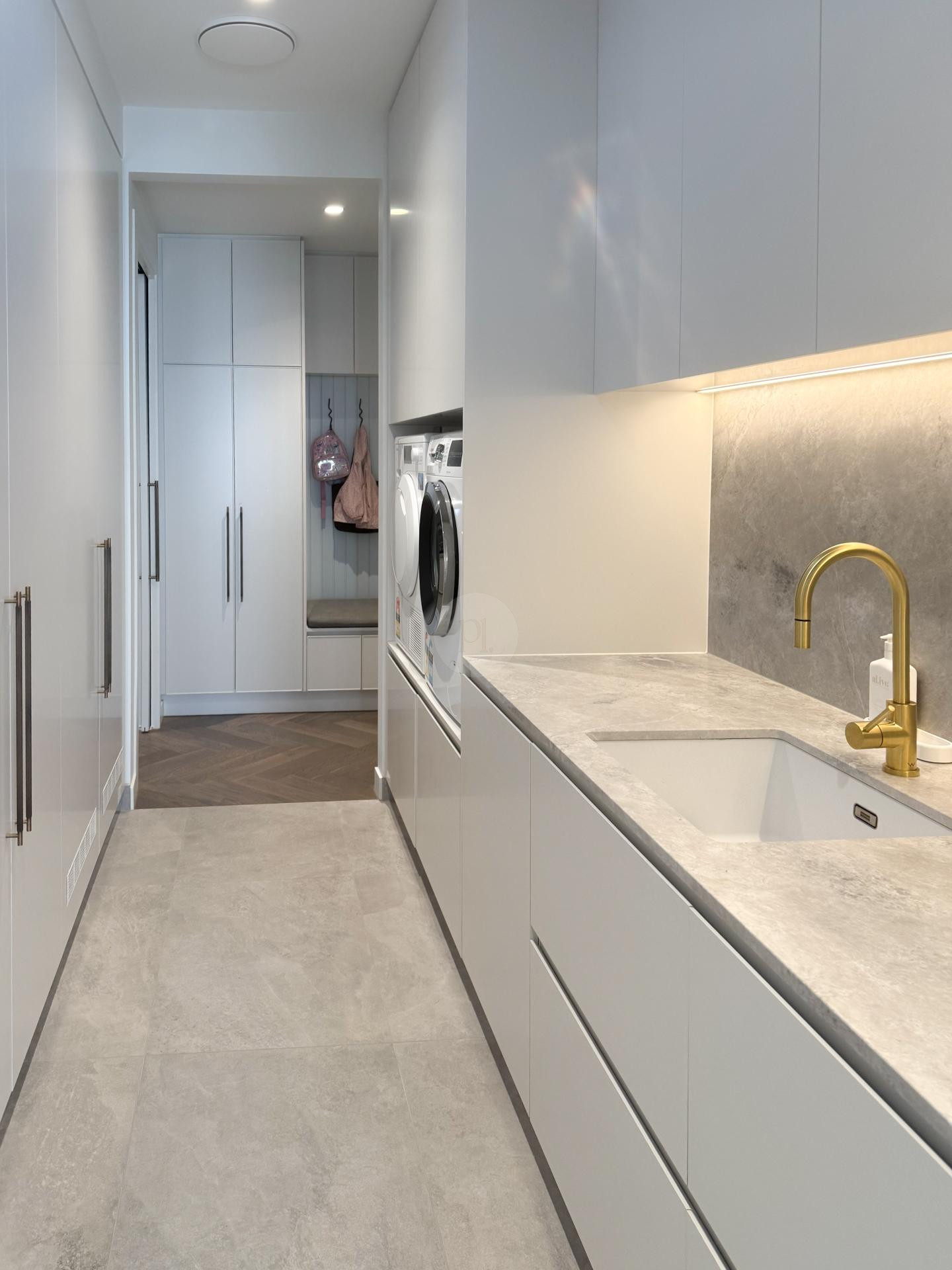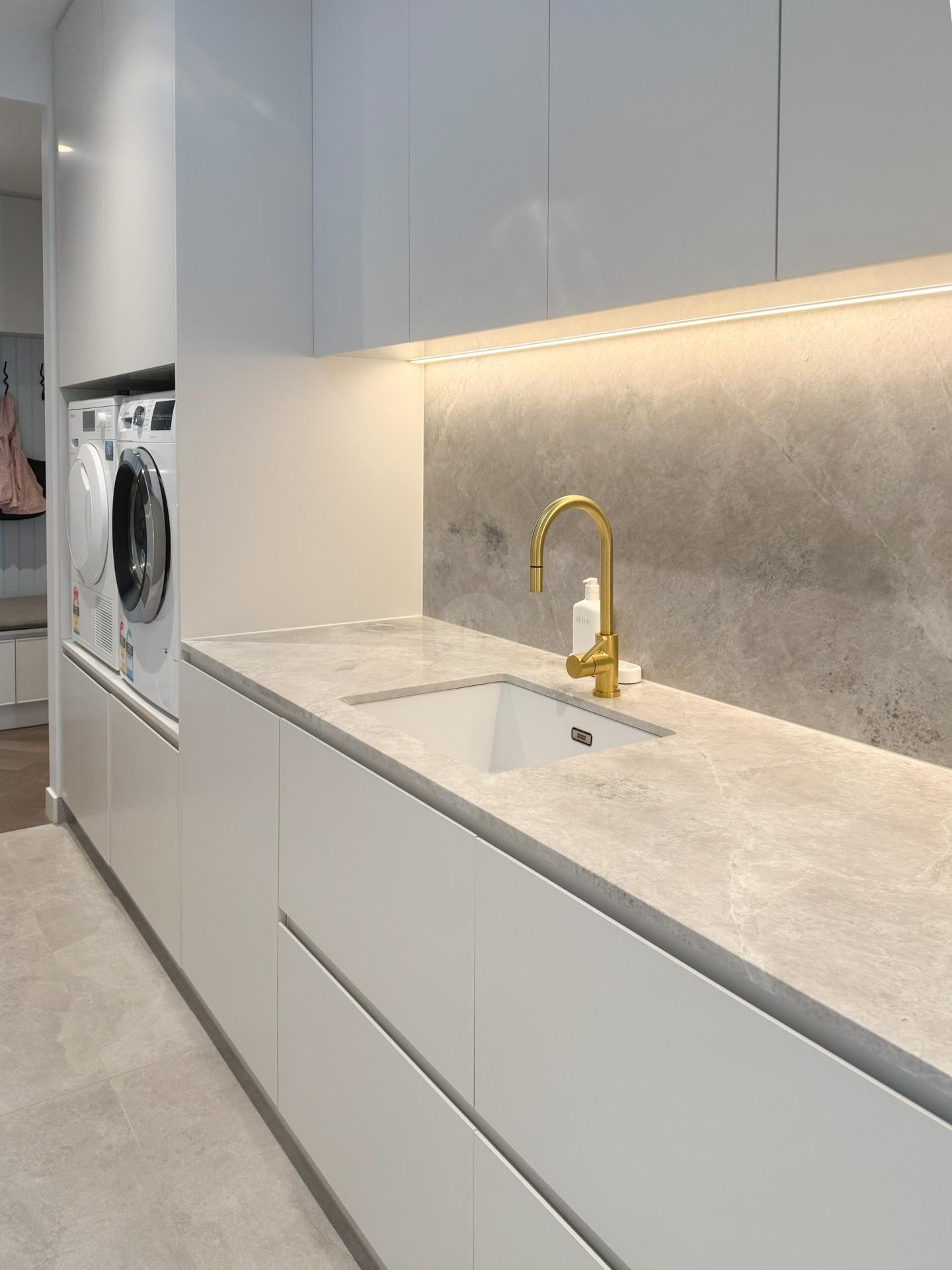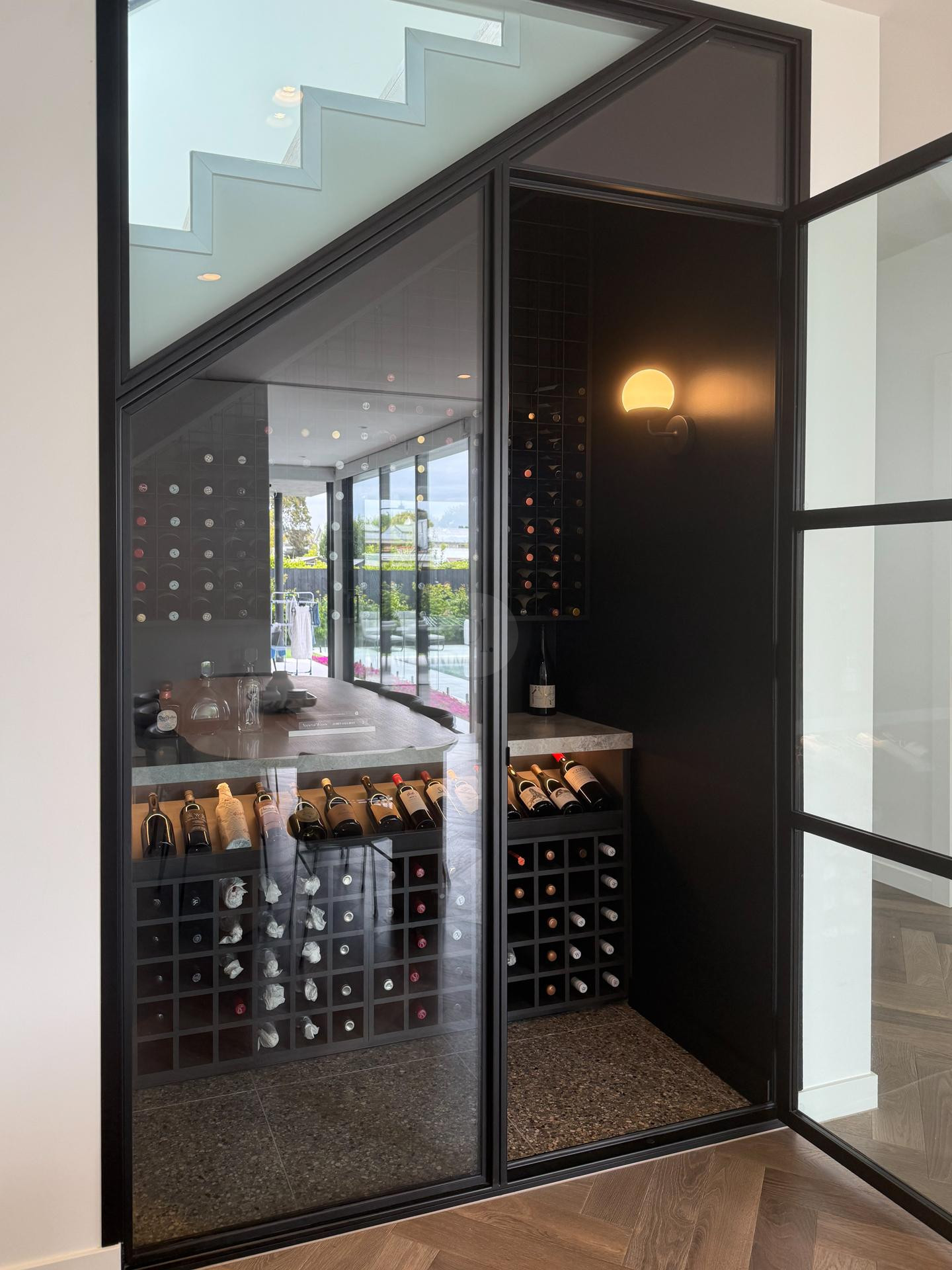 The heart of the home is the beautifully designed kitchen, complete with natural stone bench tops and a striking splashback, making it an ideal setting for culinary-focused shoots. A unique wine cellar under the stairs, secured by a steel frame door, adds a touch of elegance and intrigue.