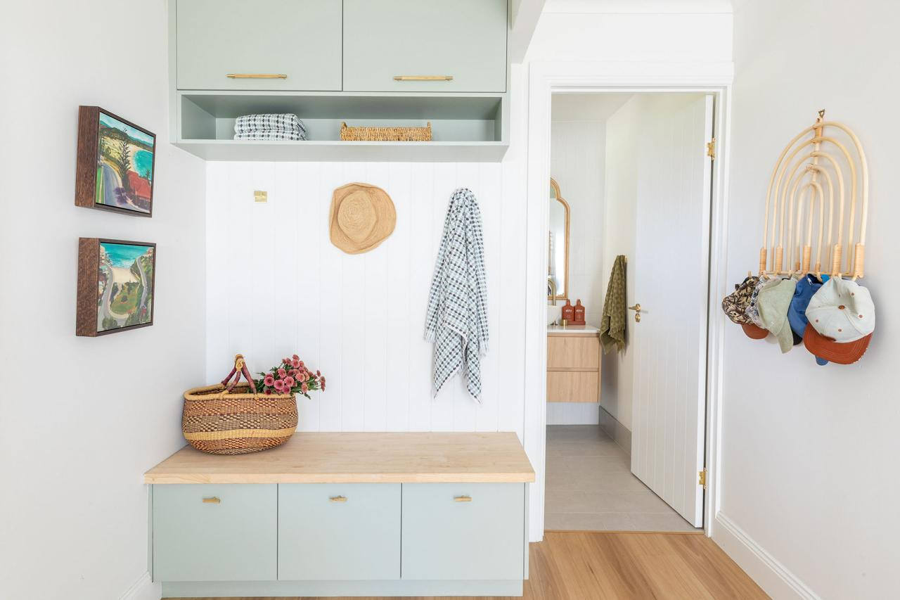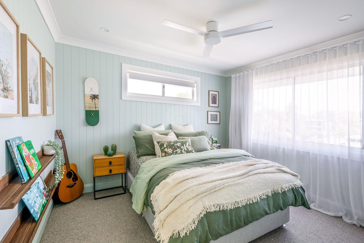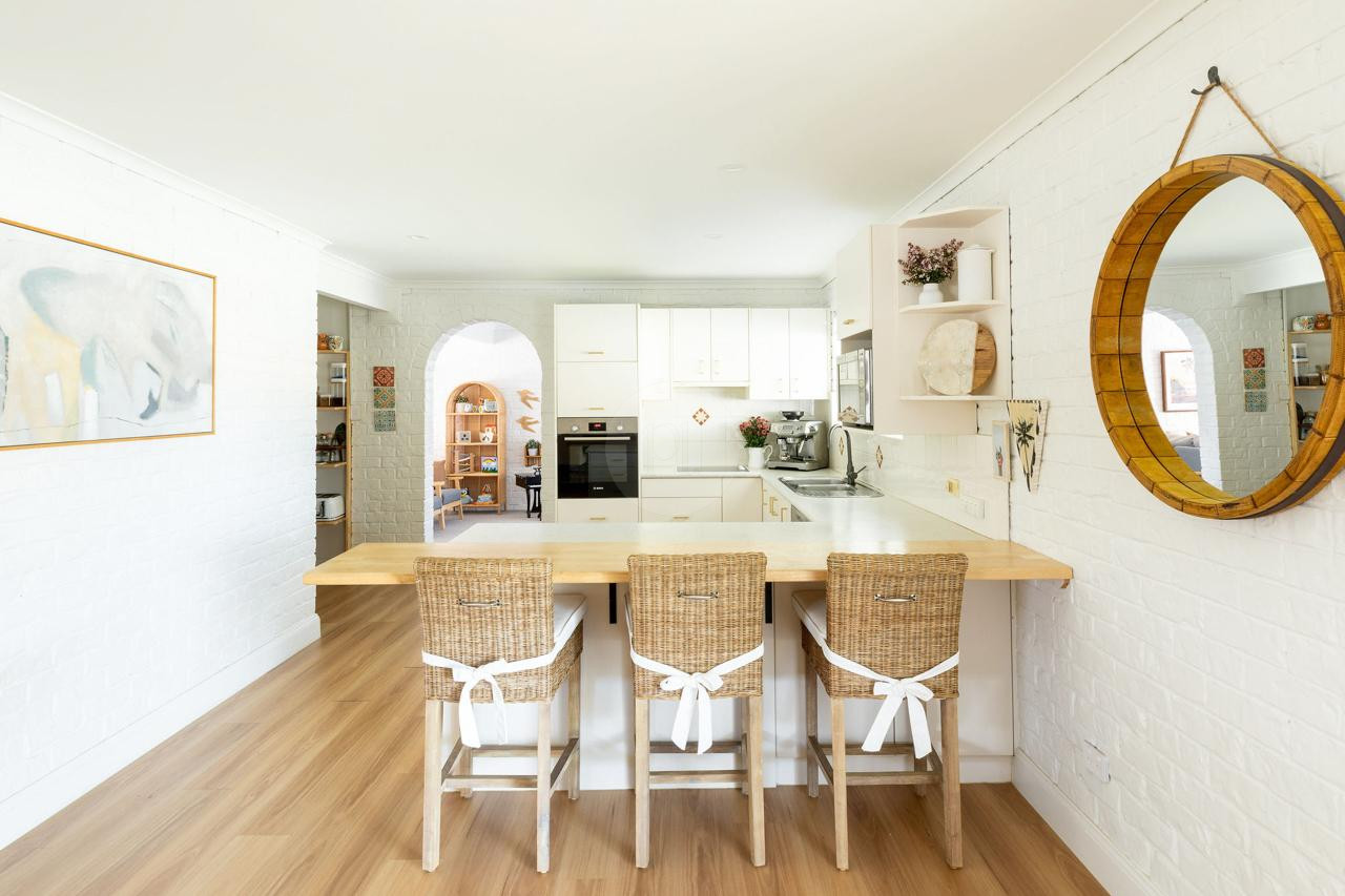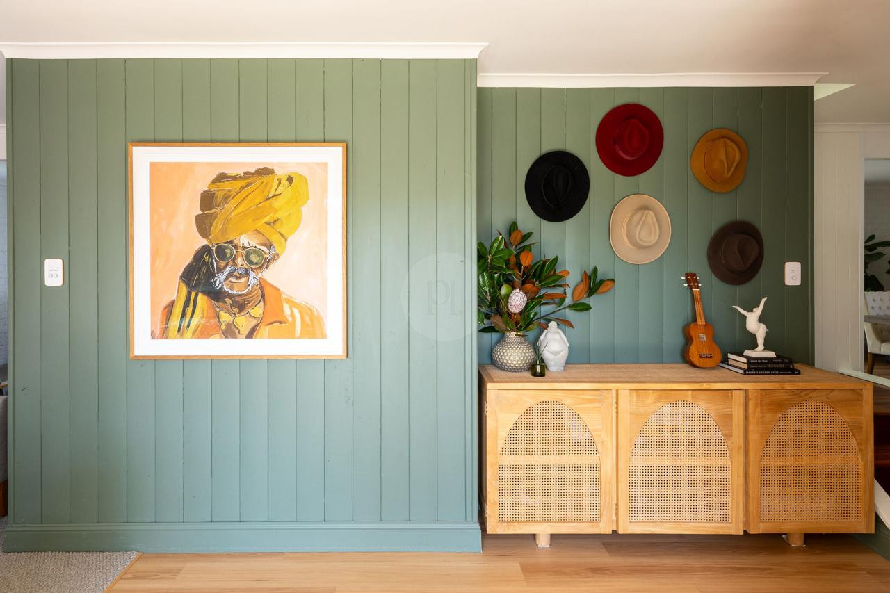 The property features four beautifully appointed bedrooms, each painted in unique, soft tones, pale pink, pale green, and crisp white, offering versatile settings for lifestyle, fashion, and family-oriented shoots. The home includes three designer bathrooms: a striking dark-blue bathroom with finger tiles and arches, a terracotta-toned bathroom with pale white finger tiles, and a third bright white bathroom. A light olive-green feature wall in the main living area adds colour and character to the interior, enhancing the home’s coastal charm. The kitchen is sleek and modern, providing a clean and elegant backdrop for culinary or lifestyle shoots.