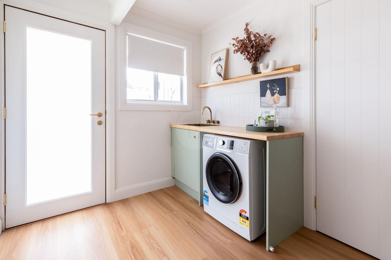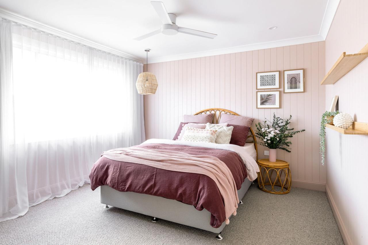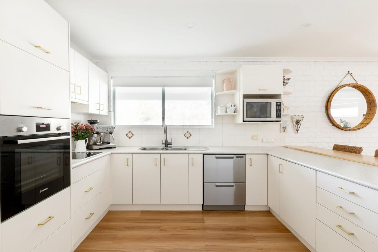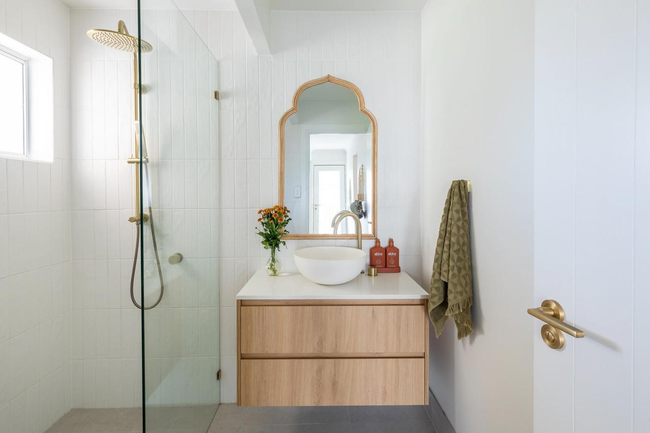 The property features four beautifully appointed bedrooms, each painted in unique, soft tones, pale pink, pale green, and crisp white, offering versatile settings for lifestyle, fashion, and family-oriented shoots. The home includes three designer bathrooms: a striking dark-blue bathroom with finger tiles and arches, a terracotta-toned bathroom with pale white finger tiles, and a third bright white bathroom. A light olive-green feature wall in the main living area adds colour and character to the interior, enhancing the home’s coastal charm. The kitchen is sleek and modern, providing a clean and elegant backdrop for culinary or lifestyle shoots.