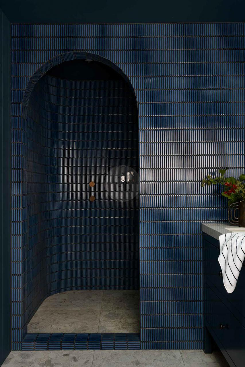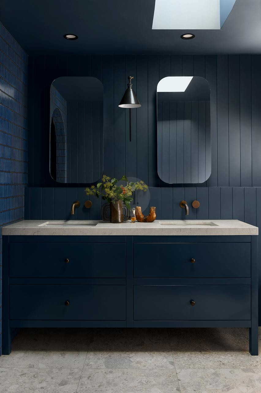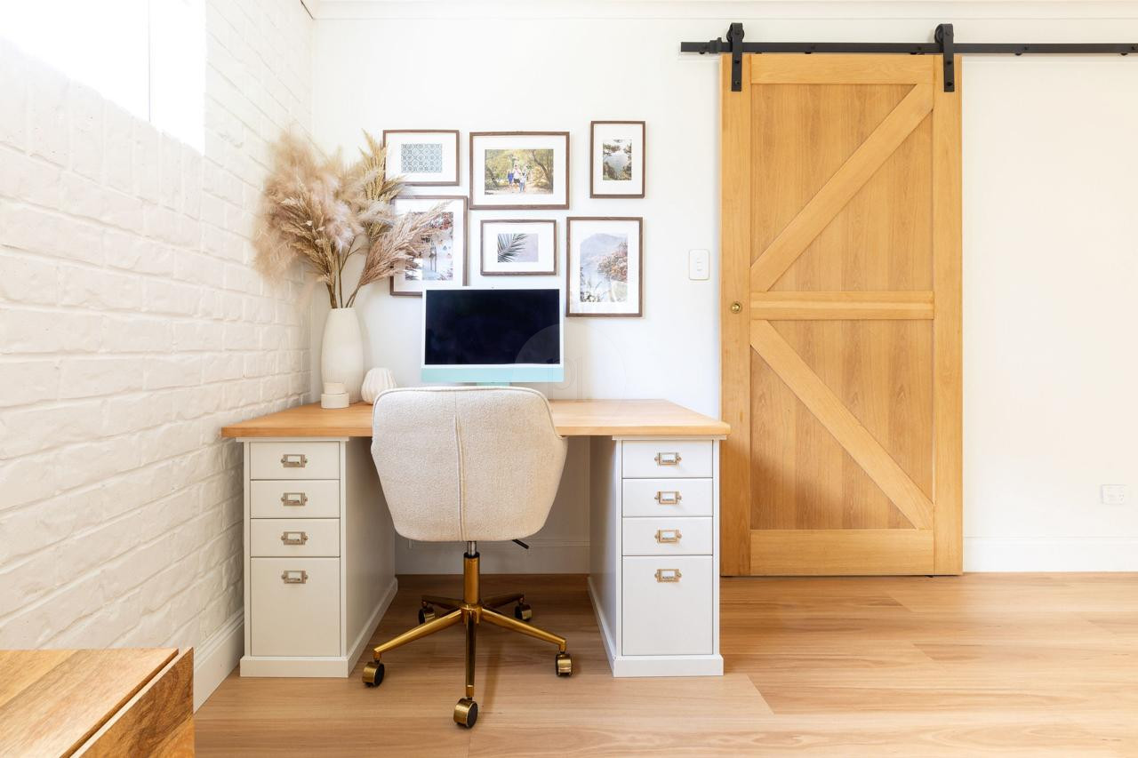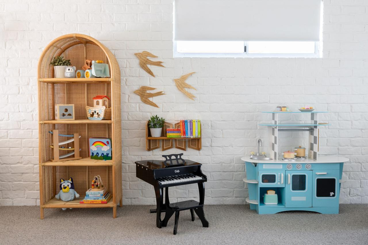 The property features four beautifully appointed bedrooms, each painted in unique, soft tones, pale pink, pale green, and crisp white, offering versatile settings for lifestyle, fashion, and family-oriented shoots. The home includes three designer bathrooms: a striking dark-blue bathroom with finger tiles and arches, a terracotta-toned bathroom with pale white finger tiles, and a third bright white bathroom. A light olive-green feature wall in the main living area adds colour and character to the interior, enhancing the home’s coastal charm. The kitchen is sleek and modern, providing a clean and elegant backdrop for culinary or lifestyle shoots.