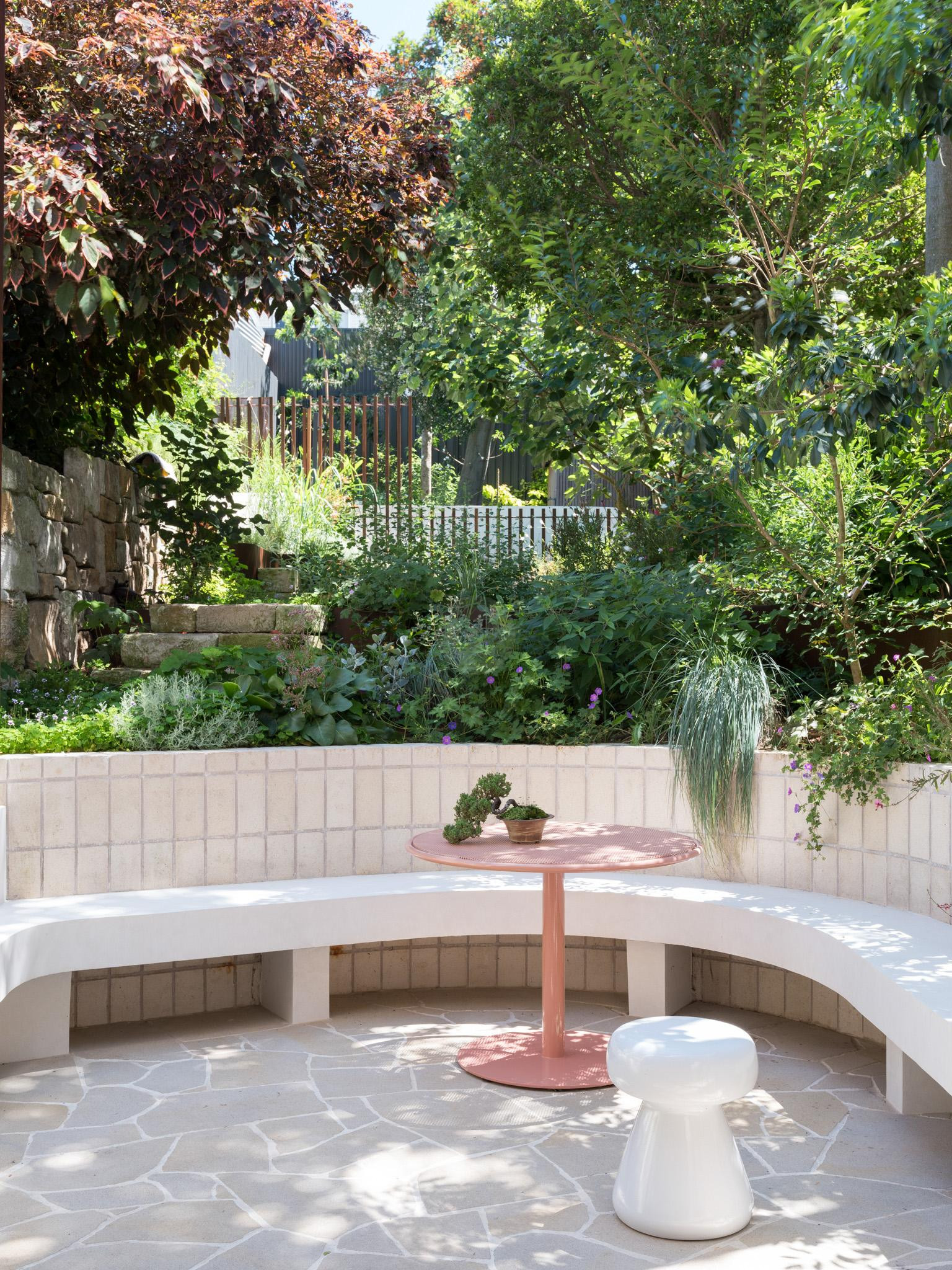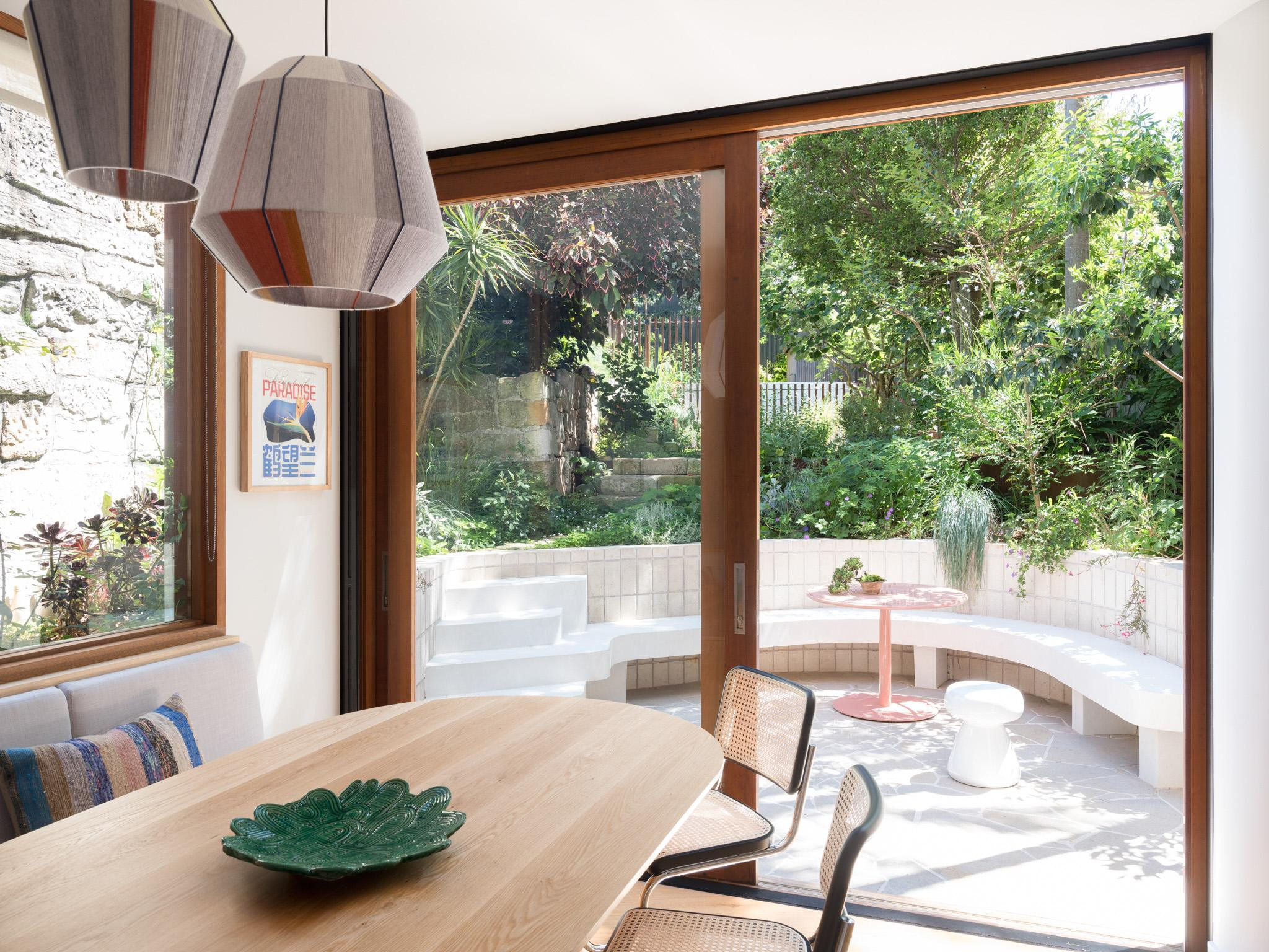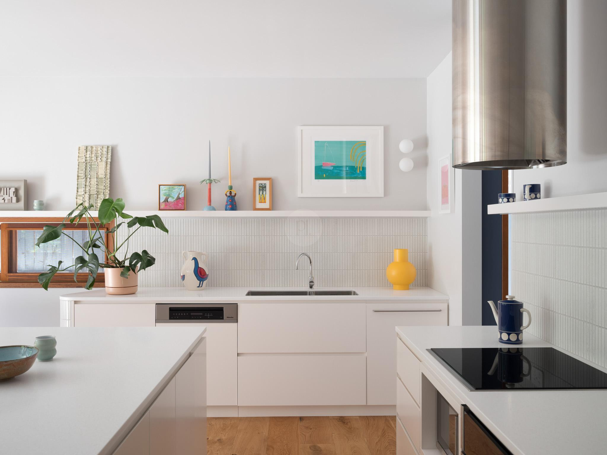 The Curve also features four beautifully appointed bedrooms and three stylish bathrooms, each thoughtfully designed with calming tones and quirky artwork that enhance the home’s character. The kitchen, with its bespoke banquette seating and custom table, is north-facing, offering a warm and inviting atmosphere.