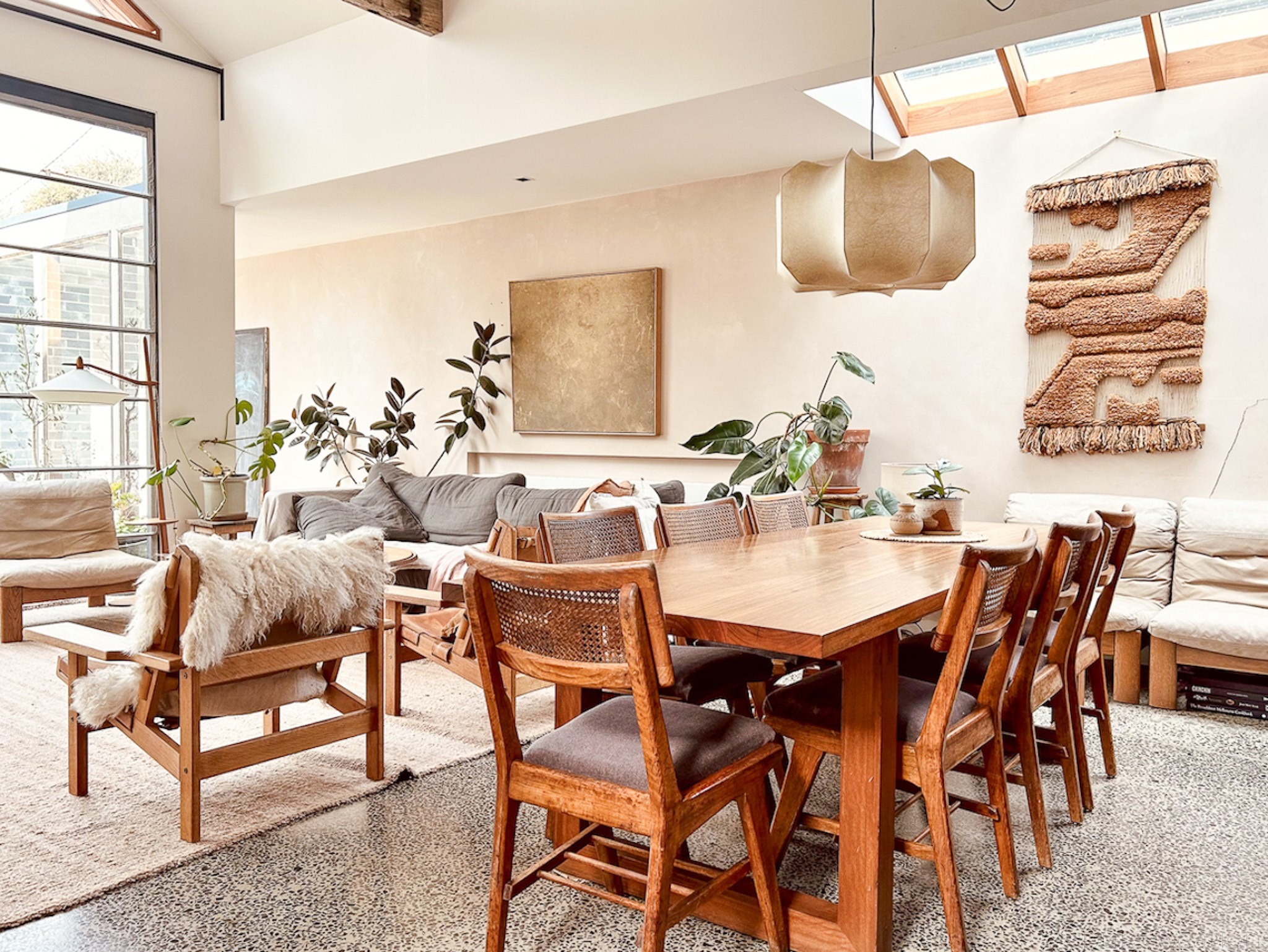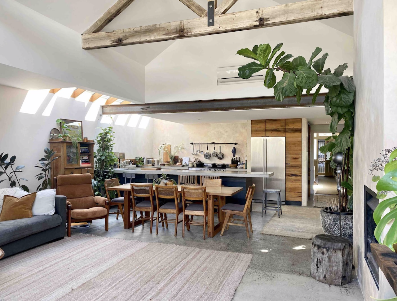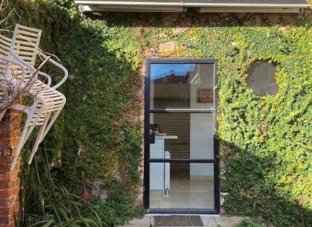 The Architectural house and garden studio includes 3 bedrooms, 2 bathrooms and a rustic farmhouse kitchen with timber cabinetry, concrete benchtops and flooring, black tapware, two ovens and a gas cooktop. The industrial loft style windows and peaked ceiling in the main living room flood the home with light and allow lovely views out to the courtyard.