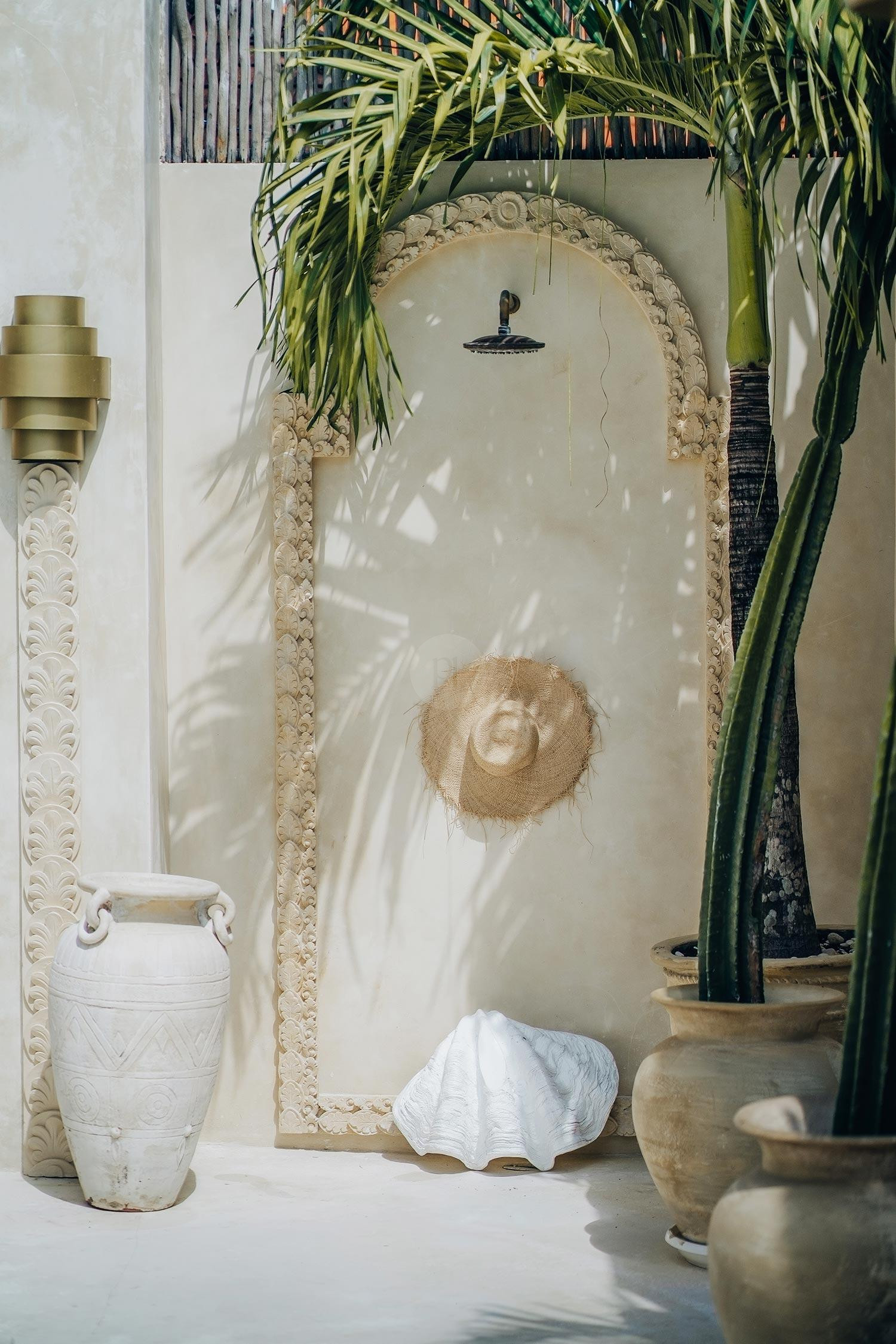 Outdoors, the allure continues with palm trees swaying gently in the breeze, a refreshing pool perfect for those sun-soaked shots, and a balcony that offers breathtaking views. The outdoor living area is ideal for capturing the essence of Bali’s natural beauty, while the outdoor shower adds a touch of exotic charm.
