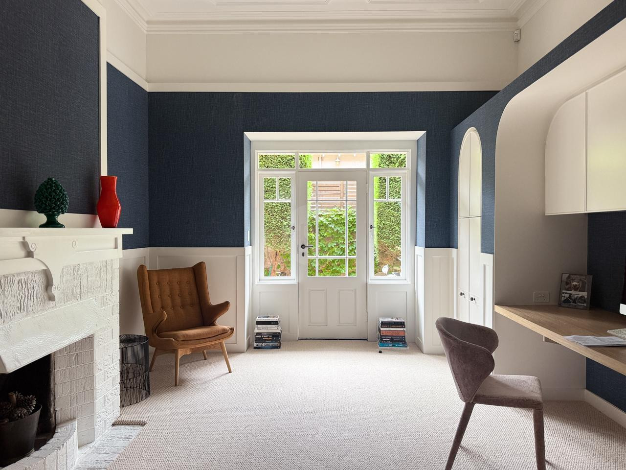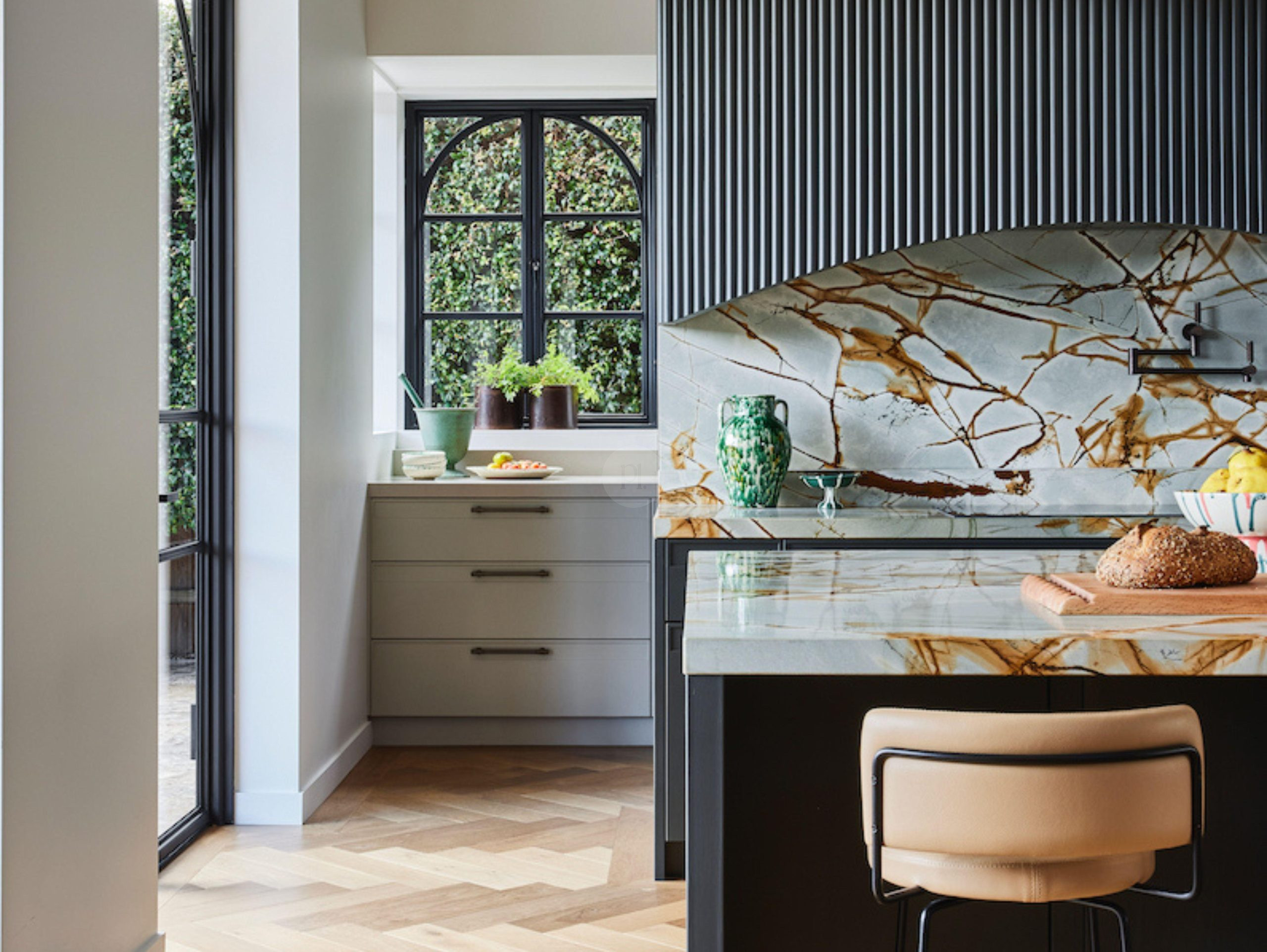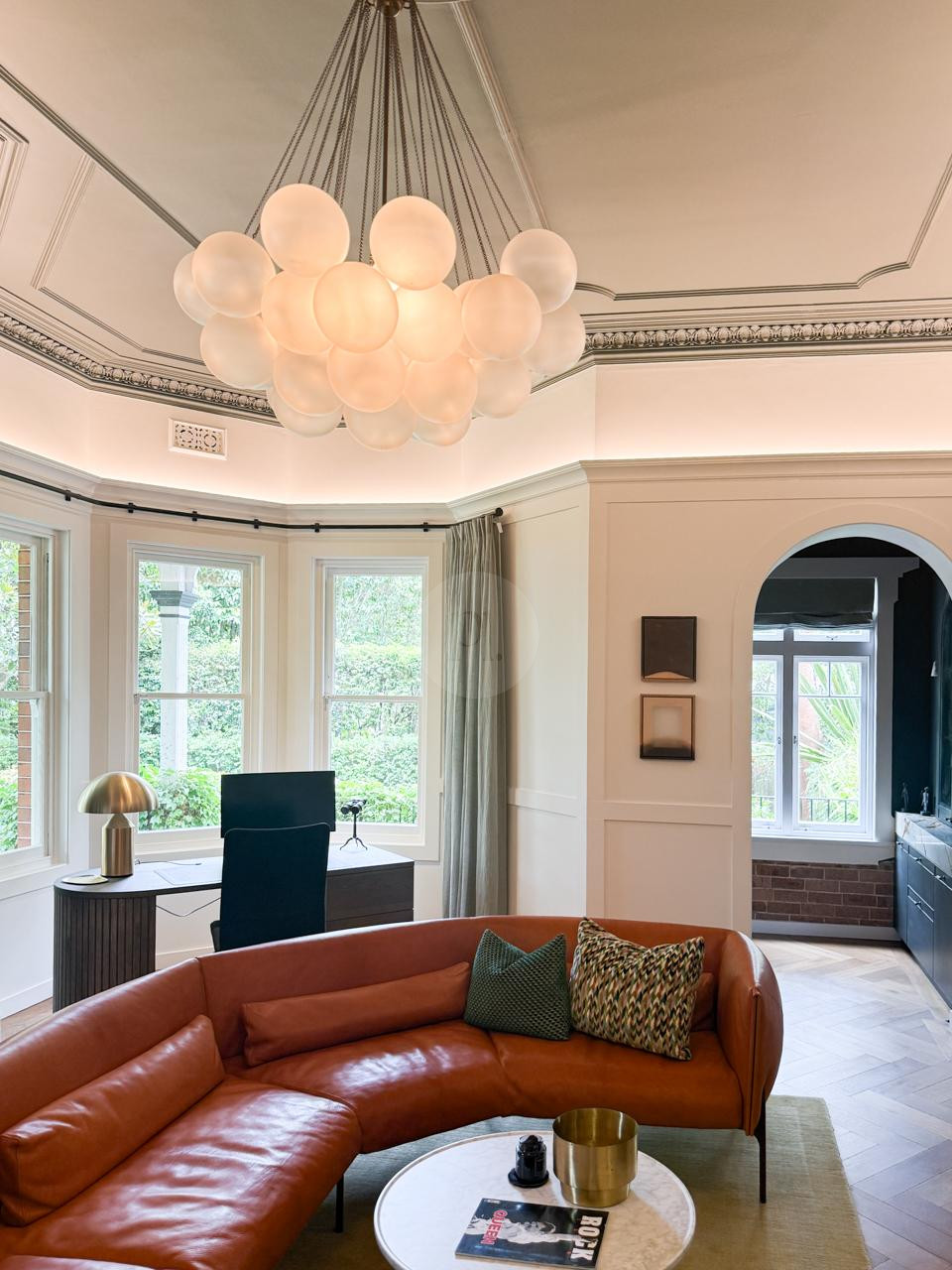 As you enter, you are greeted by a blend of elegance and functionality. The decorative ceiling roses and wainscoting throughout both levels of the home highlight the estate’s period details, while the bold, colourful, contemporary styling choices add a touch of playfulness – these include exposed brickwork, luxe wallpaper selections, an extensive art collection, a pink walk-in-robe off the master bedroom, and green and blue tile selections in the bathrooms. The open-plan living area seamlessly connects to a stunning kitchen with herringbone floors, striking marble bench tops and black cabinetry, ideal for lifestyle and retail brands seeking a bold space to create unforgettable content.