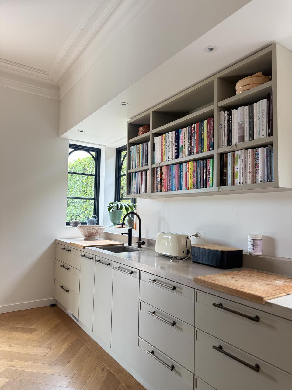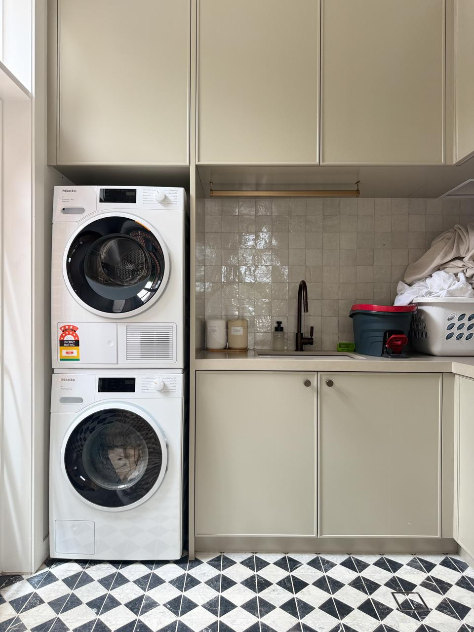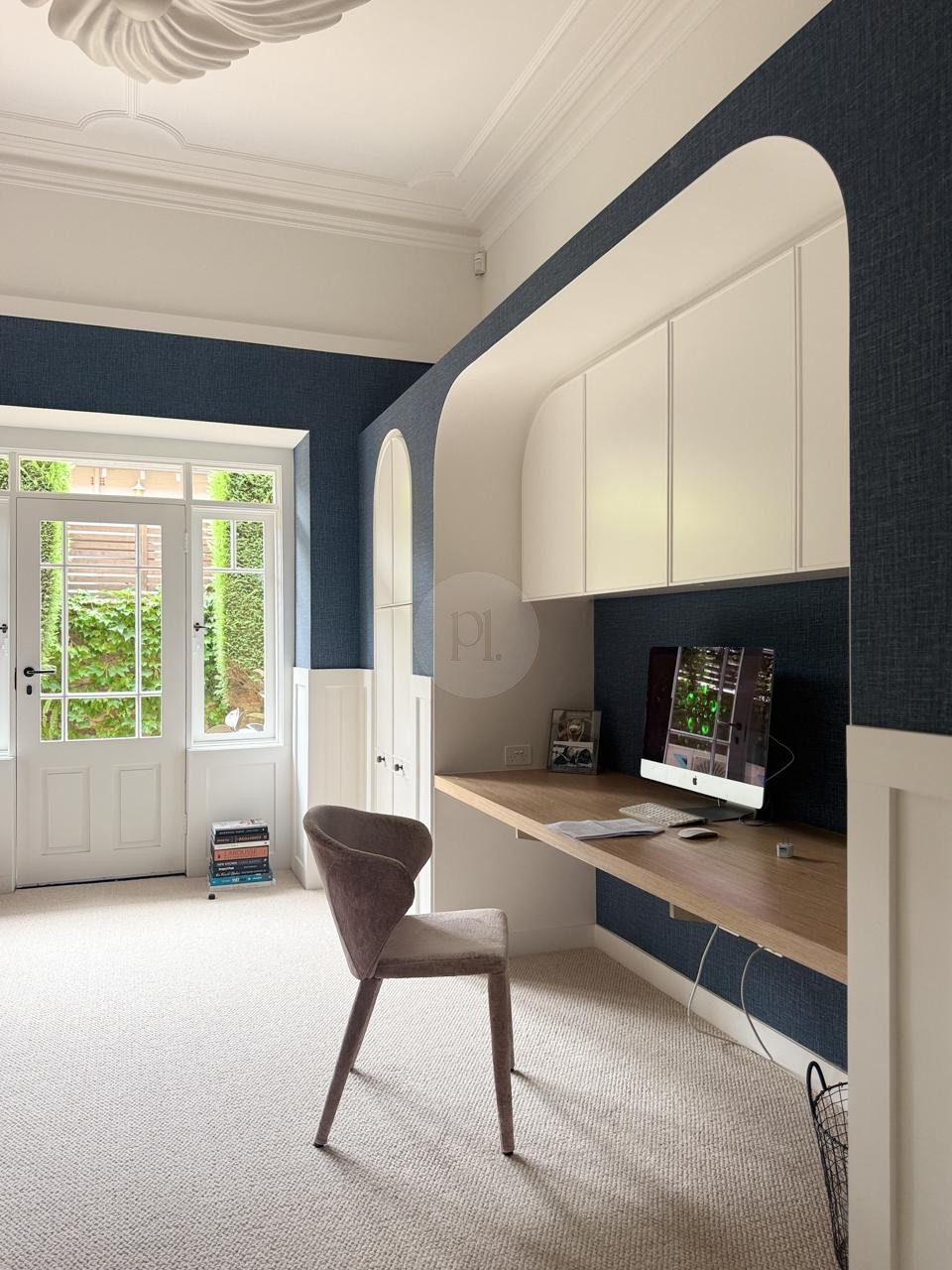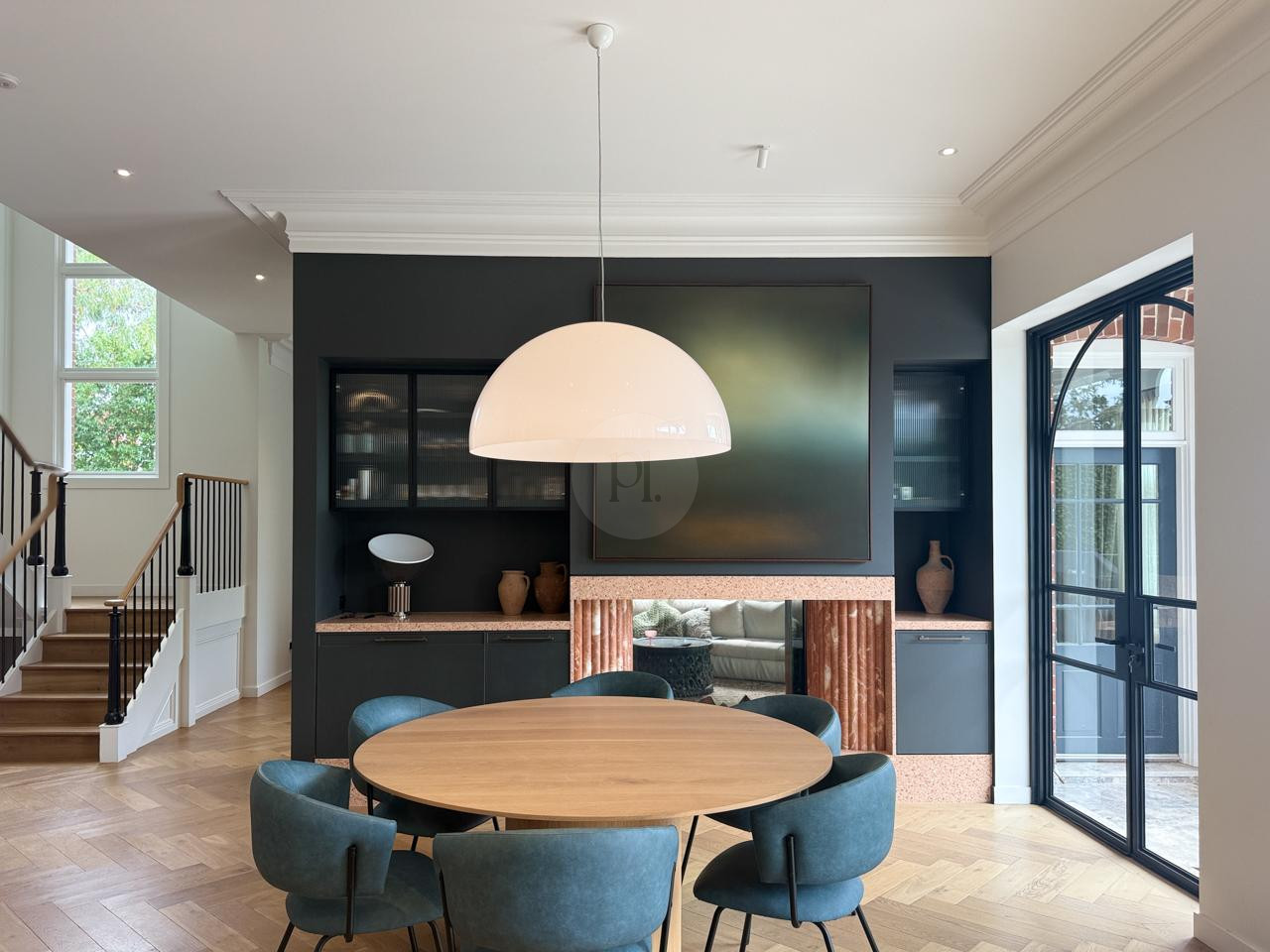 As you enter, you are greeted by a blend of elegance and functionality. The decorative ceiling roses and wainscoting throughout both levels of the home highlight the estate’s period details, while the bold, colourful, contemporary styling choices add a touch of playfulness – these include exposed brickwork, luxe wallpaper selections, an extensive art collection, a pink walk-in-robe off the master bedroom, and green and blue tile selections in the bathrooms. The open-plan living area seamlessly connects to a stunning kitchen with herringbone floors, striking marble bench tops and black cabinetry, ideal for lifestyle and retail brands seeking a bold space to create unforgettable content.