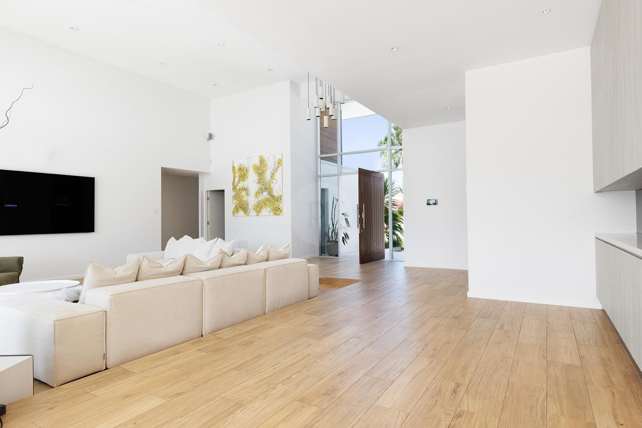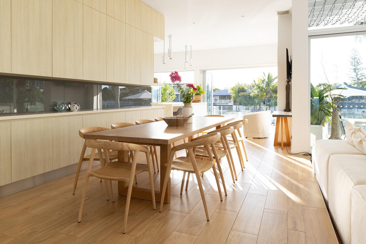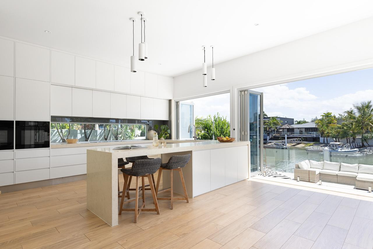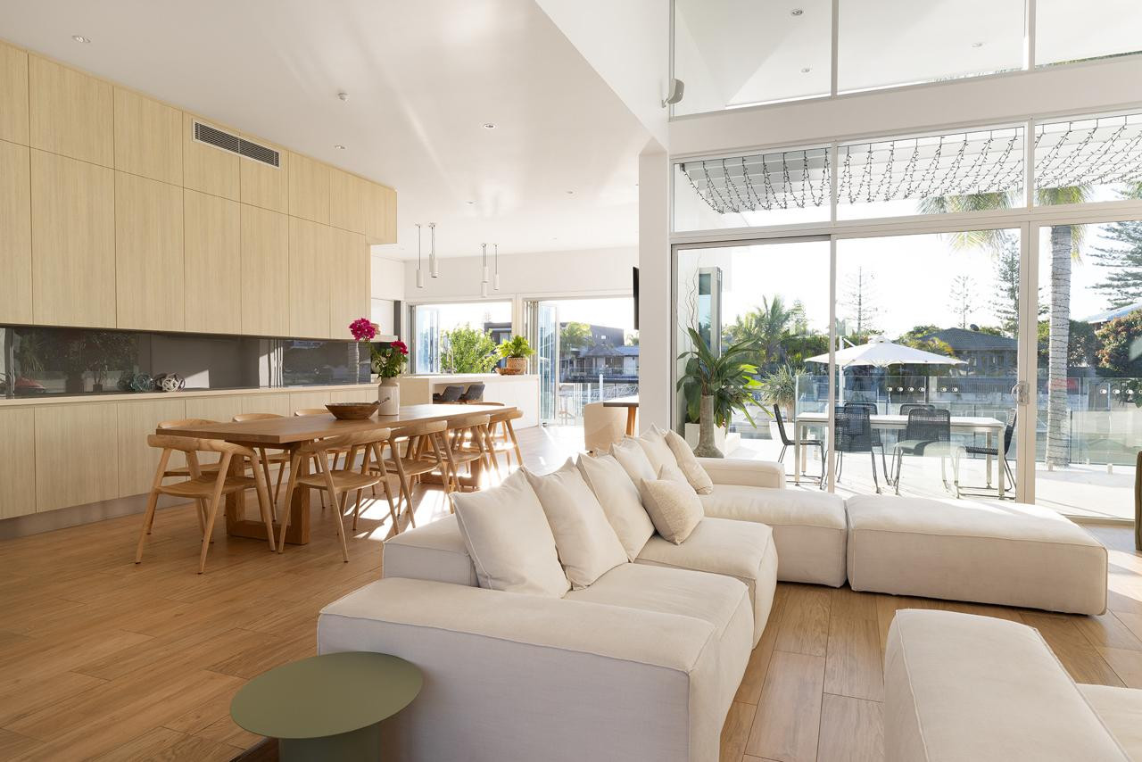 With its stunning water views and high ceilings, the open plan layout seamlessly merges spacious lounge, dining, and family areas with inviting outdoor entertaining spaces. Expansive floor-to-ceiling windows flood the interiors with natural light, creating a warm and welcoming atmosphere.