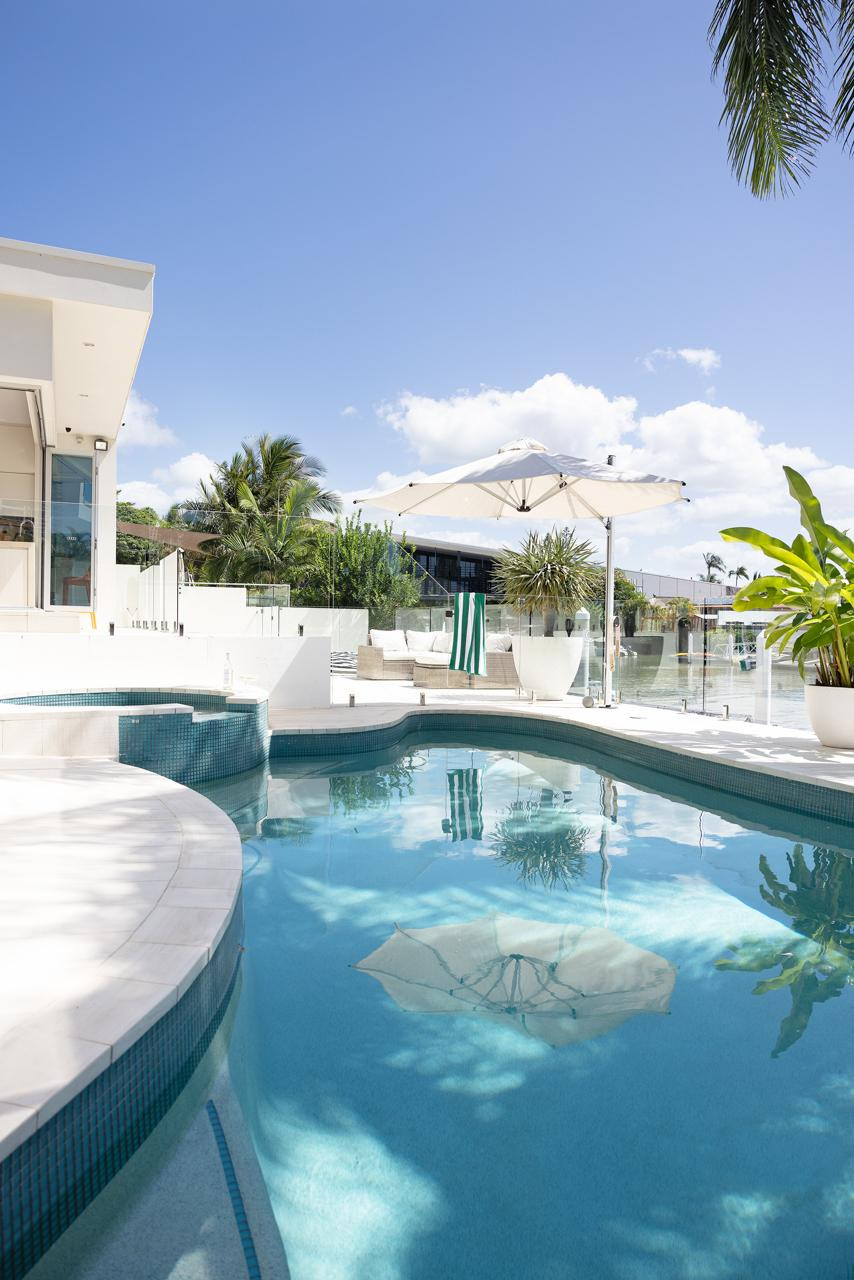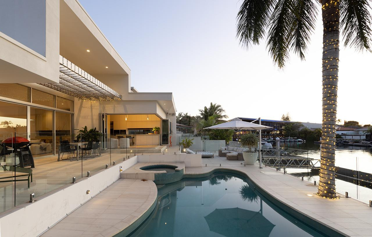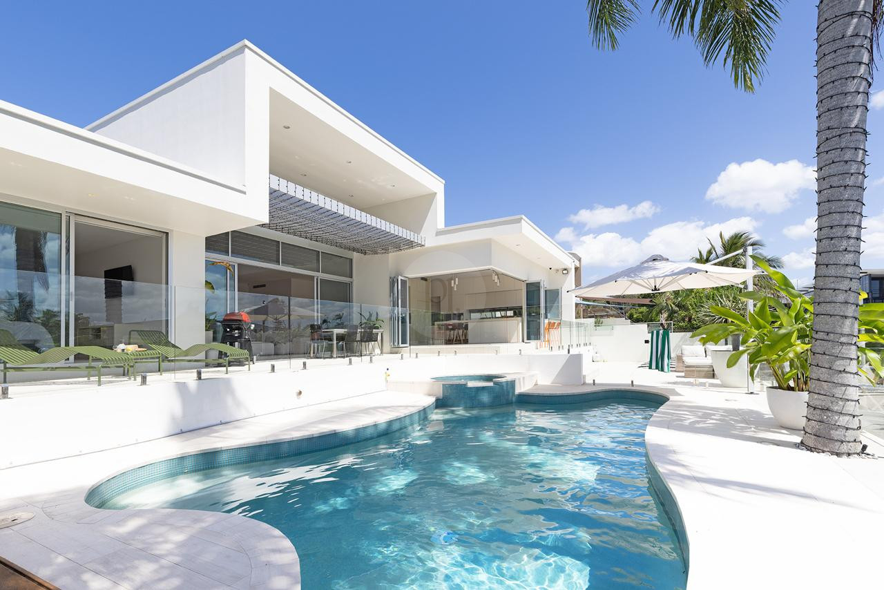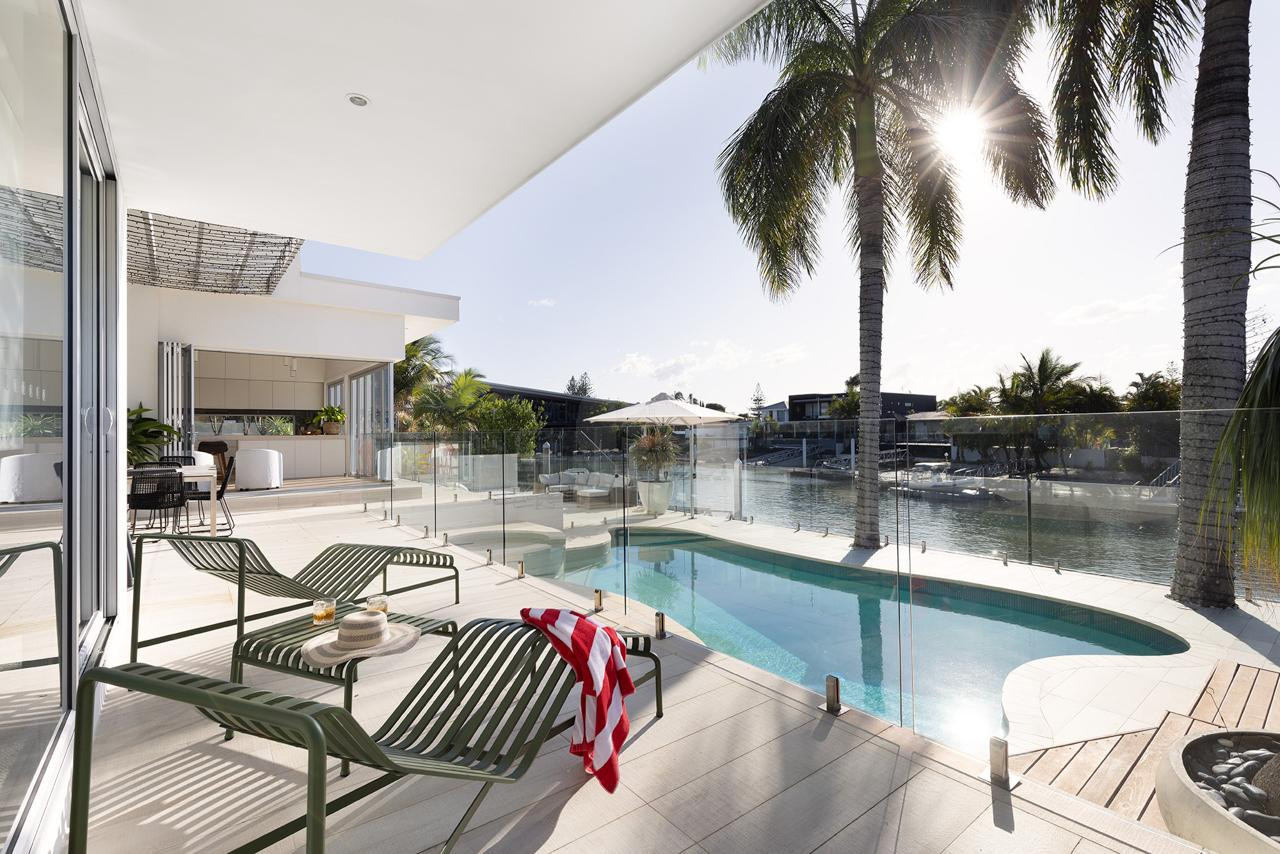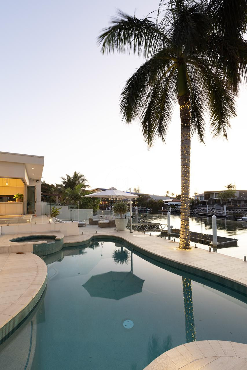 Outdoor living is a highlight at The Sun Club, with a sparkling pool, rejuvenating spa, and a private pontoon at the rear, perfect for capturing those lifestyle shoots, soaking up the sun by the water. Surrounded by lush palm trees and a beautifully crafted pool deck, this home offers an idyllic setting for photoshoots, TVC, and filming, capturing the essence of luxurious coastal living.