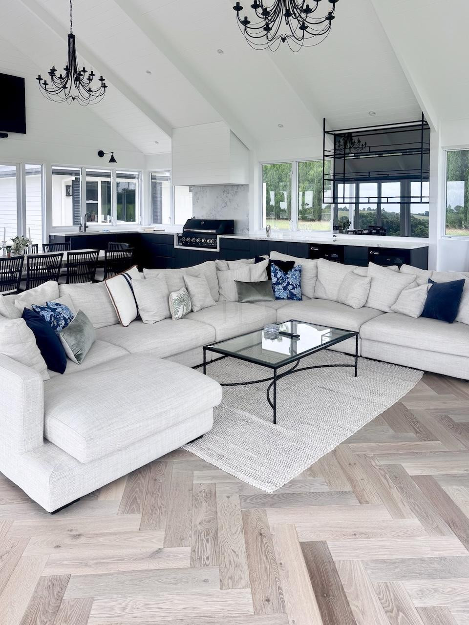 In addition to the main home, the estate also has a seperate entertaining wing that is conveniently linked to the rest of the home and also large in scale. With high raked ceilings, another striking floor to ceiling stone clad open fireplace, and 2 beautiful Italian chandeliers overhead, this space stands on its own as another great shoot area, no matter your brief. It also offers additional room for production setups, HMUA and wardrobe where needed, especially for larger cast and crew.