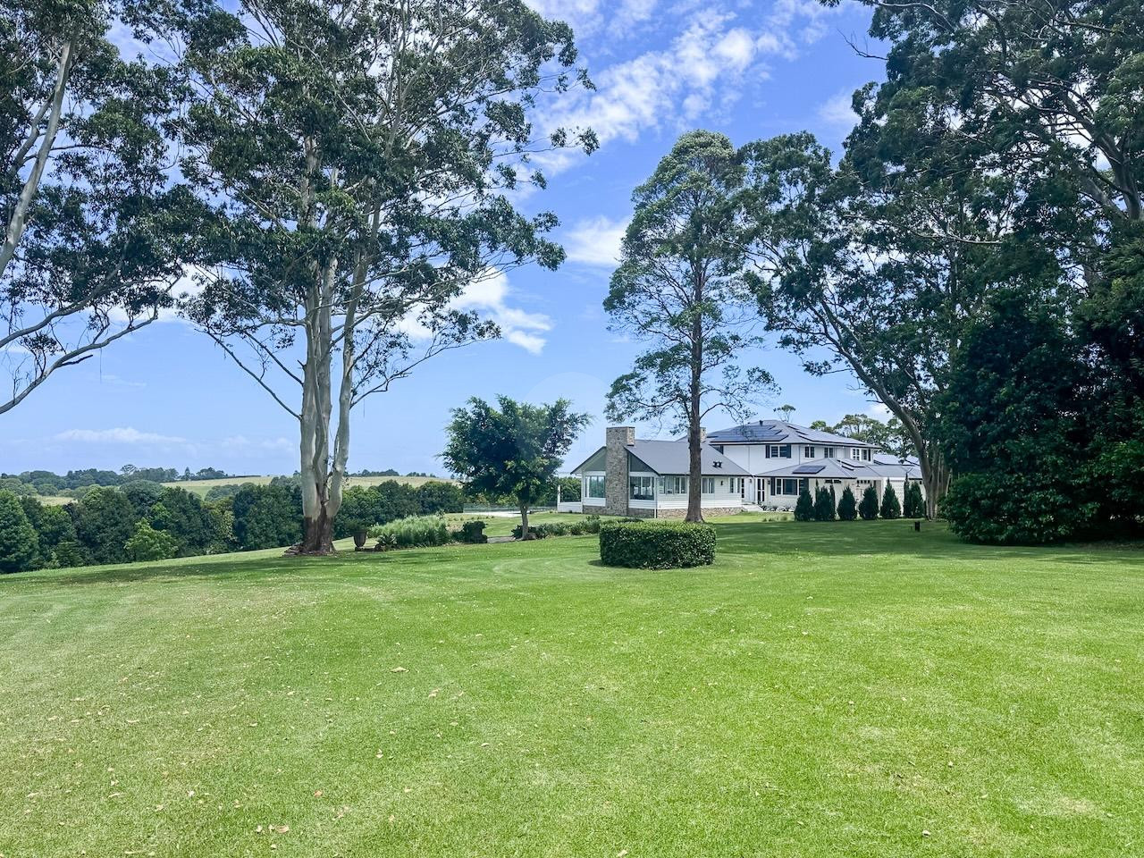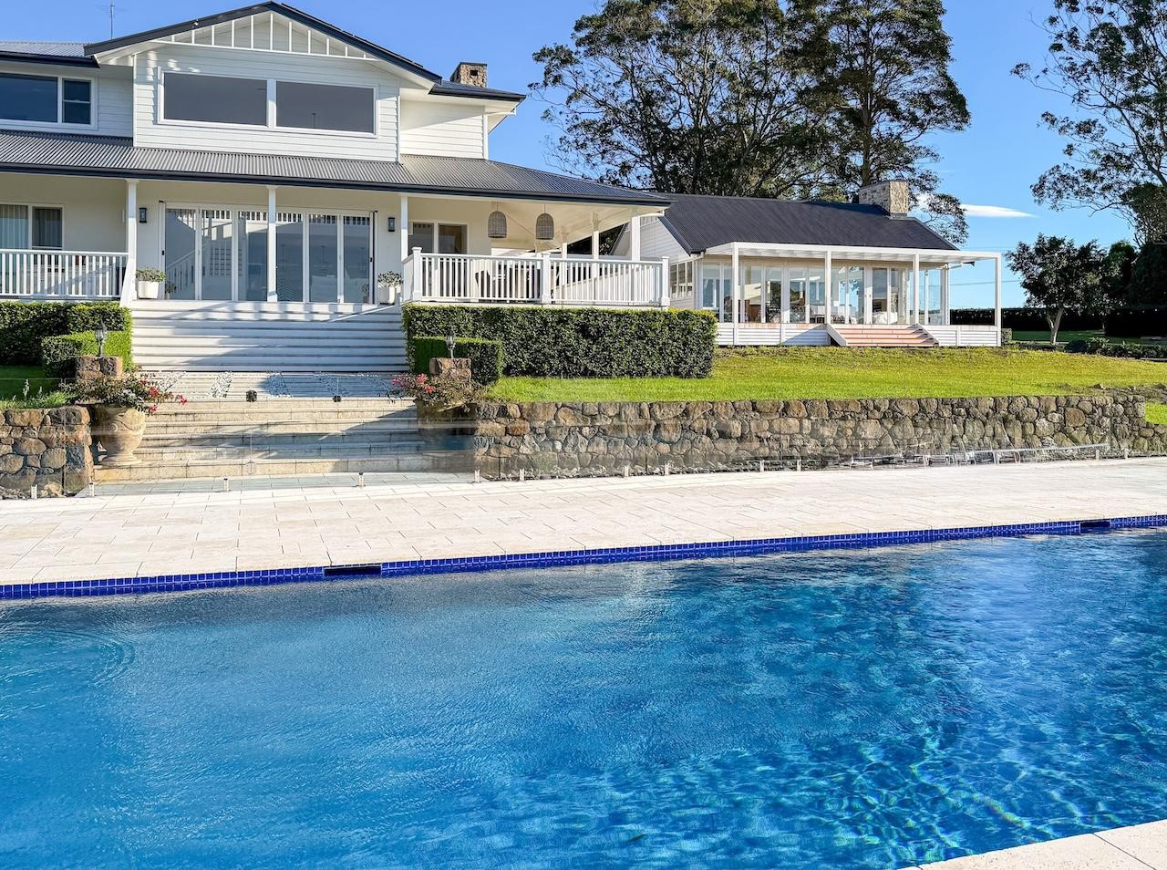 The property is accessed via a tree lined driveway, and once you arrive at the main homestead you are greeted by wide wrap-around verandahs that frame sweeping views of the hinterland. Outdoor areas include established gardens, manicured hedges, mature trees, and multiple parkland-style areas, adding to the scenic and serene atmosphere of the property. There is also a large in-ground pool and outdoor area, both offering glimpses of the ocean and an idyllic backdrop for summer campaigns, wellness shoots, or product launches.