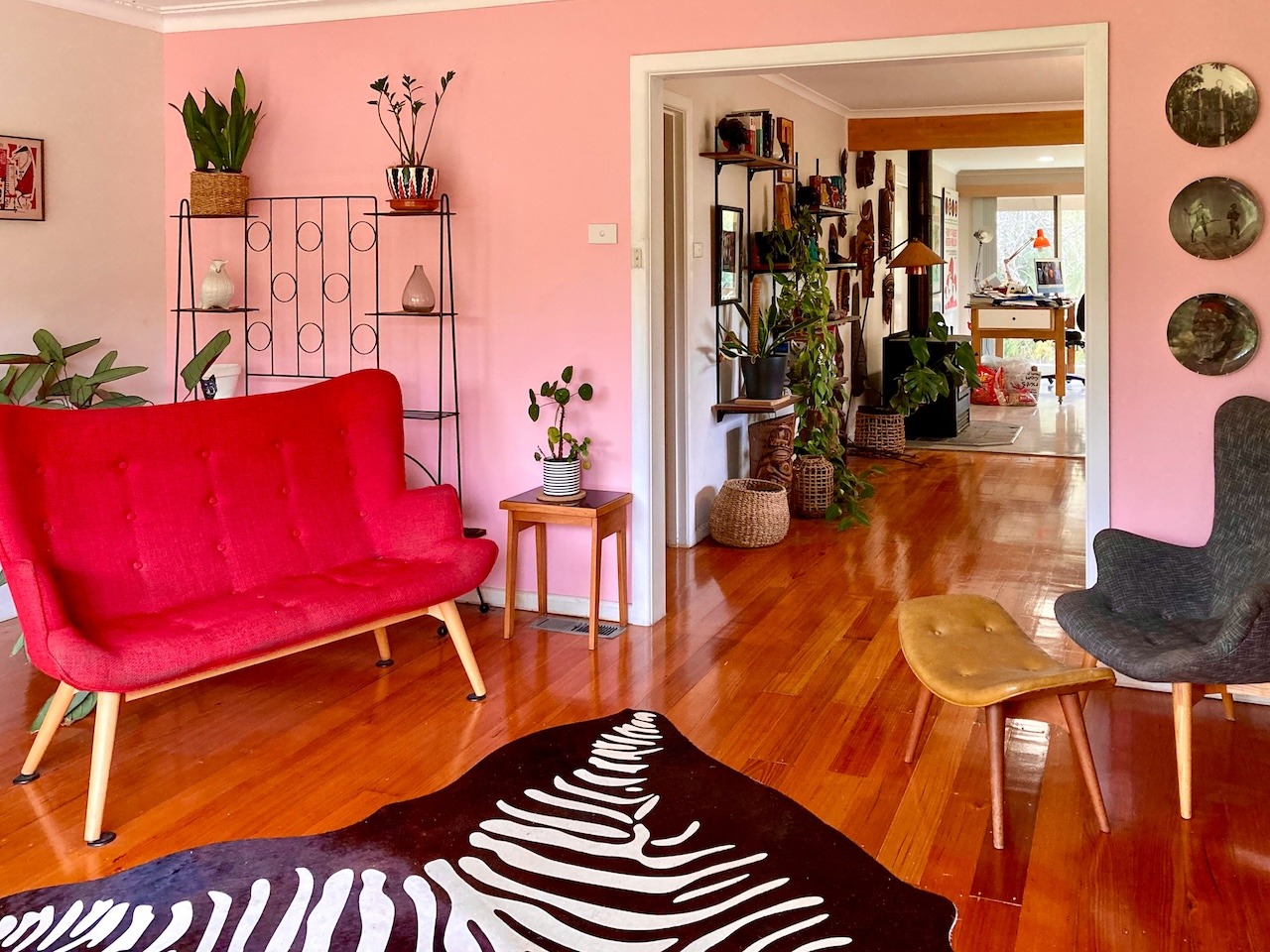 The home’s interior is vibrant and fun, with mid-century furnishings and period correct fixtures featured throughout. This location offers a variety of retro aesthetic zones including exposed brick walls, a peach kitchen and bathroom, cool tiki inspired shack situated by the solar-heated kidney shaped pool, extensive gardens, and it’s very own creek.