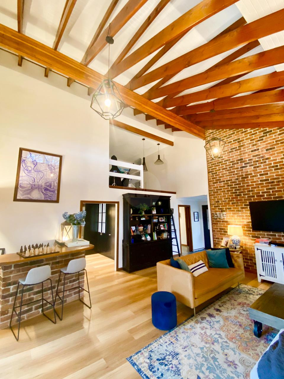 The heart of the home features a stunning kitchen, adding contrast and modern elegance to the property’s original textures. A beautifully renovated bathroom, original bar, and newly installed wood-fired stove bring warmth and atmosphere, creating a space that feels both nostalgic and refined.
