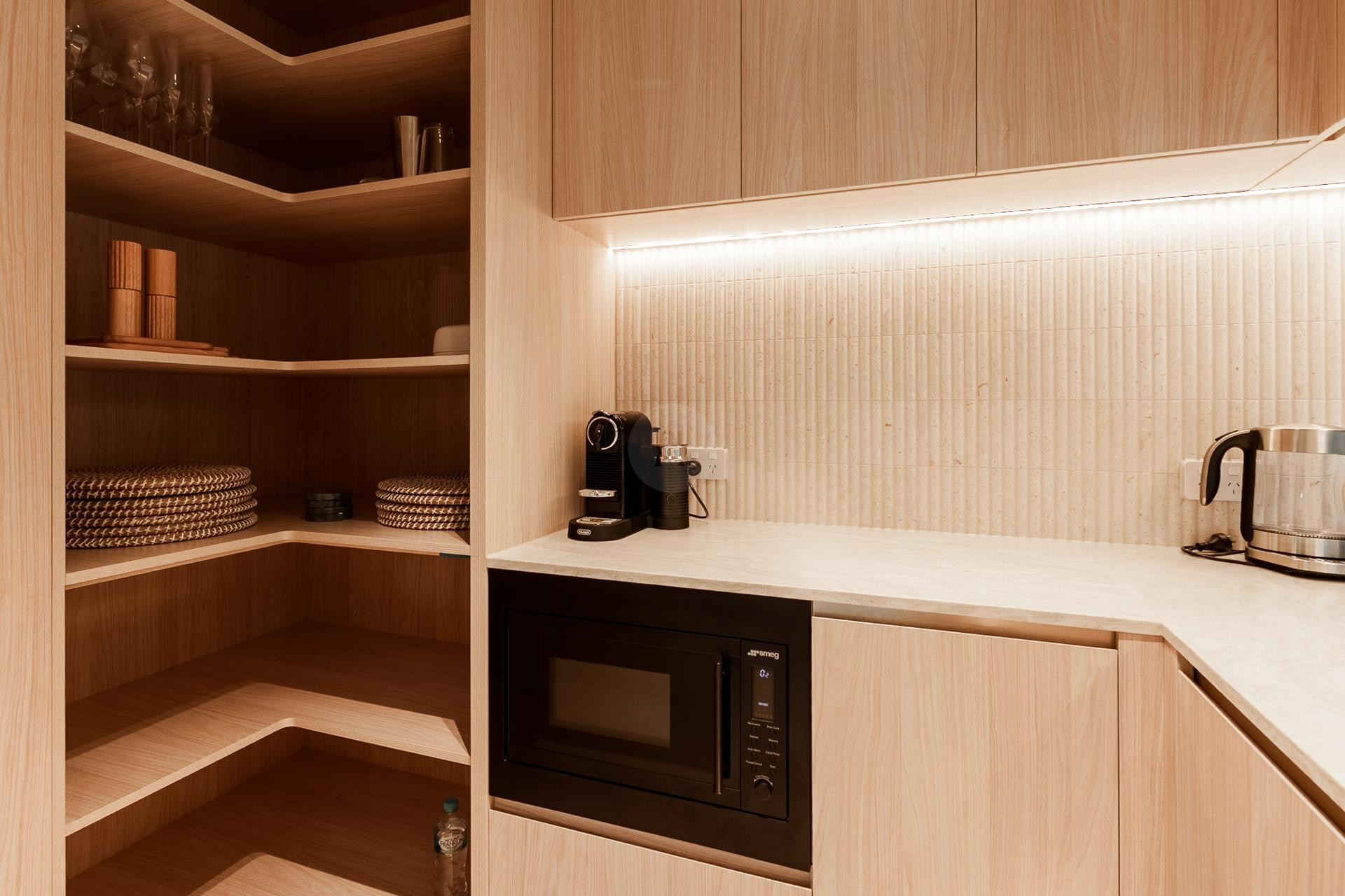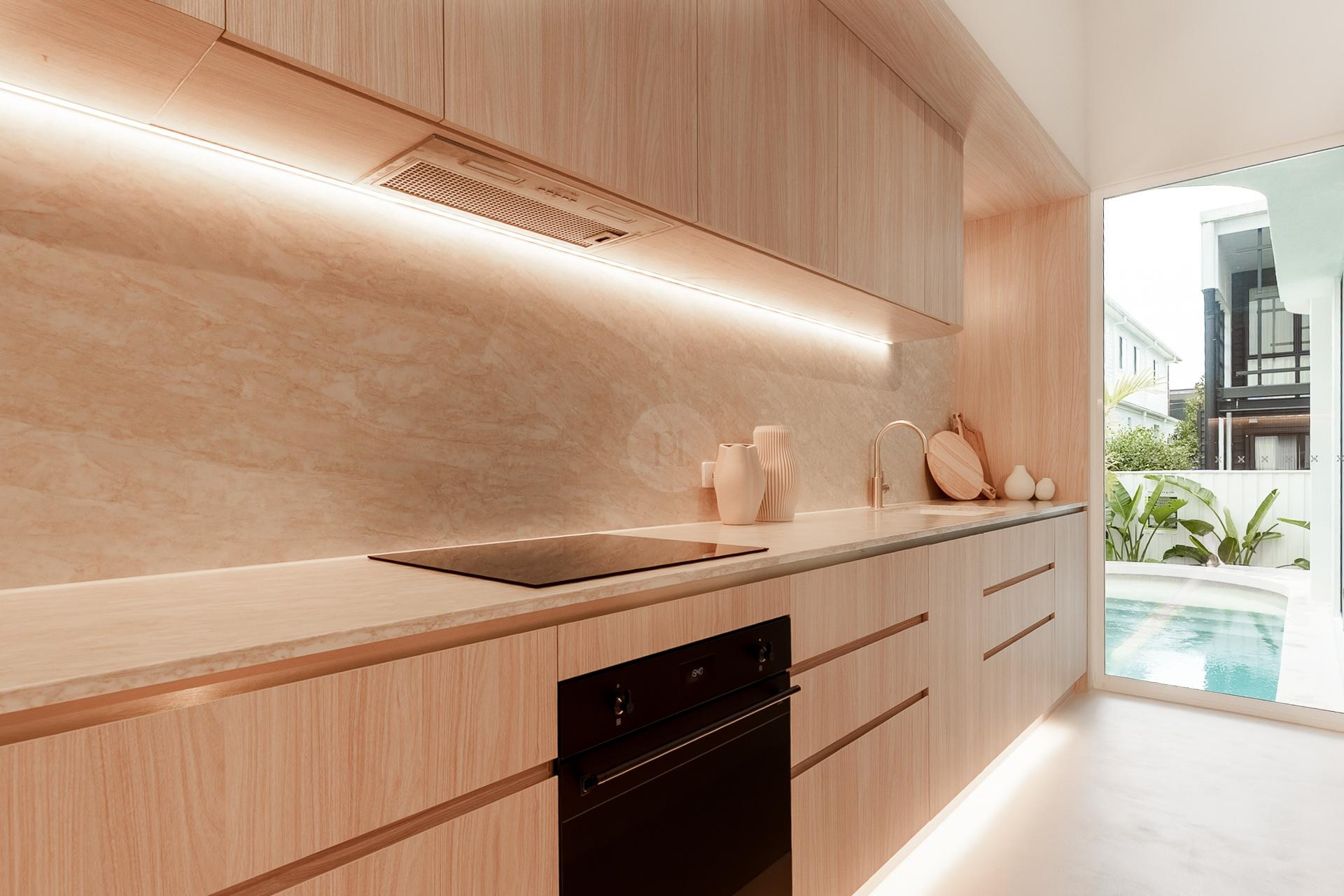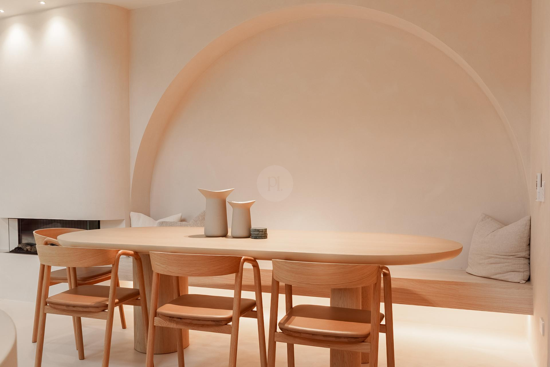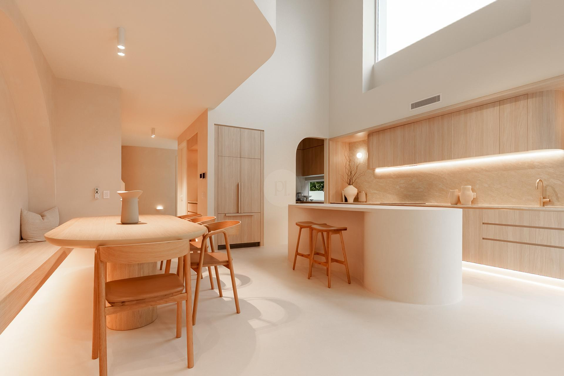 Boasting beautiful arches and curves that add character and charm, the modern kitchen fitted with gorgeous stone bench tops and an intentional lighting design to enhances its aesthetic appeal. The alfresco area frames an arched plunge pool, surrounded by micro cement, offering a versatile space to showcase your products.
