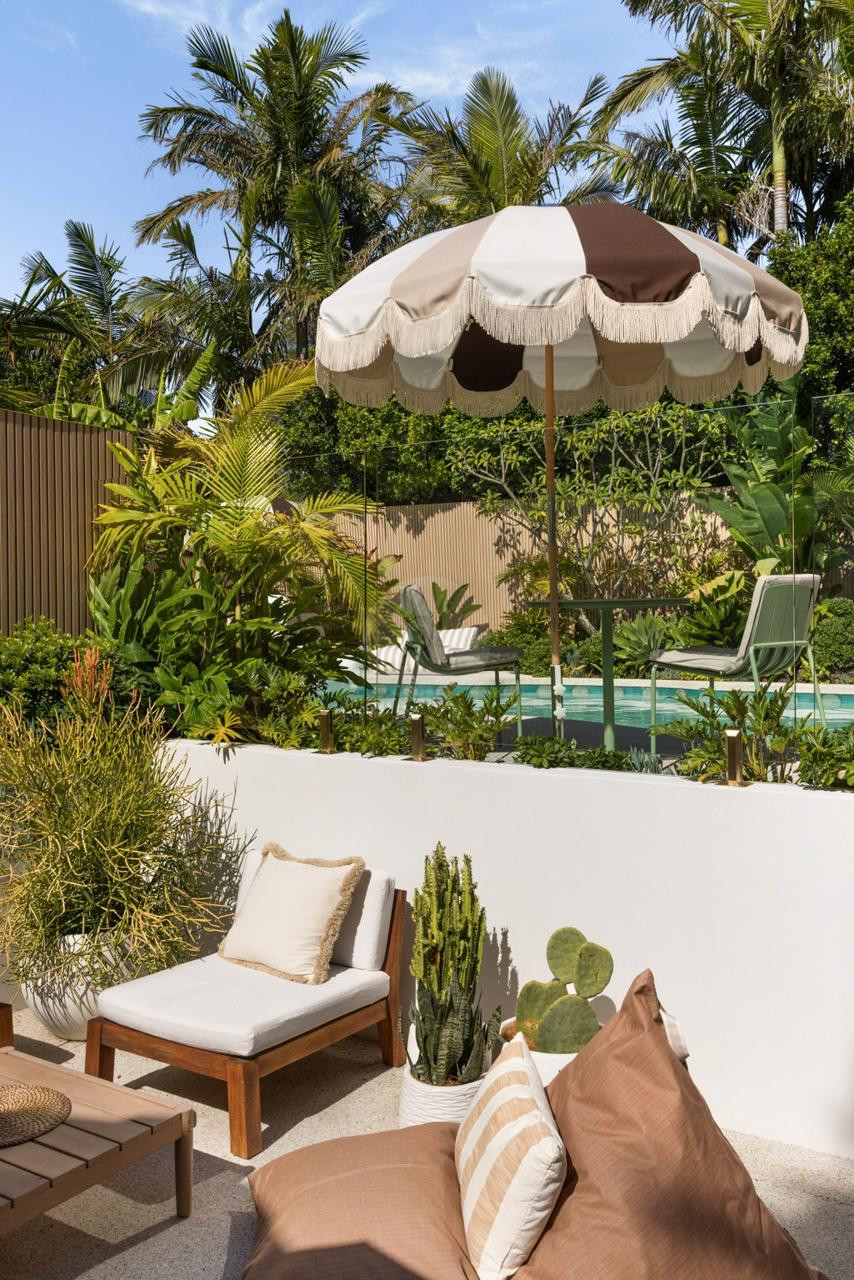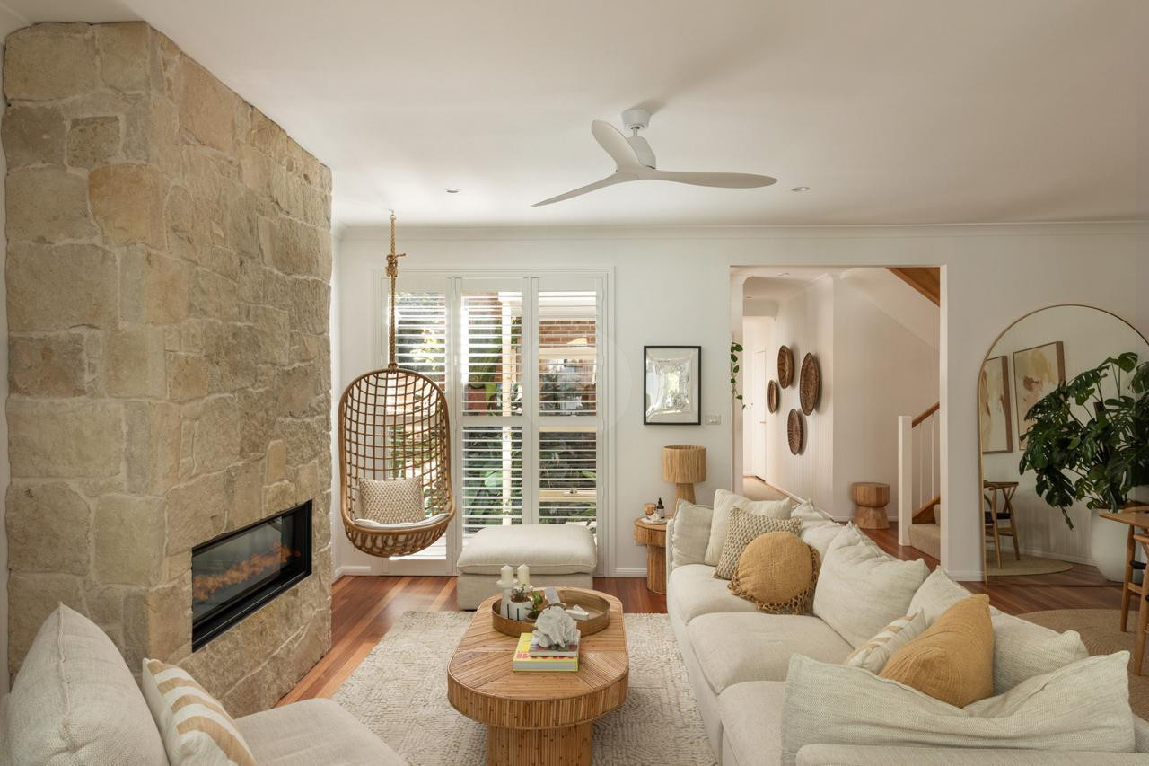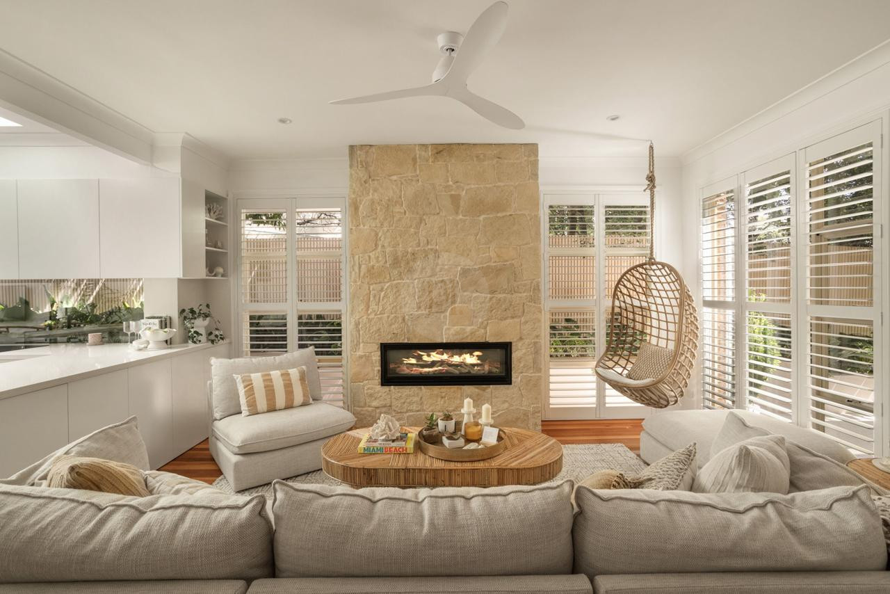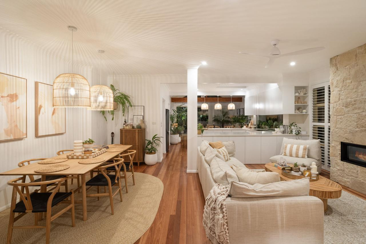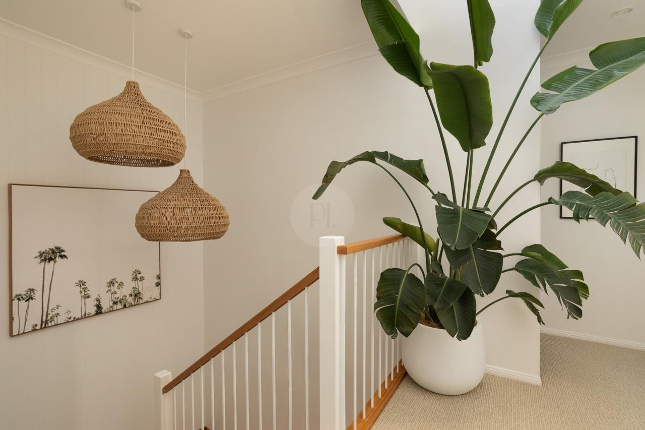This double-storey home features a harmonious mix of tropical landscaping and modern elegance. Soft neutral interiors and textures, and seamless indoor-outdoor living create a boutique villa atmosphere. Palm trees frame the sparkling pool, while a stone feature fireplace and warm timber floors add sophisticated charm.