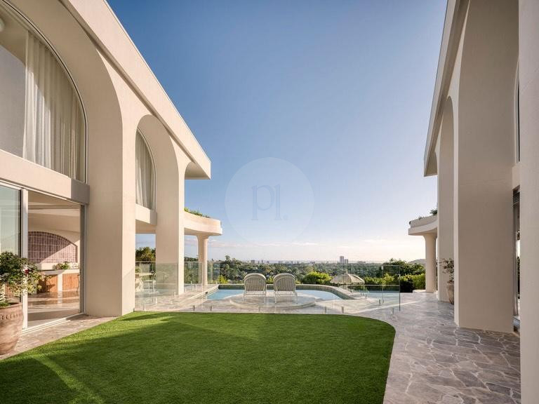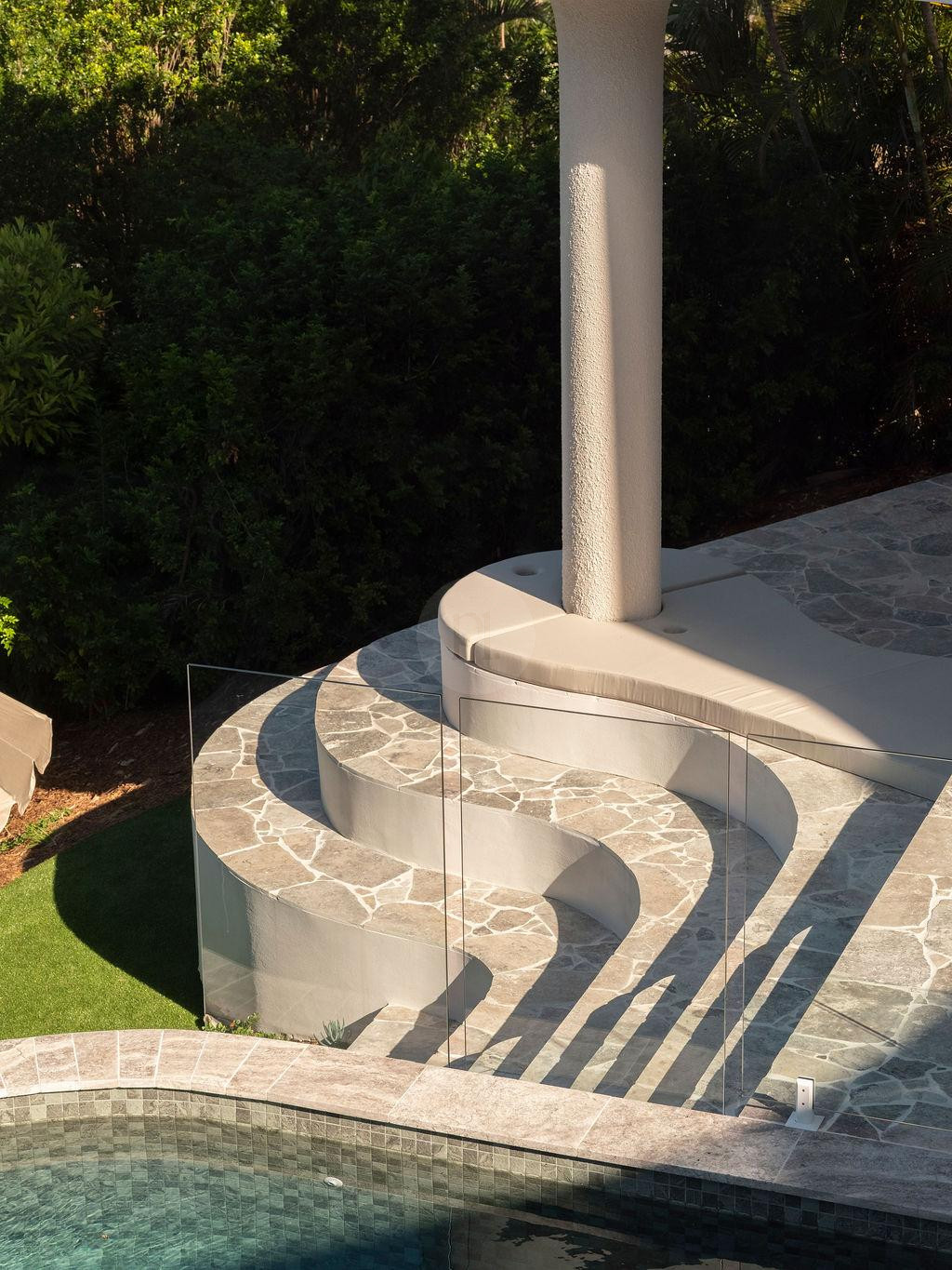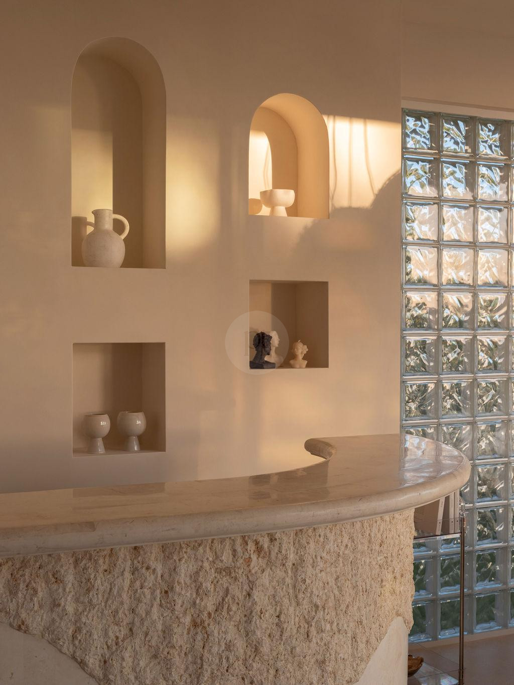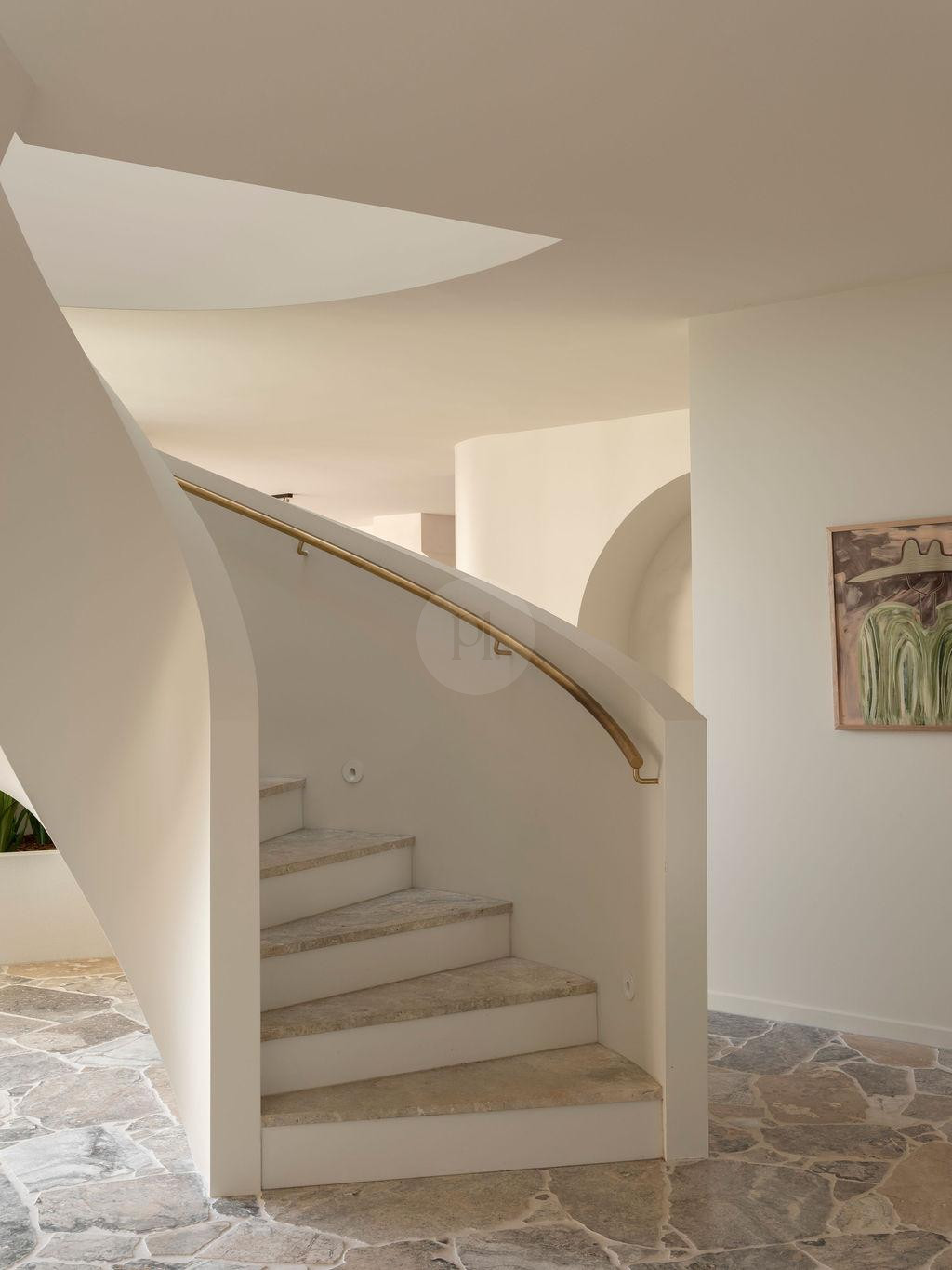 The sweeping curved staircase provides a striking architectural centrepiece, ideal for dynamic compositions and movement-based filming. Upstairs, richly veined green and red marble bathrooms and intricate mosaic detailing introduce a Mediterranean-meets-modern aesthetic, offering multiple luxe vignettes within one cohesive setting.