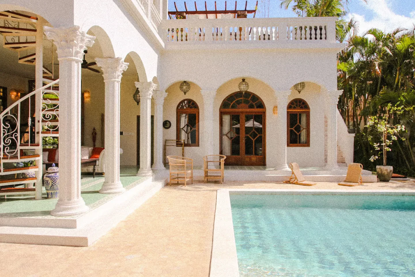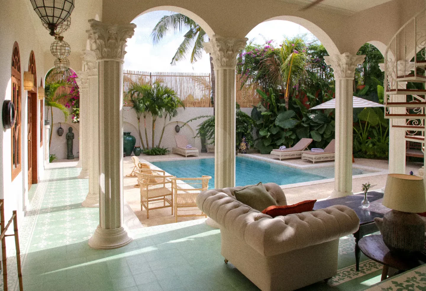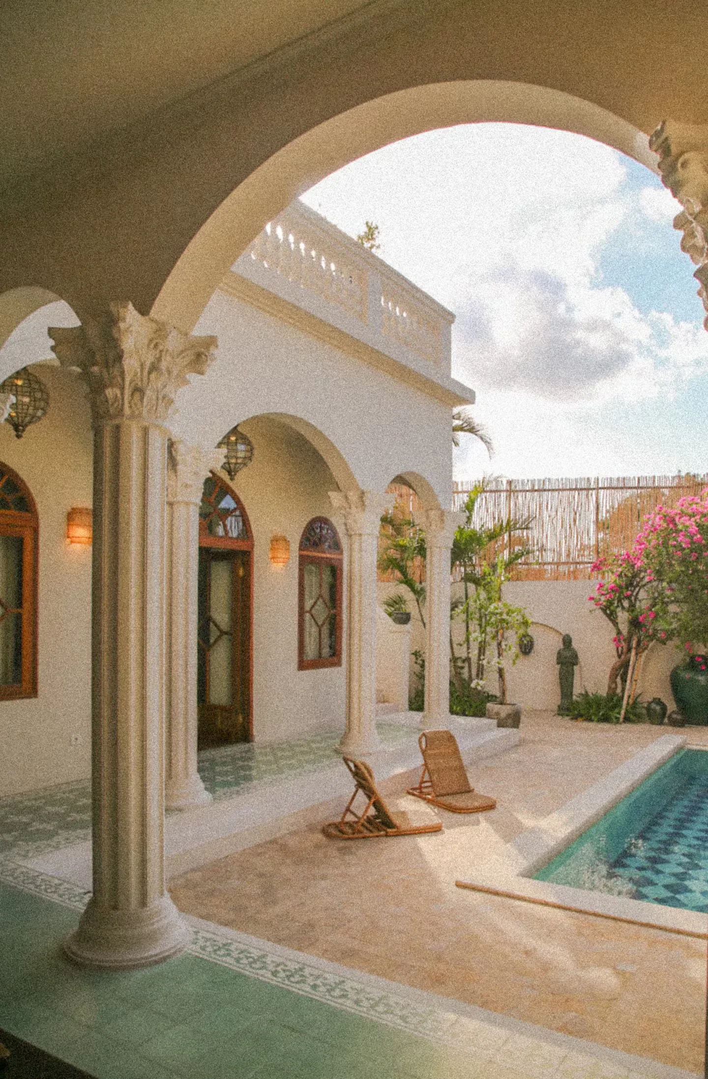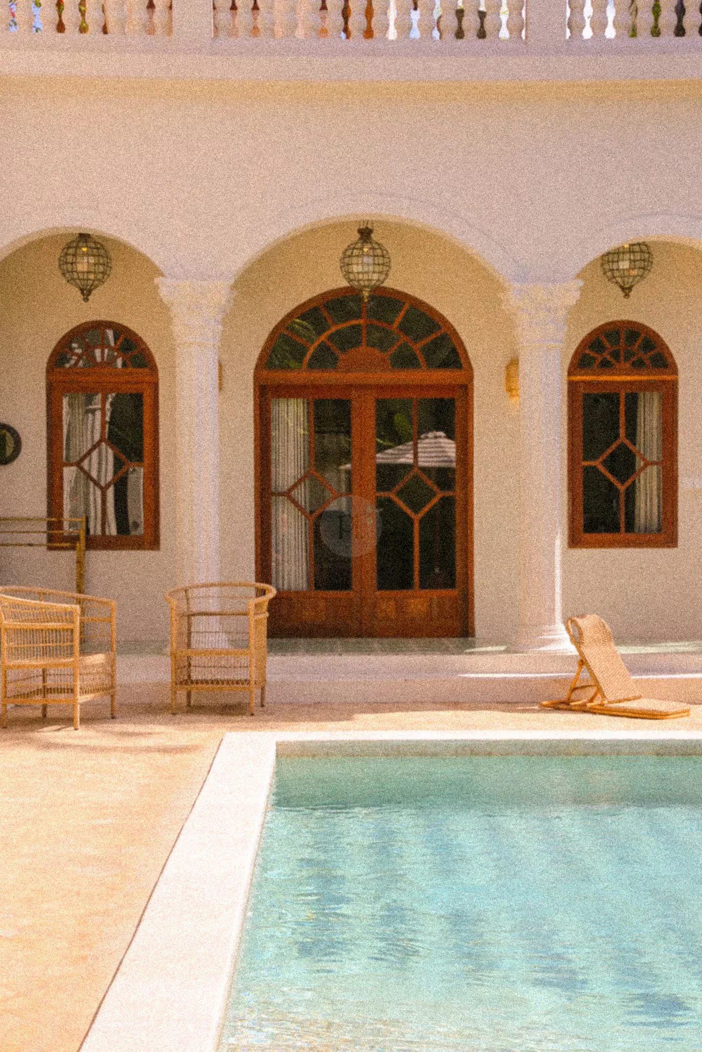 Step outside to find a beautifully designed courtyard and outdoor living area that seamlessly blends with the lush surroundings. The pool area is a true highlight, providing a refreshing escape and a stunning visual element for your shoots. The elegant arches and charming balcony offer unique perspectives, ensuring that every angle is picture-perfect.
