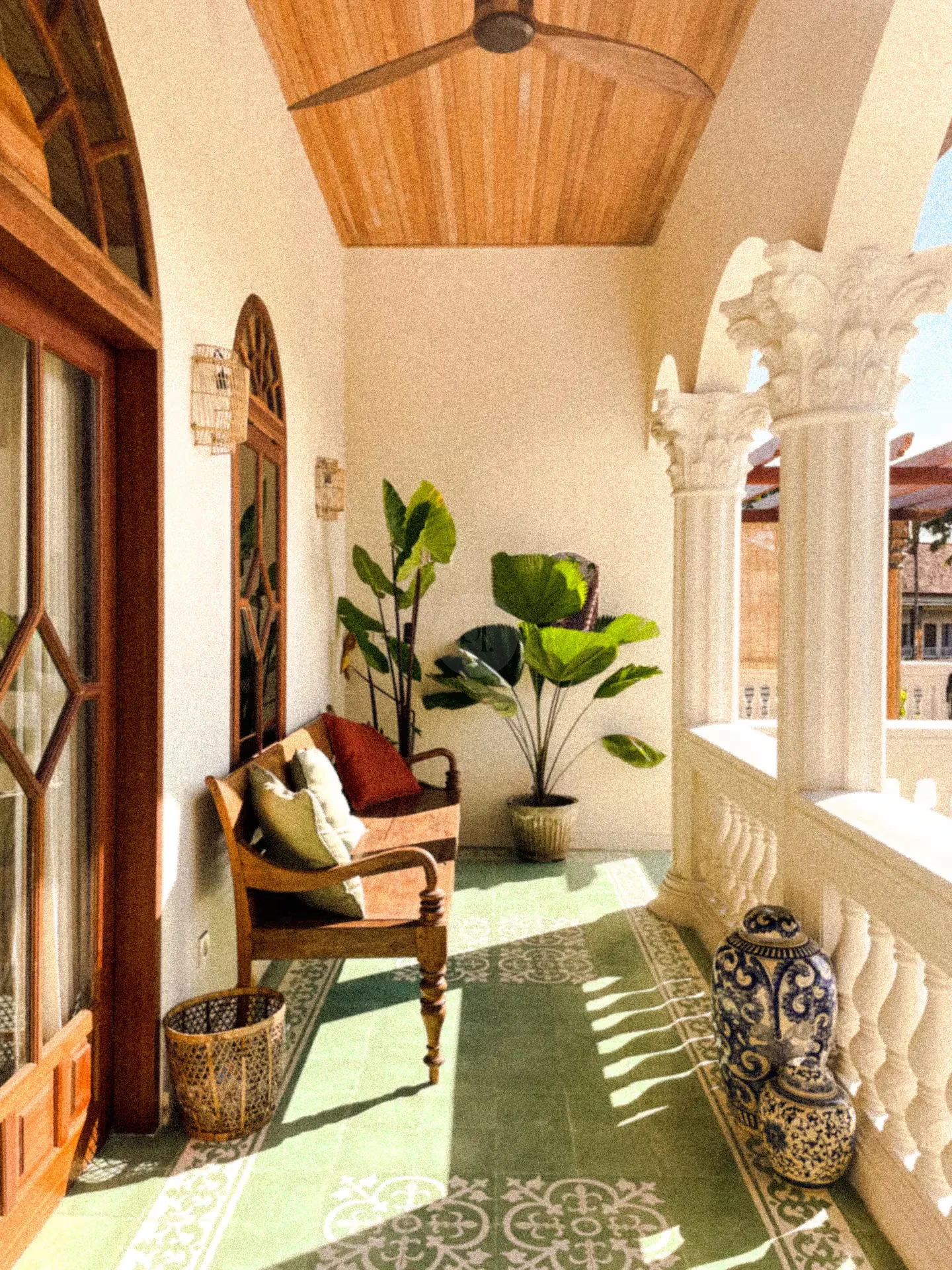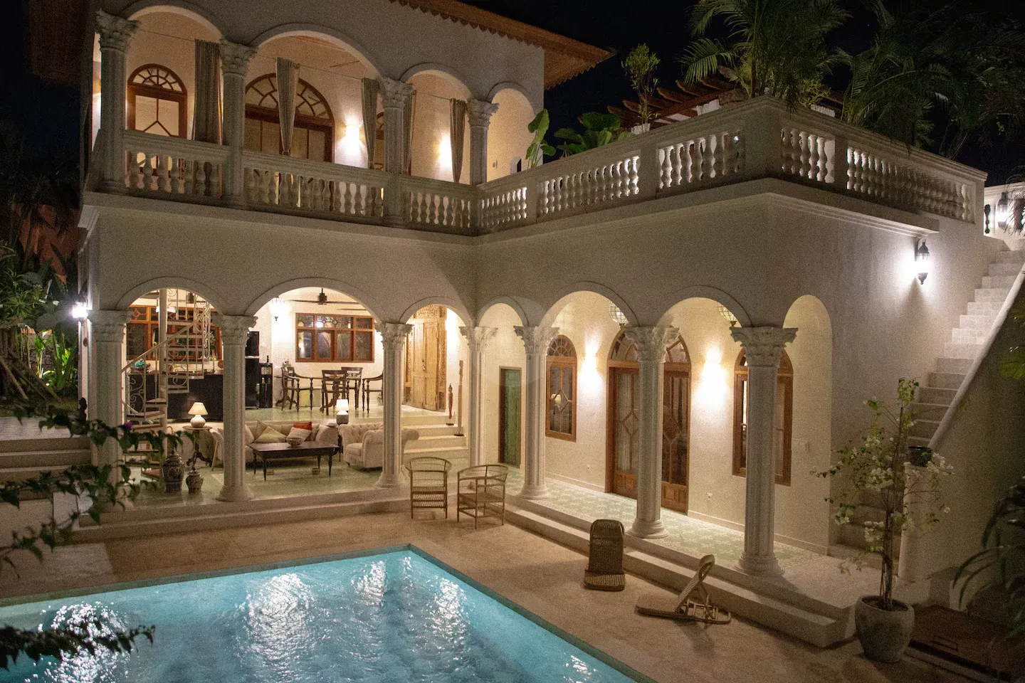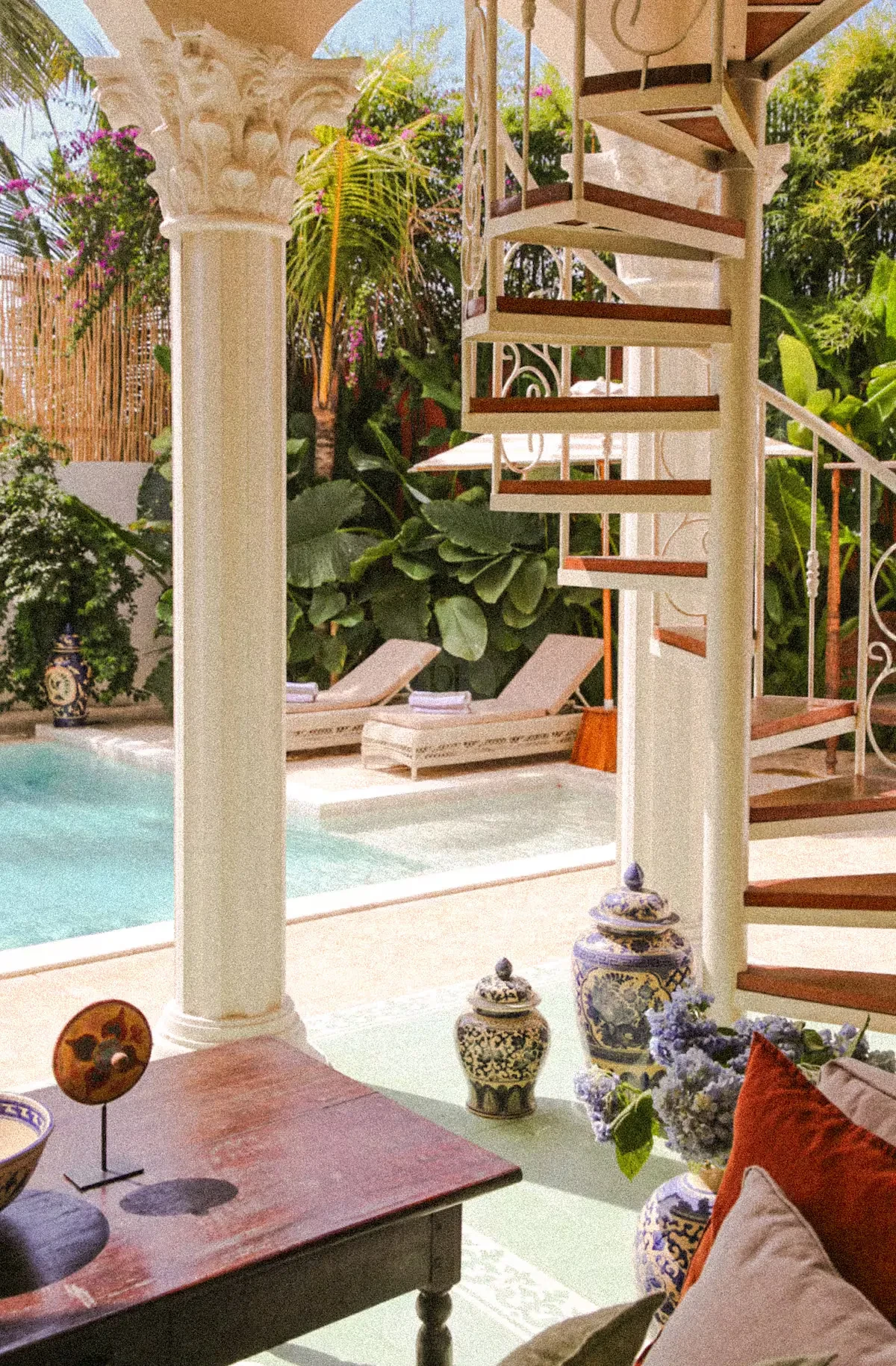 Step outside to find a beautifully designed courtyard and outdoor living area that seamlessly blends with the lush surroundings. The pool area is a true highlight, providing a refreshing escape and a stunning visual element for your shoots. The elegant arches and charming balcony offer unique perspectives, ensuring that every angle is picture-perfect.