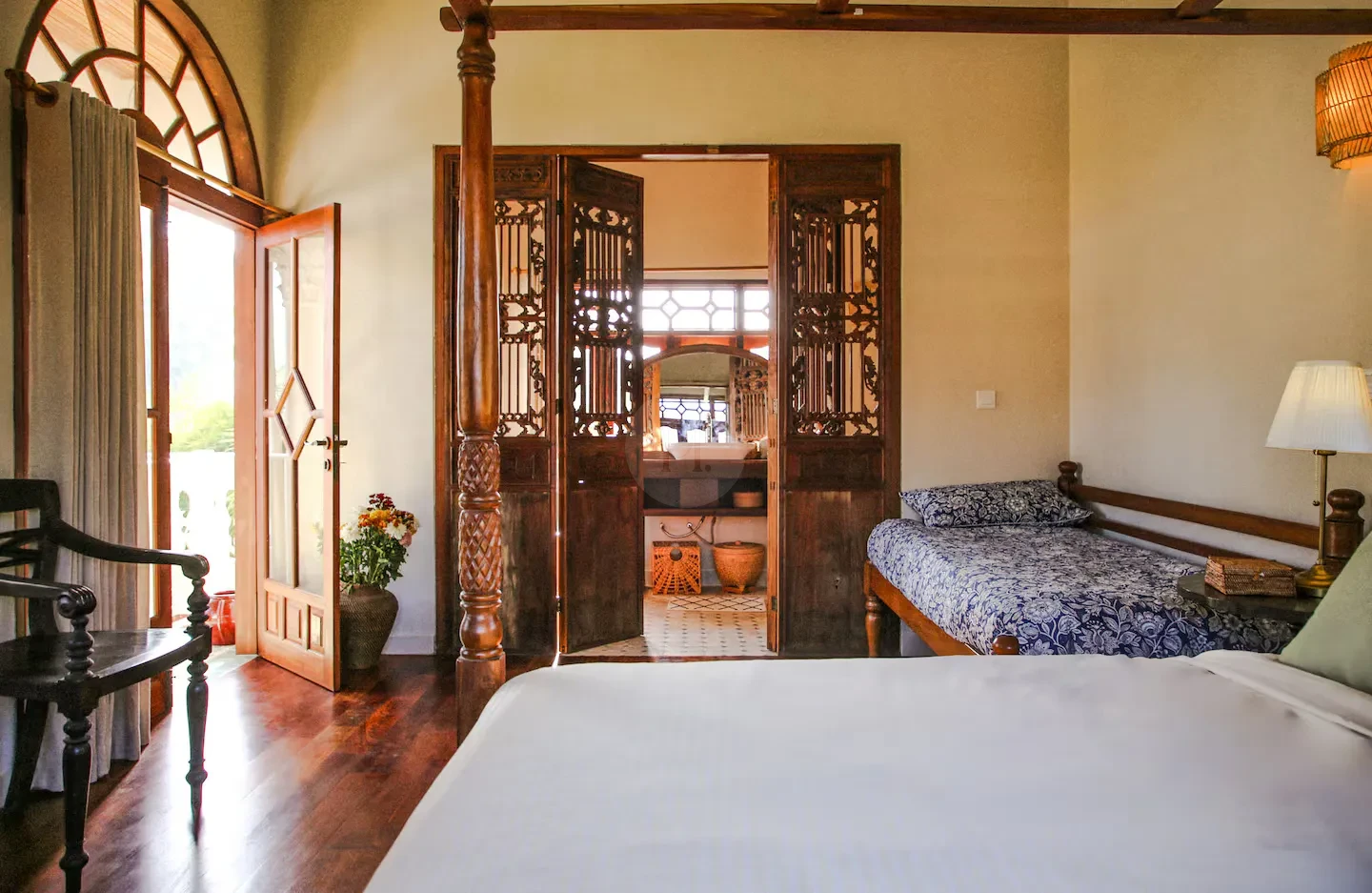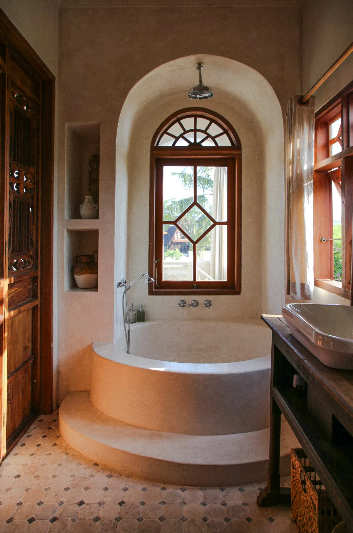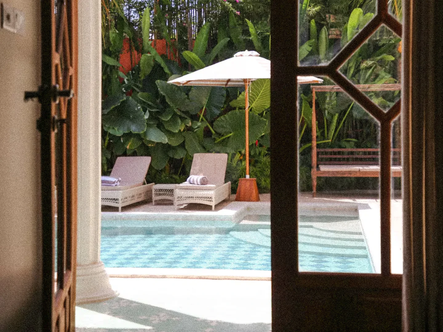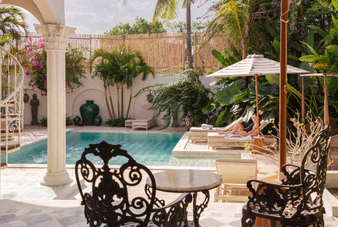 Step outside to find a beautifully designed courtyard and outdoor living area that seamlessly blends with the lush surroundings. The pool area is a true highlight, providing a refreshing escape and a stunning visual element for your shoots. The elegant arches and charming balcony offer unique perspectives, ensuring that every angle is picture-perfect.